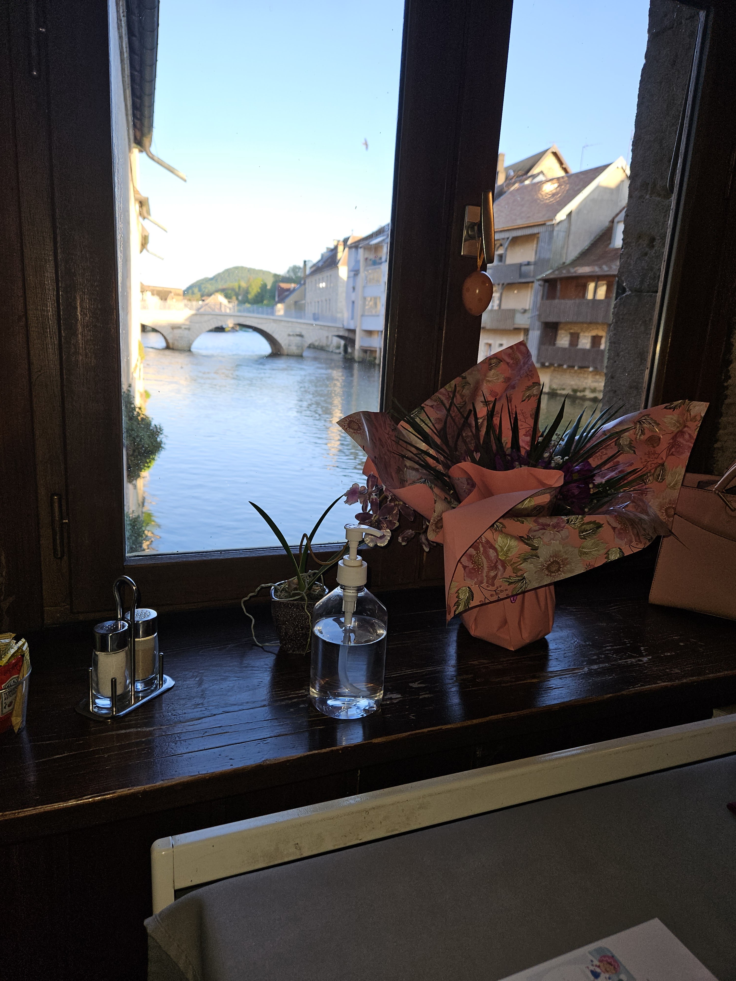 Très peu de Restaurants ouverts le Dimanche soir à Ornans en ce week-end de Pentecôte, heureusement que nous avions réservés, très très bien placés dans la petite salle qui longe la splendide rivière La Loue, nous avons passés avec nos amis, un superbe moment avec une vue de carte postale. Un pêcheur à la mouche complétant le tableau. Une cuisine simple mais goûteuse ( filets de truites saumonées excellentes) et un service en salle avec notre aimable et gentille serveuse,( elle se reconnaîtra). Bravo à toute l'équipe de ce restaurant. Nous y retournerons c'est évident. A ne pas rater si vous séjournez à Ornans le temp d'un week-end 👌