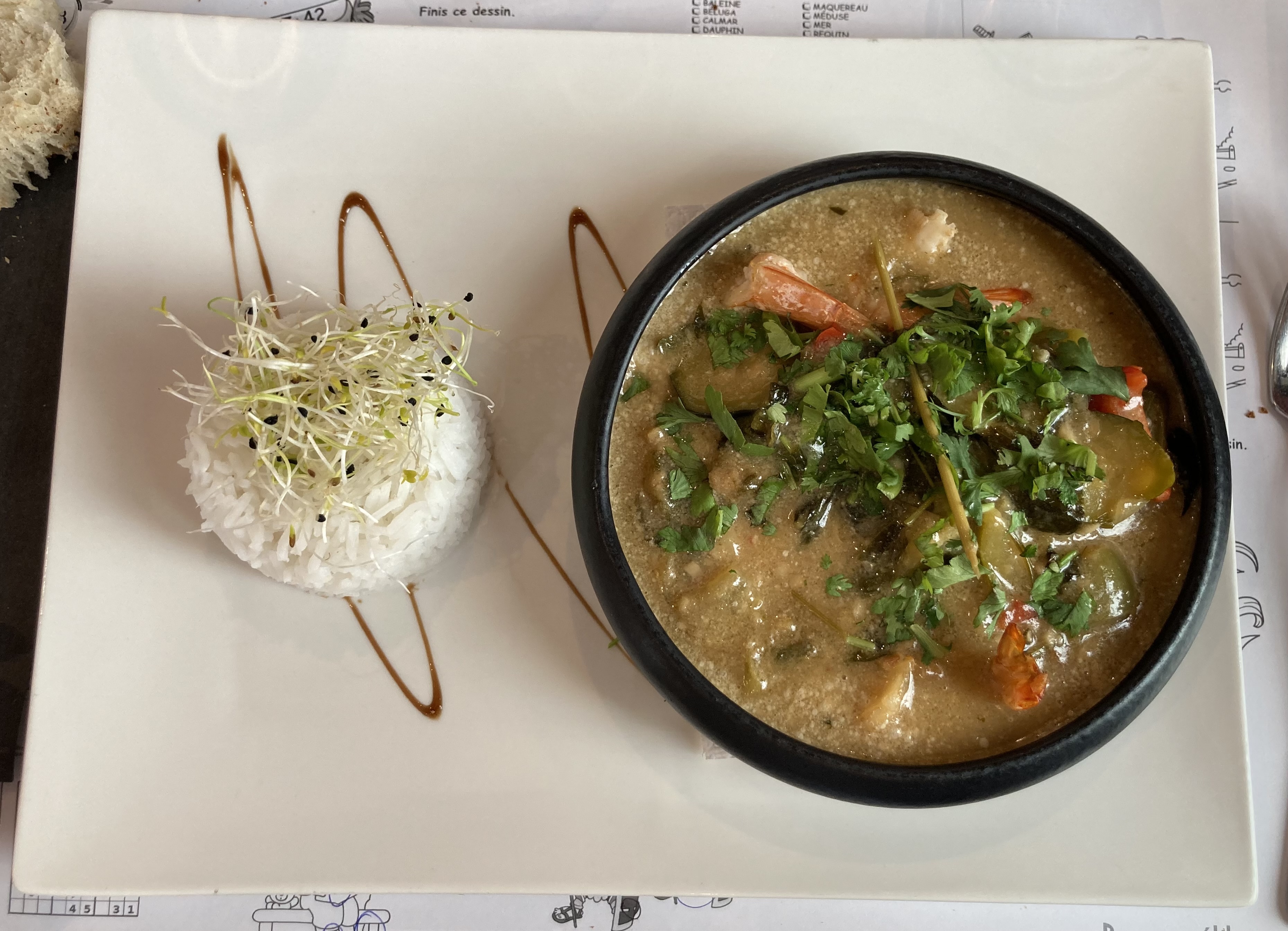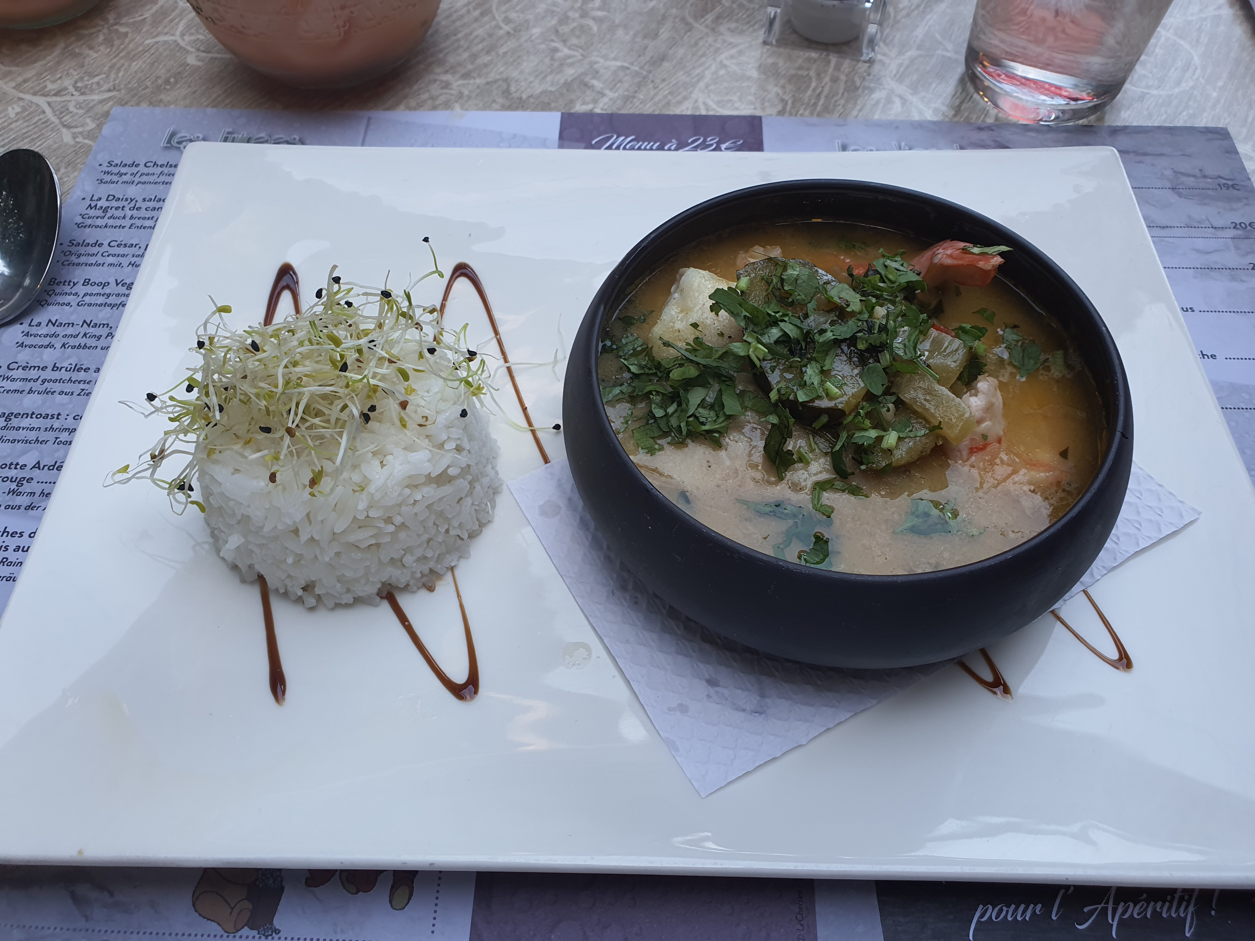 Une très jolie adresse, et de bons produits,. Nous avons dégusté une cassolette de poisson très bien préparé, façon asiatique , au lait de coco et très bien épicé . Le café gourmand est superbe également. Le personnel est très agréable . Une adresse à recommander .