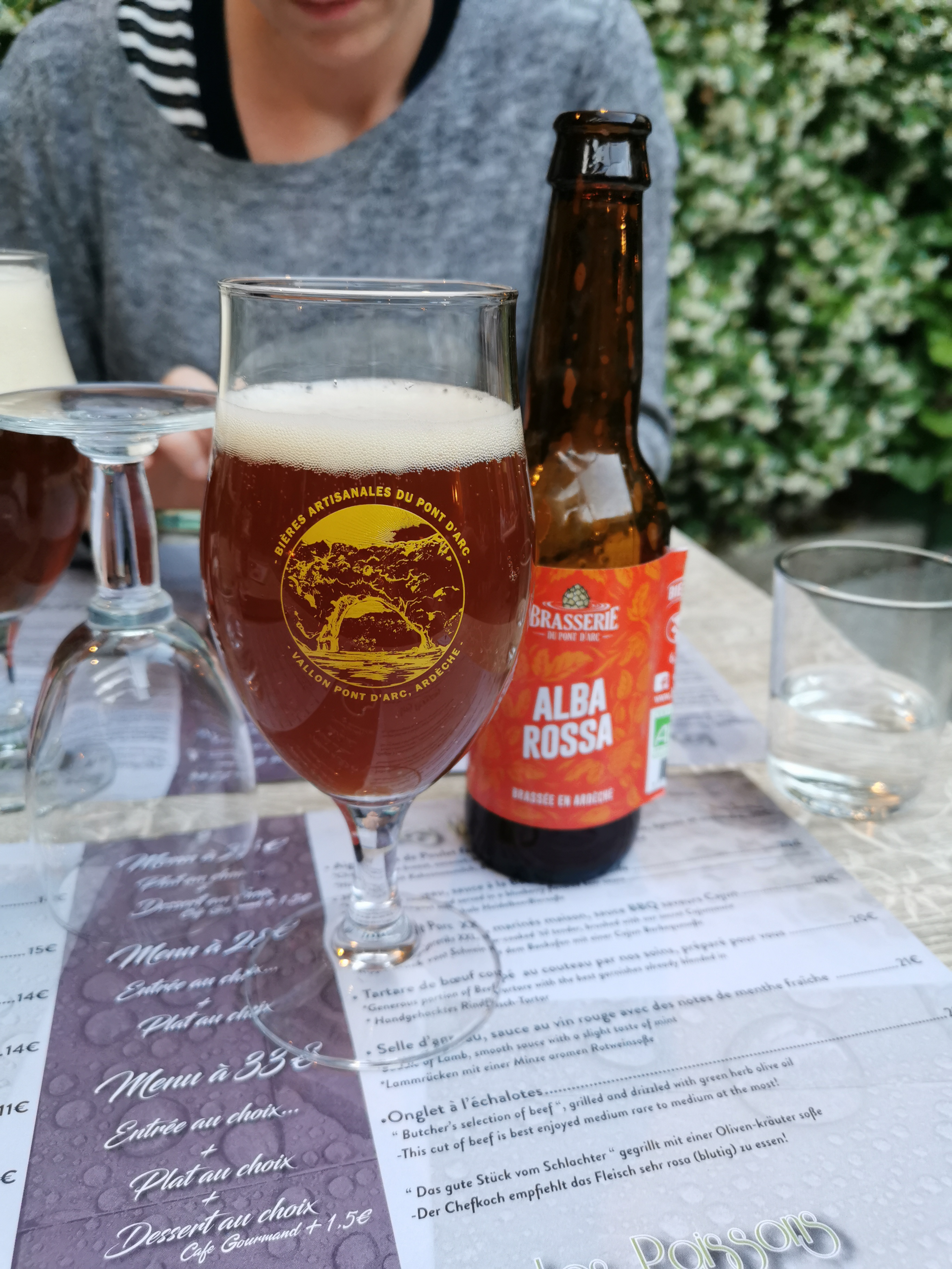 Ce restaurant mérite clairement un classement de 5 étoiles. C'est juste au coin de la rue principale de Vallon Pont d'Arc. Après avoir fait une réservation, nécessaire les soirées d'été, nous avons été chaleureusement accueillis par l'équipage sympathique. Assis sur la terrasse couverte de feuilles, nous avons pu découvrir la carte variée. Le menu propose tout ce dont il a besoin, du poisson, de la viande et des choix végétariens. Nous vous conseillons le menu à 31 € (entrée, plat & dessert), qui vous laisse libre choix du menu à la carte. L'équipage parle bien anglais et français mais aussi un peu allemand et est très sympathique. Ça vaut vraiment le détour lorsque vous êtes dans le quartier. Nous n'avons trouvé aucun point négatif. Nous avons payé 140 € pour 4 personnes, ce qui n'est pas trop cher.
