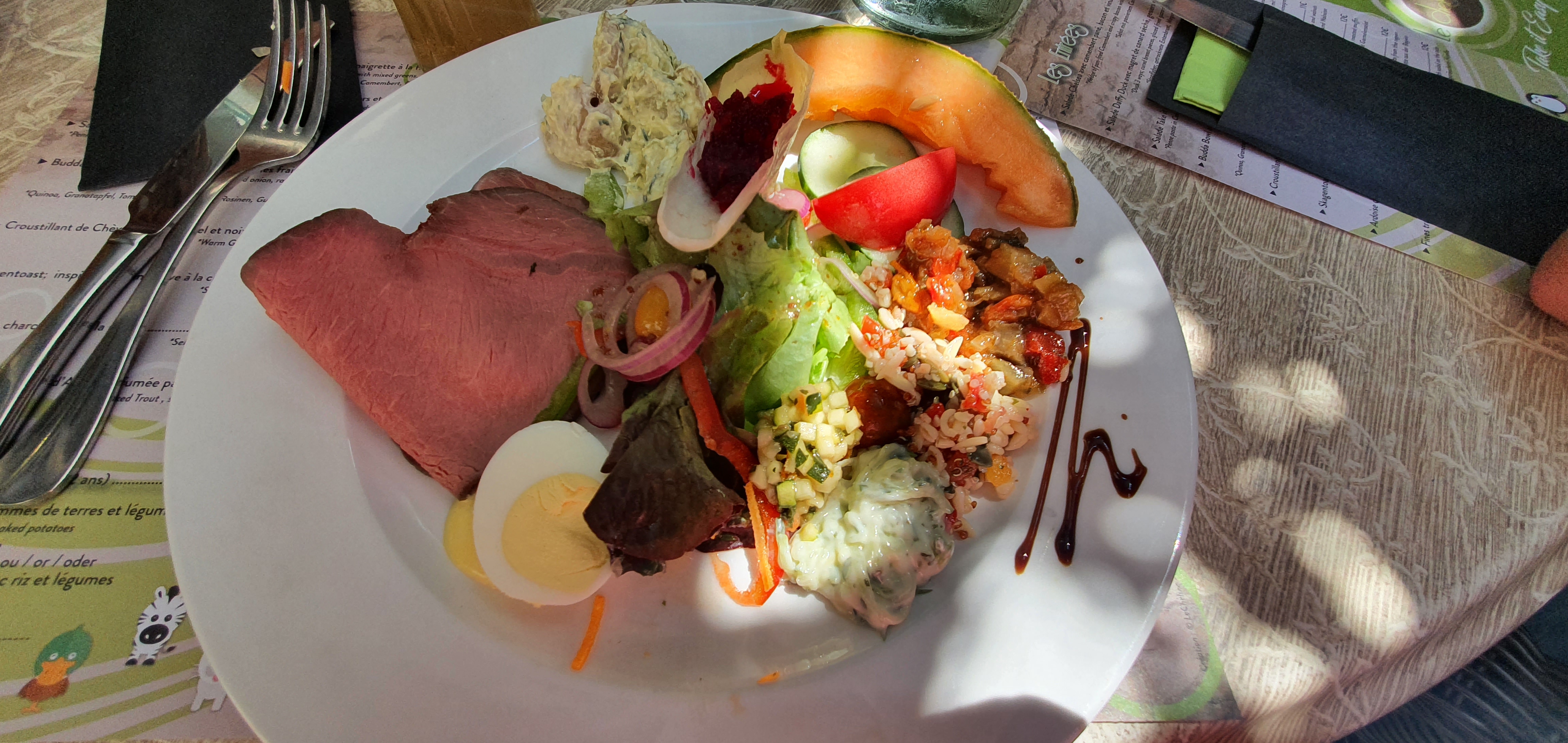 Nous y avons très bien mangé avec une assiette fraîcheur goûteuse et parfaite par temps chaud. La cadre est vraiment très agréable. Le choix végétarien est vraiment minime. On vous propose de vous préparer une assiette végétarienne mais comme d’habitude on ne sait ni ce qu’elle contient exactement, ni combien elle sera facturée. Être végétarien c’est aussi apprendre à manger des assiettes surprise à prix surprise ... C’est dommage car les végétariens sont de plus en plus nombreux et ils ont aussi le droit de savoir ce qu’ils vont manger et à quel prix..