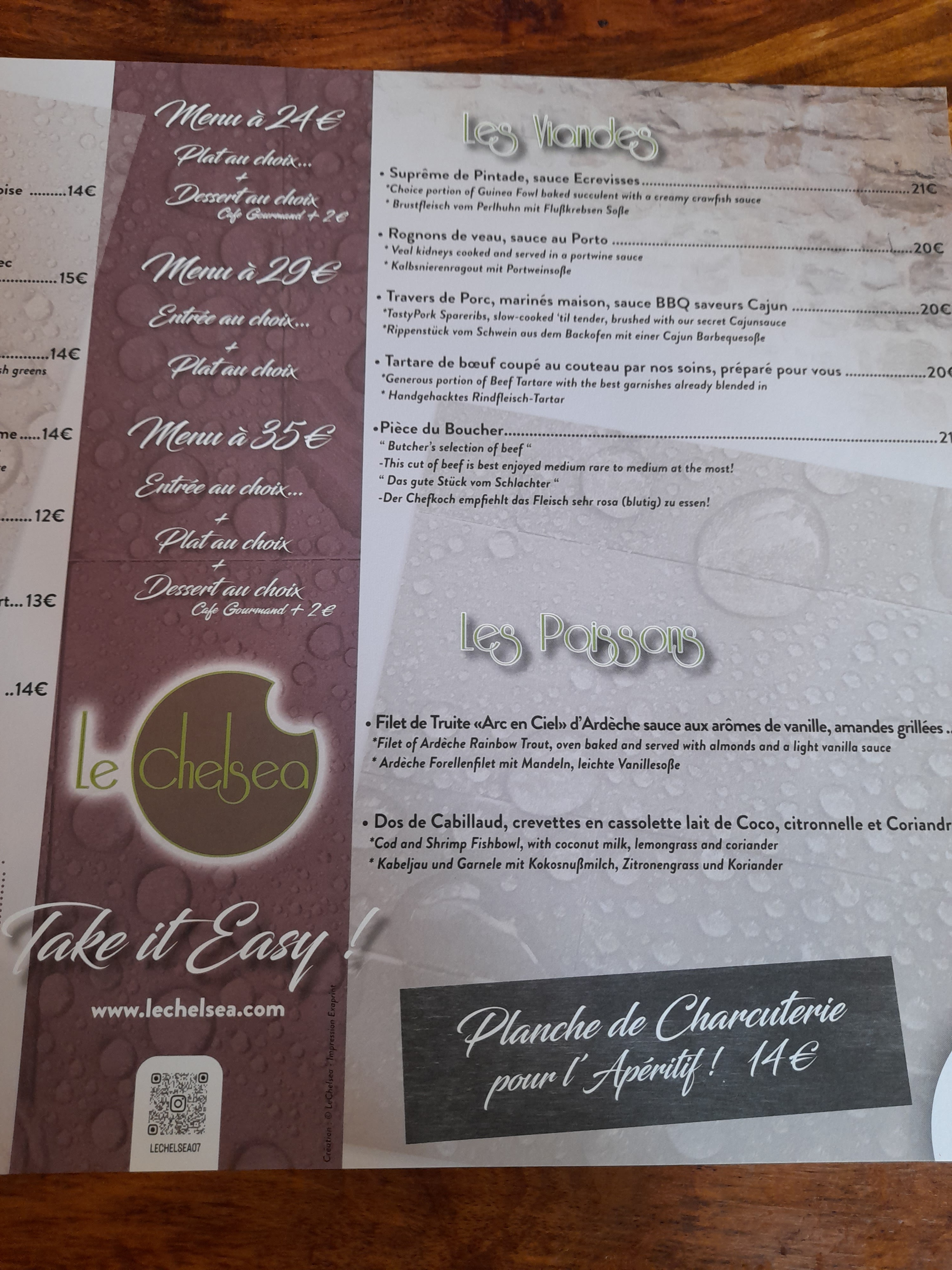 Chaque année, je passe des vacances en Ardèche et chaque année je visite le restaurant Le Chelsea. C'est mon préféré. Tout d'abord à cause de la nourriture absolument délicieuse et bien servie. Je n'ai jamais été déçu. J'aime aussi le service et l'ambiance, tant à l'intérieur qu'à l'extérieur. Il y a beaucoup d'autres restaurants dans les environs, la plupart servant des plats habituels, mais celui-ci est spécial.