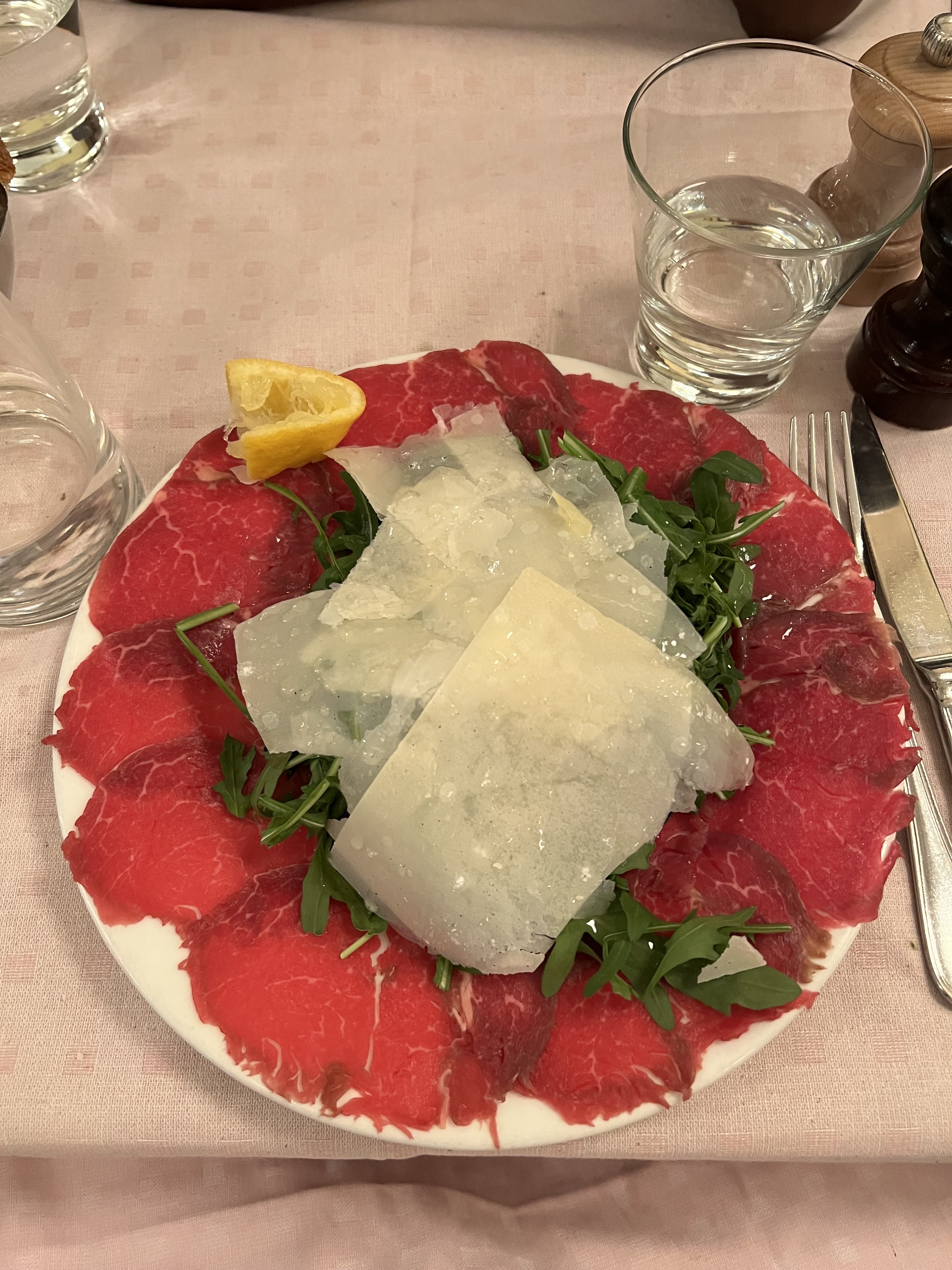 Restaurant un peu cher pour du bressaola et du carpaccio sans assaisonnement. Produits de qualite sans aucun doute pourtant. Par contre service sans respect. Il y a une Interdiction de fumer meme en terrasse avec affiche, un de nos voisins a allume cigarette sur cigarette sans aucun egard pour les autres. Quand j'ai demande gentiment au serveur d'intervenir il m'a dit qu'il ne pouvait pas malgre l'interdiction. Je pense que le monsieur en question etant un habitue il fallait le menager. Total nous ne deviendrons pas des habitues, il n'y a pas eu de pourboire et pourtant nous sommes d'ordinaire genereux et nous avons prefere aller prendre notre dessert et nos cafes dans un endroit plus accueillant. Dommage.