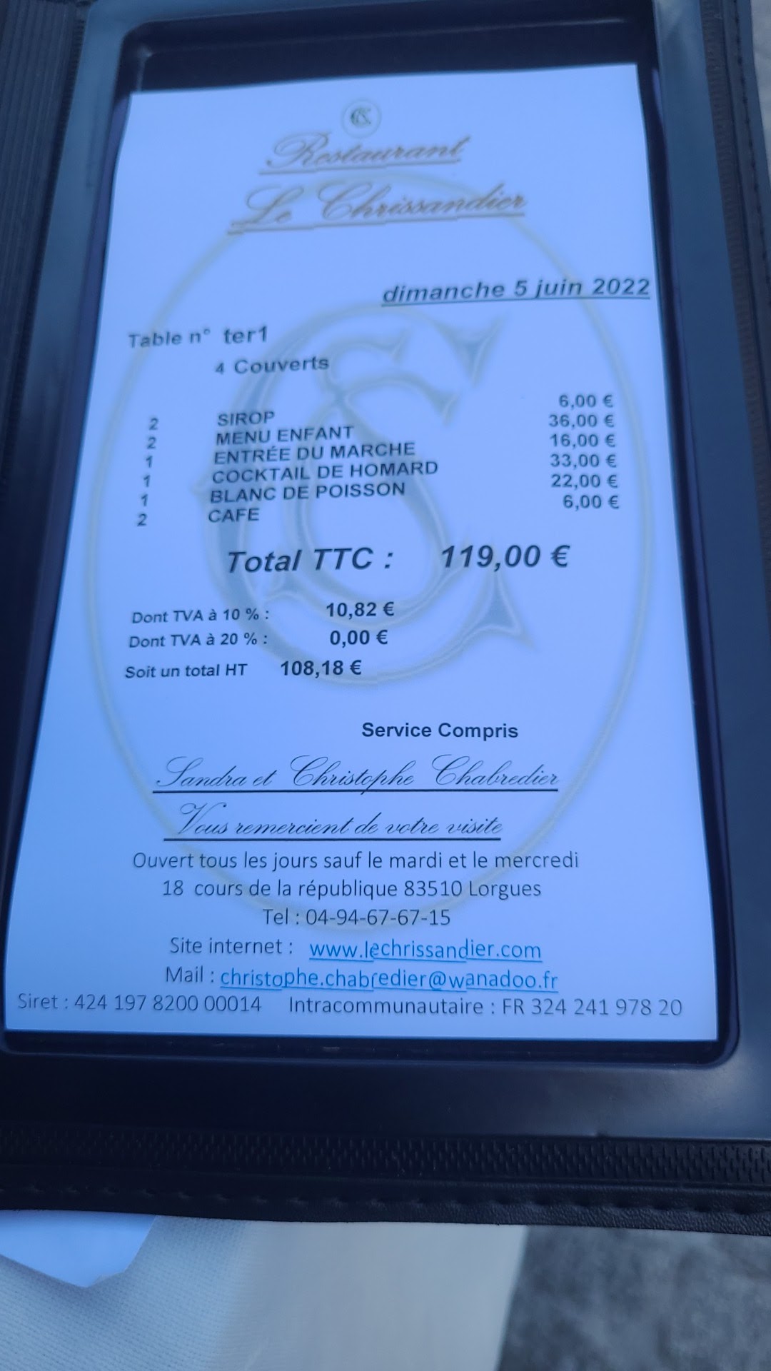 Notre restaurant préféré à Lorgues. Bien qu'il existe également d'autres bons restaurants dans ce village, Le Chrissandier Christophe est toujours le meilleur. Le repas de trois plats à 30 euros représente un excellent rapport qualité-prix et la cuisine est délicieuse. Le chef réalise un repas parfait d'excellente qualité.