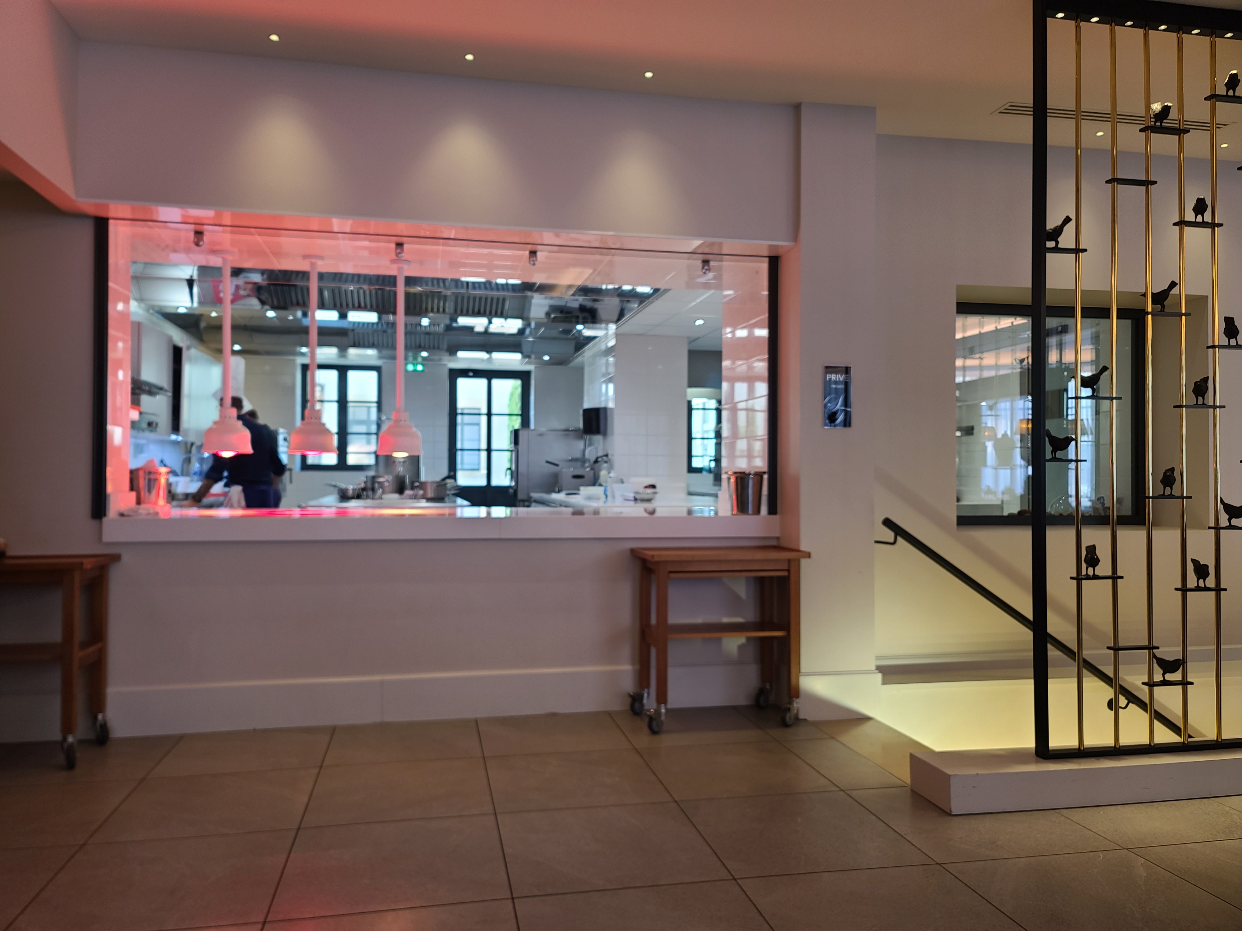 Très bon restaurant, personnel très professionnel ,attentif et souriant.Ambiance chaleureuse et décoration soignée. Le plus : voir en direct le chef et son équipe cuisinées !