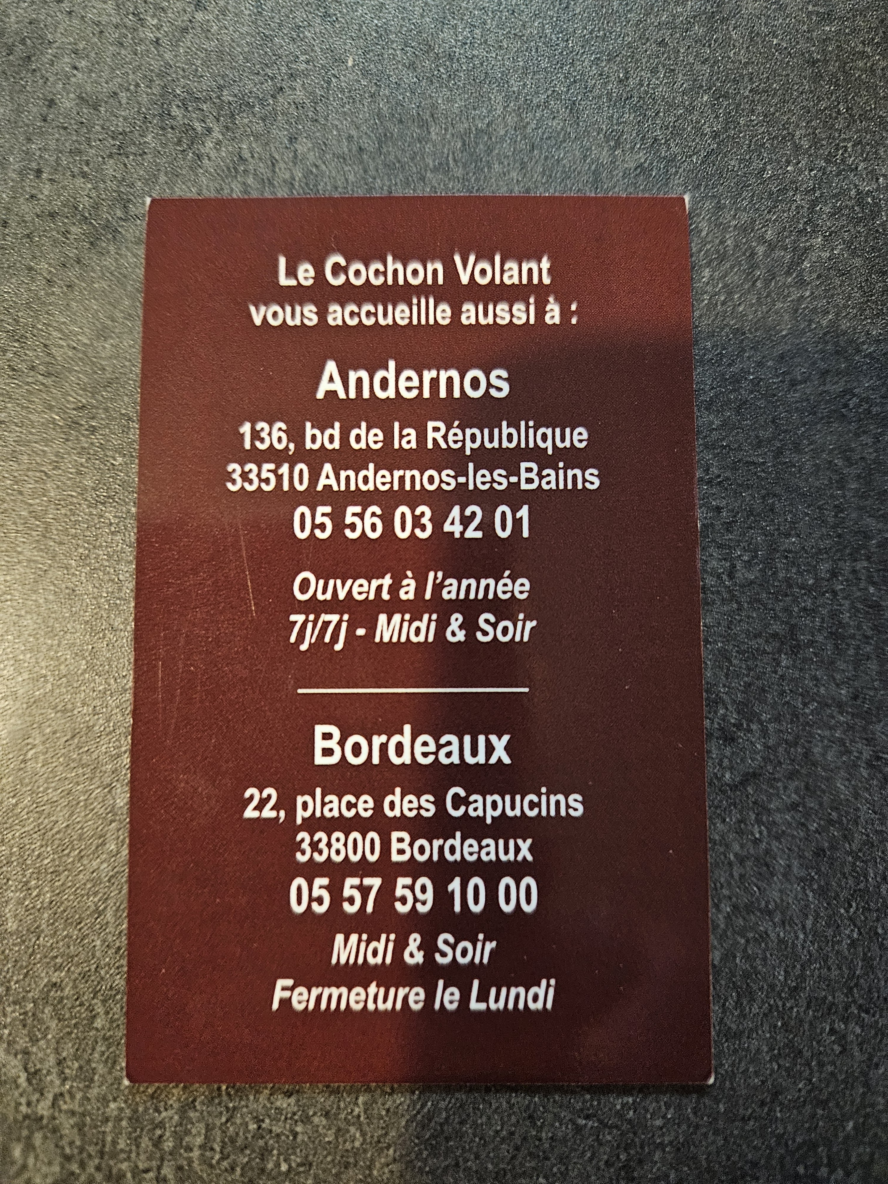 Eh bien non, il n'y a pas que des kébabs à Langon, il y a aussi Le Cochon Volant, Bacchus soit loué ! De passage à Langon, très bon dîner, service plus que sympa et très bons conseils : l'axoa de veau et le vin rouge, excellents !