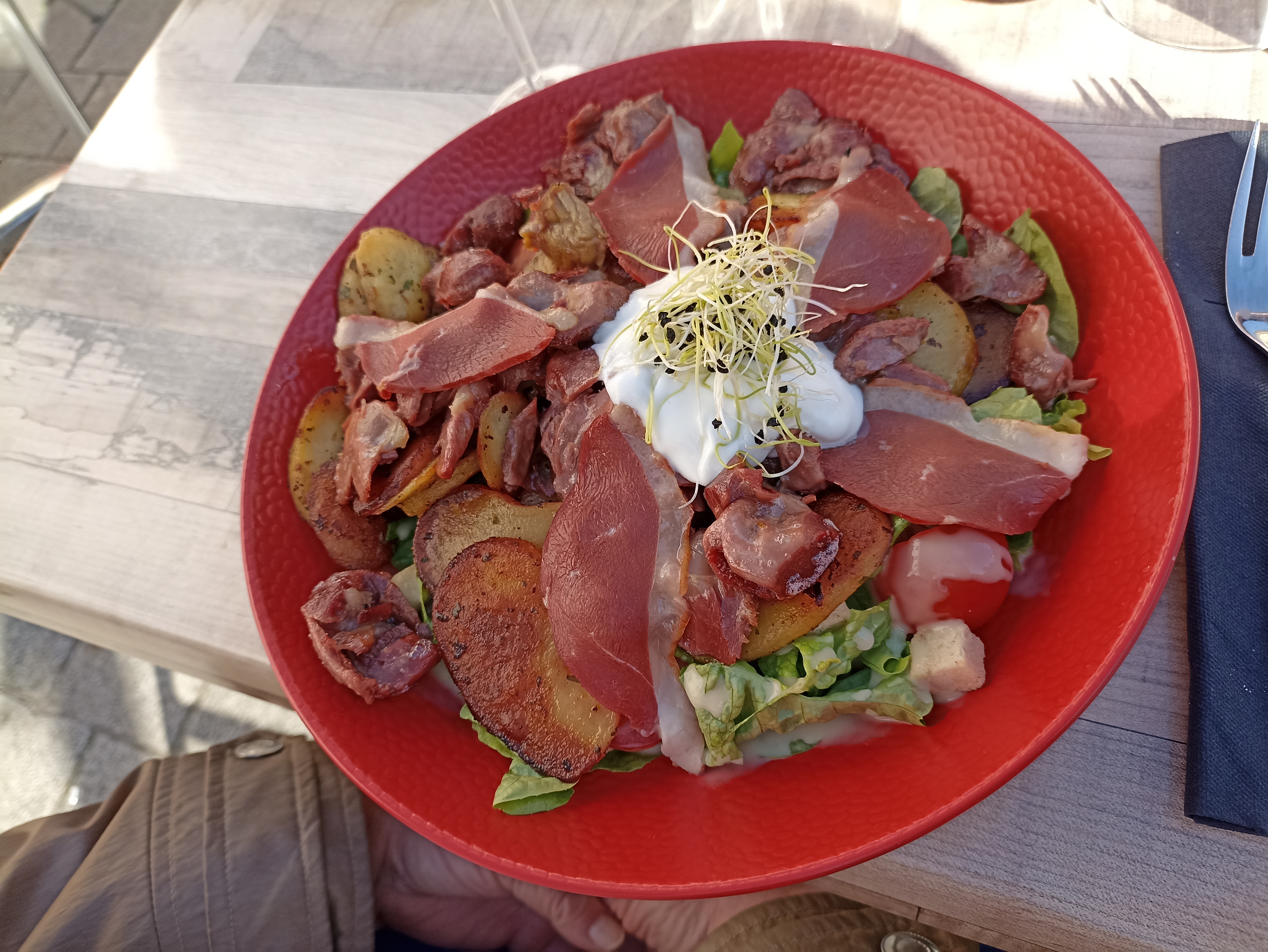 Le personnel très accueillant et avenant. L’emplacement sympa, Concernant le repas, la Flam est légère, croustillante et bien garnie, les salades que nous avions n’étaient pas extra, tant en quantité qu’en qualité, la vinaigrette qui aurait pu apporter un plus, à , ajoutée un trait de déception. Niveau Burger, le « Gourmand » outre la portion qui est au top pour une grosse faim, gustativement je ne l’ai pas trouvé au rendez vous.(un ajout de salade, de tomate fraîche, de concombre, de pickles et d’une sauce sucrée salée légèrement acidulée pourrait apporter une touche de fraîcheur et de gourmandise). Niveau dessert, rien à redire les gaufres sont excellentes, les coupes glacées également. Bonne continuation