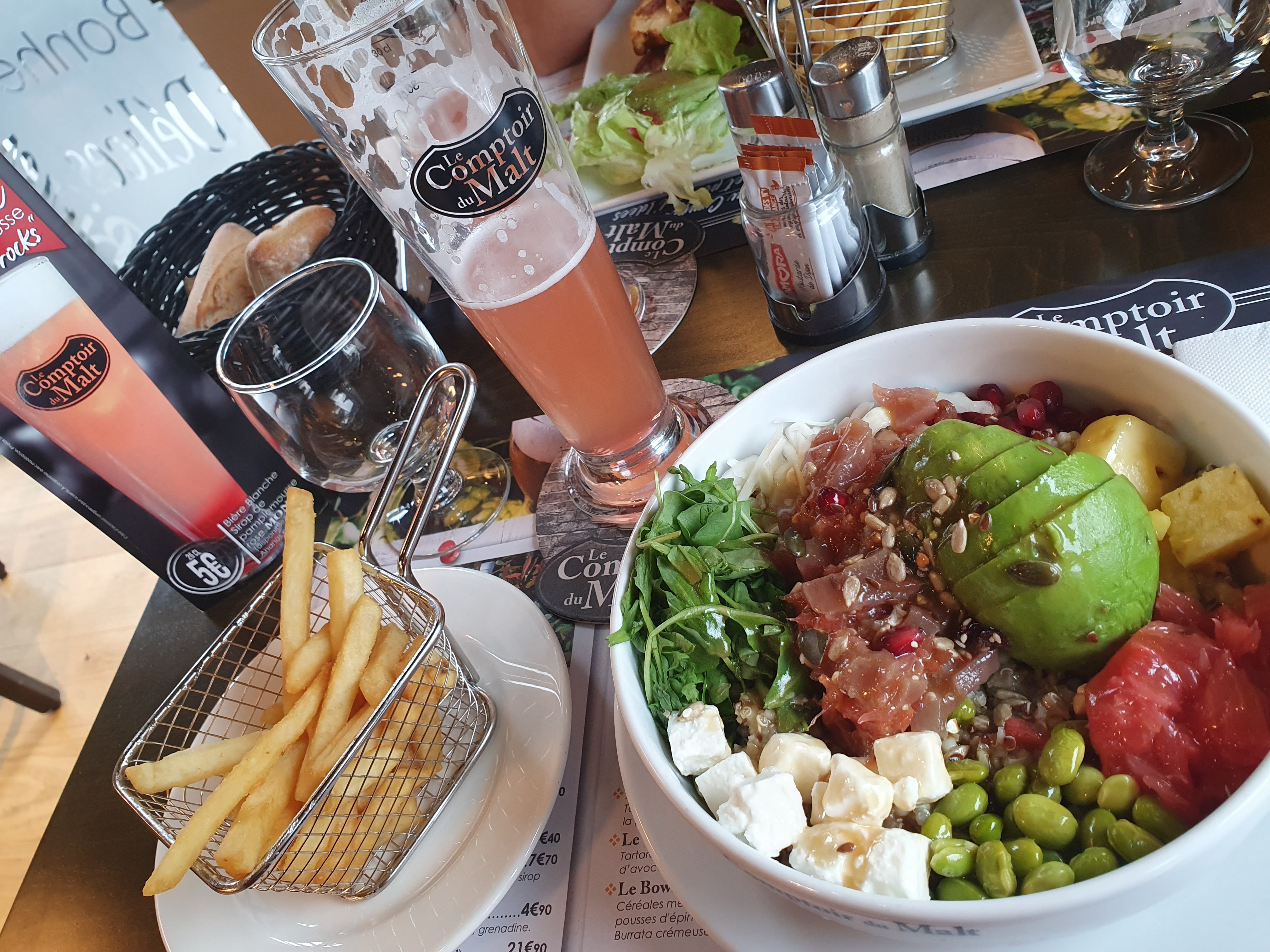 2 expériences décevantes, plusieurs plats ou boissons sont sur la carte mais quand on passe la commande, ce n’est pas disponible ..une salade bowl servie sans aucun assaisonnement, les plats nous sont servis avec des accompagnements qui ne sont pas ceux que nous avons demandé et également sans assaisonnement. Le pompon est la salade de fruit servie avec juste de la pomme et de l ananas et lorsque nous faisons remarquer à la serveuse que ça ne ressemble vraiment pas à la photo appétissante de la carte (fraise banane kiwi pêche pomme ananas ..) elle nous dit qu’ils n’ont pas été livrés 😳 ça ne les a pas empêché de nous la servir dans cet état et de nous la facturer. Je n’aurais pas pris le temps de mettre ce commentaire si le manageur avec qui nous avons discuté en partant avait daigné nous écouter au lieu de faire semblant. Sinon les serveuses étaient sympa .. On nous a offert un café pour notre déception.. facture à 65E pour 2 🤷🏽♂️ Vraiment pas inoubliable…