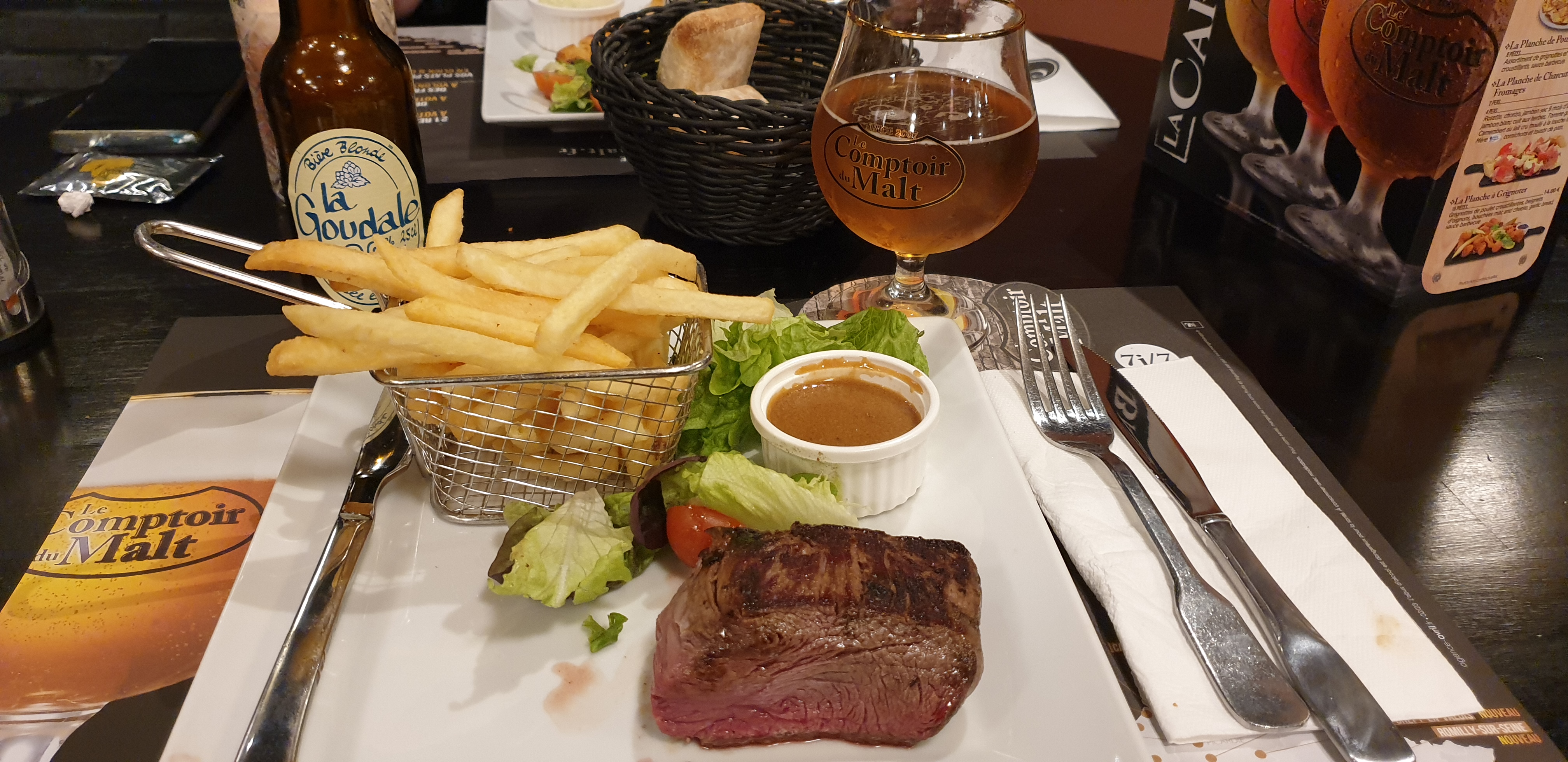 Sympathique la bière brune est bonne. J'ai manger l'andouillette à l'ancienne avec confit d'oignon et sauce moutarde une version que je ne connaissais pas. Très bonne bien cuite essayer là.