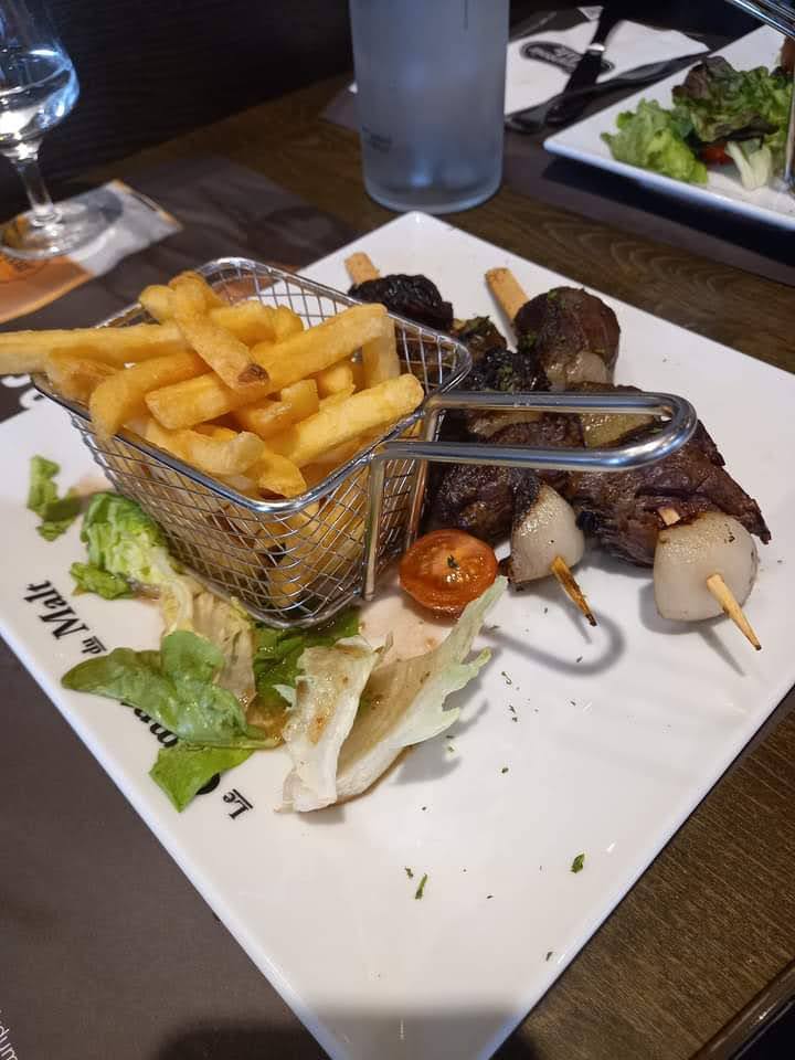 Service très rapide et le serveur bien agréable ce qui relève la note. Servis moins de 30mins après la prise de commande. Plus de bière blanche....un samedi soir dommage avec les bières proposées à la carte Bémol pour la cuisine informations transmises. Plat tiède frites moyennement chaudes Brochettes servies avec légumes grillés.... sans les légumes hahaha fallait pas demander les frites (c'est poortant à volonté sur la carte) Manque d'assainissement et de sauce