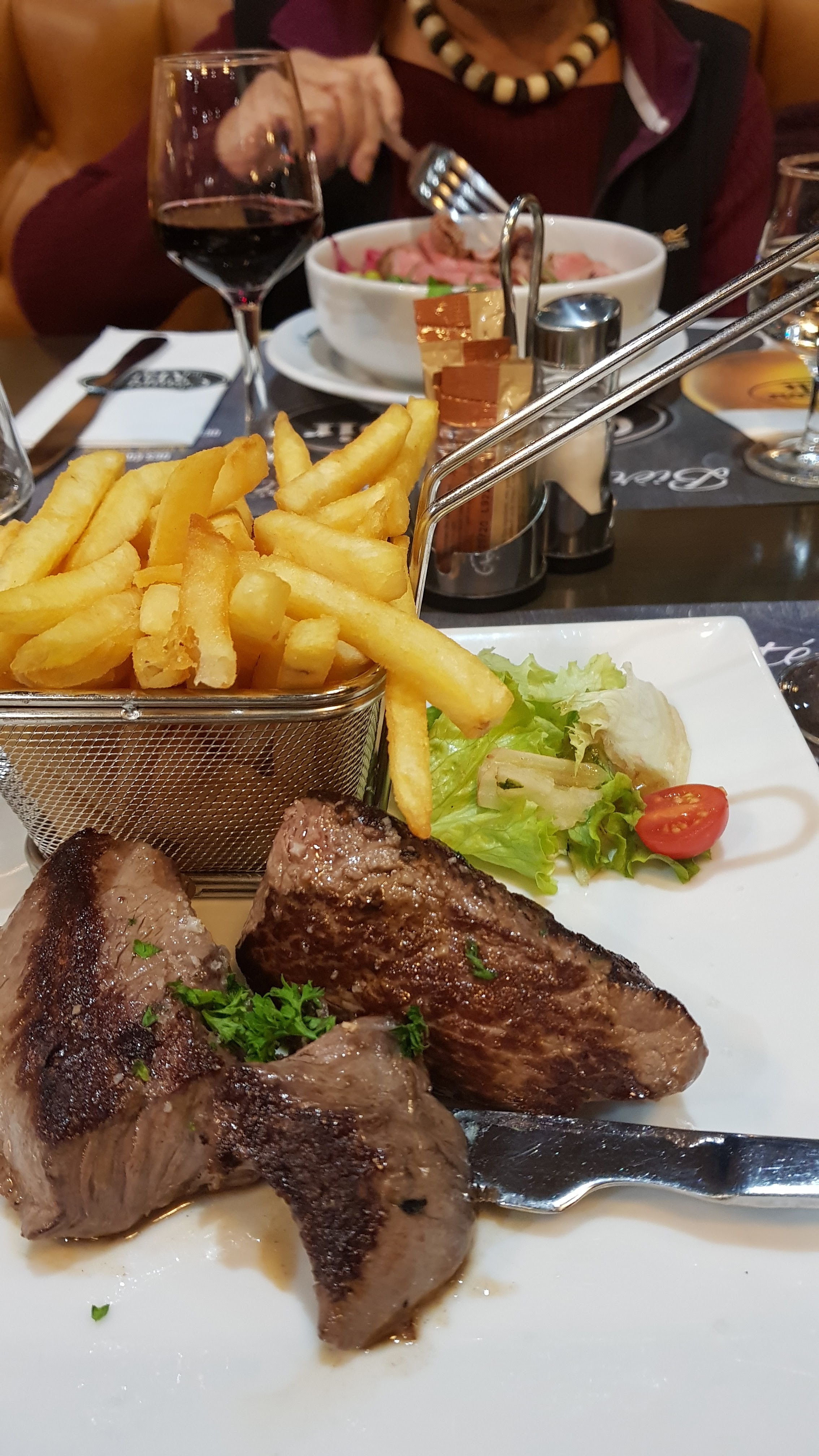 En accompagnement d’une viande presque tous les restaurants et brasseries accèdent volontiers à la demande moitié frites – moitié salade verte : ici c’est facturé d’un supplément de plus de 4 € = déplaisant et ABUSIF ! les dites frites ne sont par ailleurs servies qu’en très modeste portion … Soir du 29 février : à l’étage service avec de l’attente et des longueurs. Serveurs débordés, et pas vraiment stylés.
