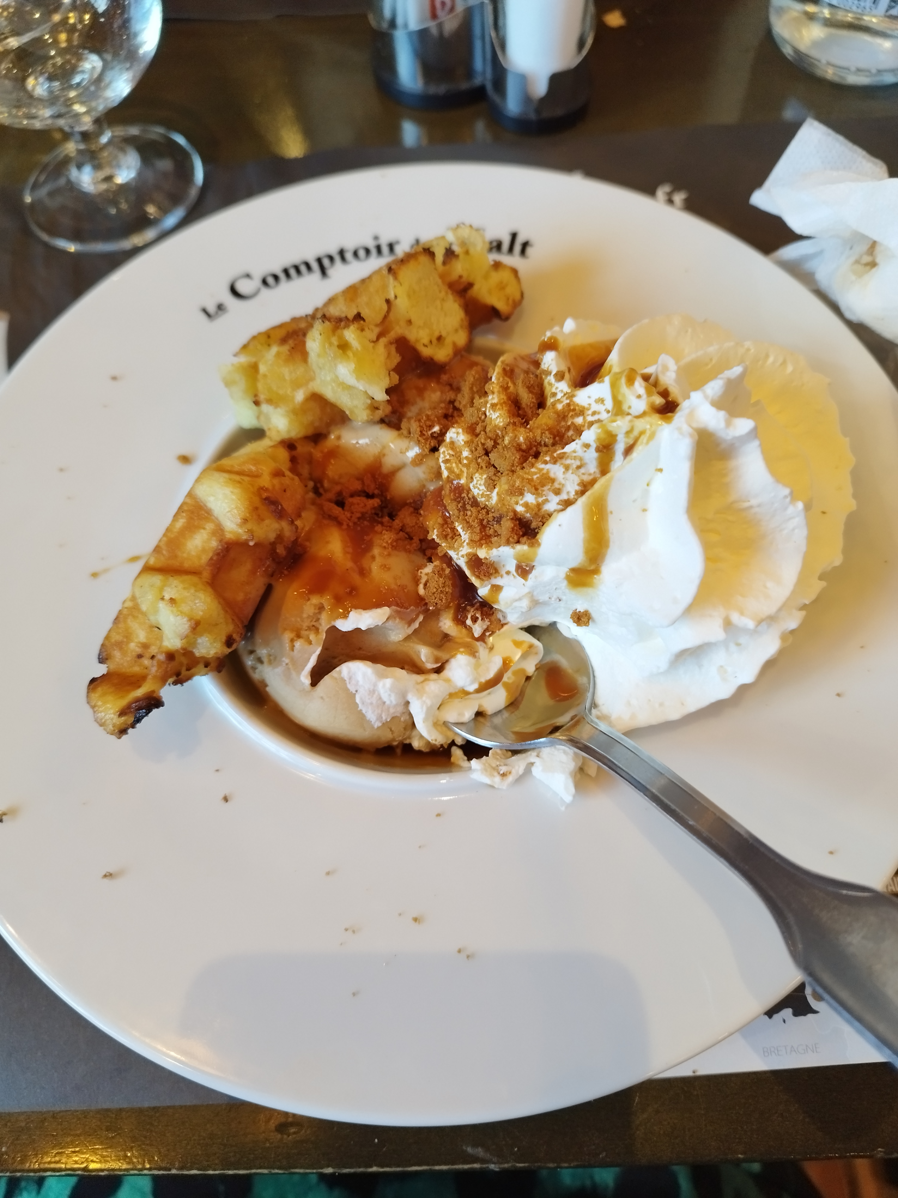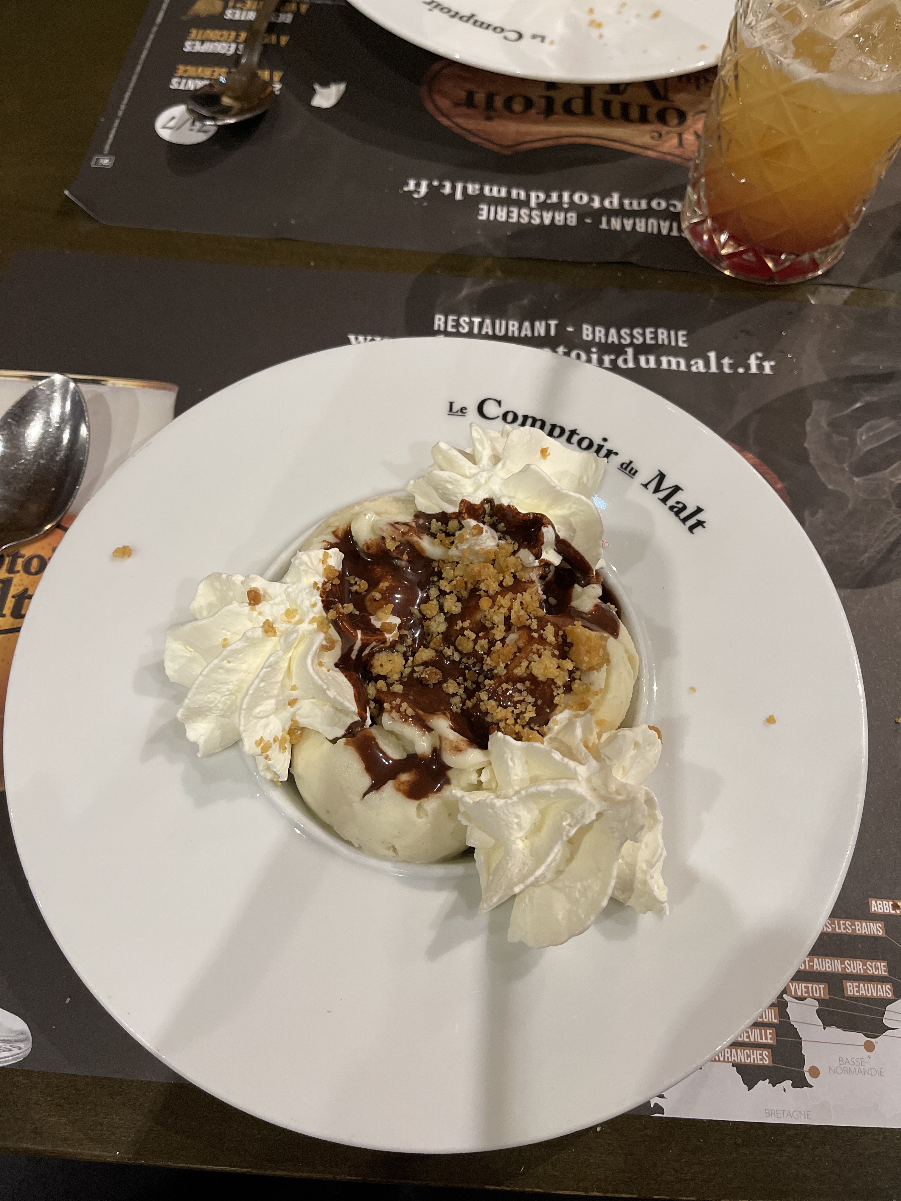 Assiette avec deux beaux morceaux d’andouillette, sauce maroilles excellente, Une crème brûlée généreuse…Top Dommage que les pommes de terre étaient peu présentes 🙃 Service cependant très long, arrivé 18h55 reparti 20h15 c’est très long… le serveur vs ces collègues passait trop de temps a blablater avec les différentes tables