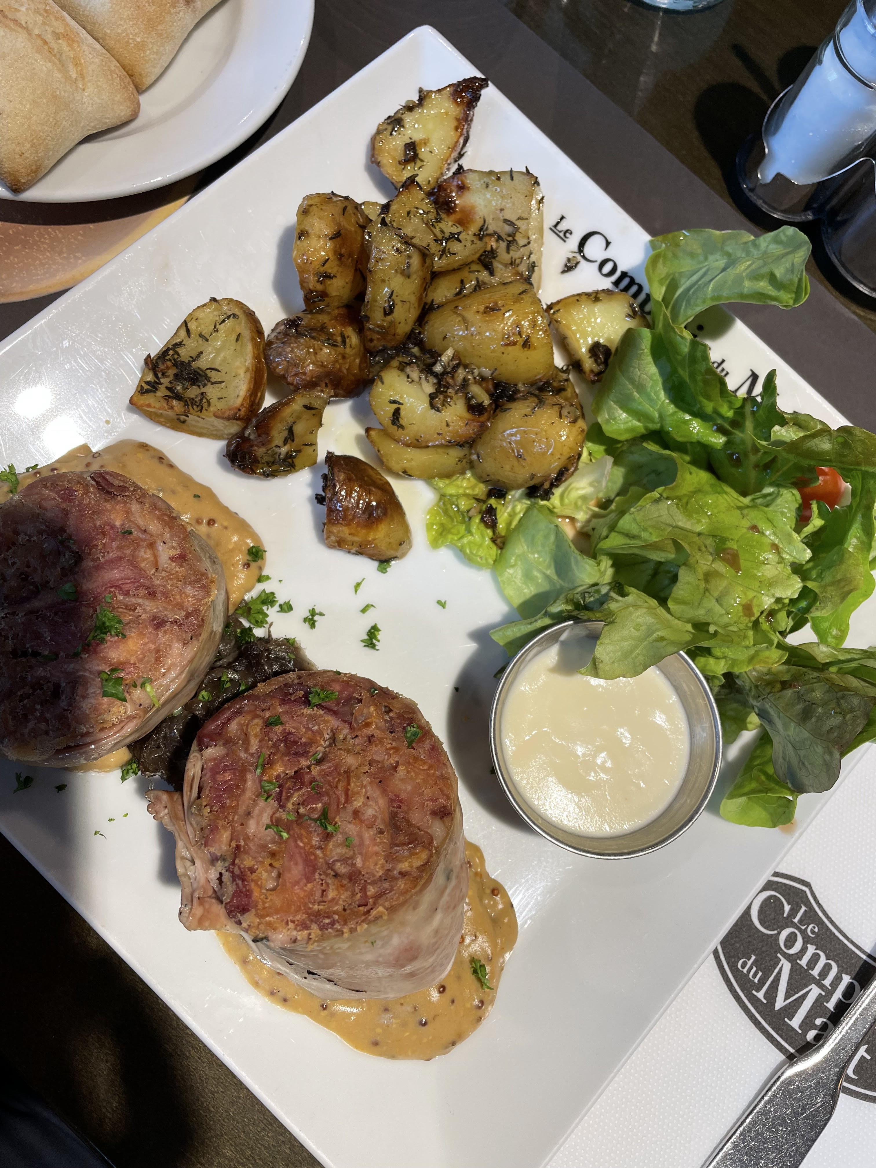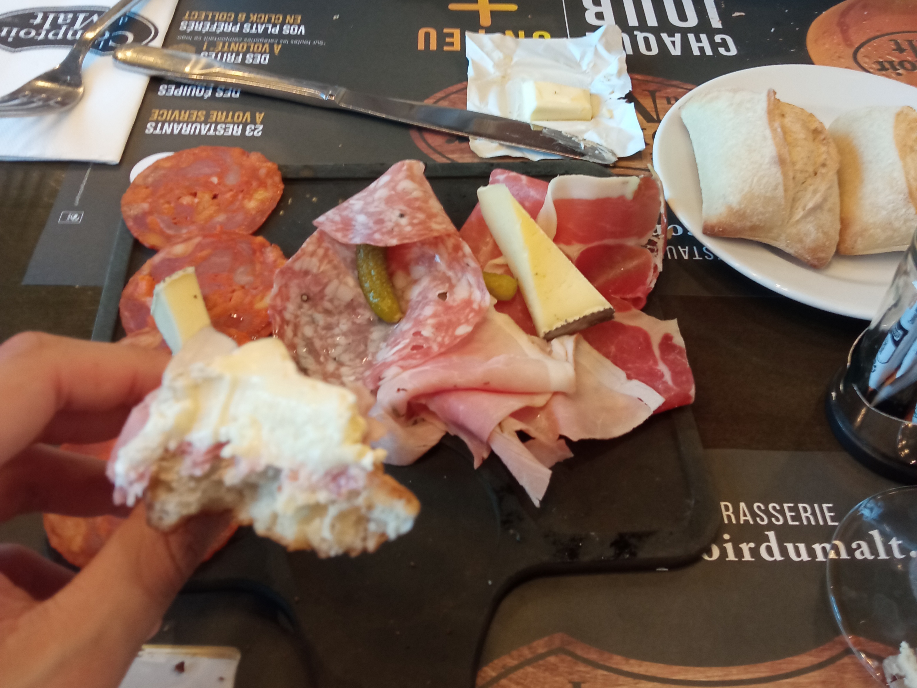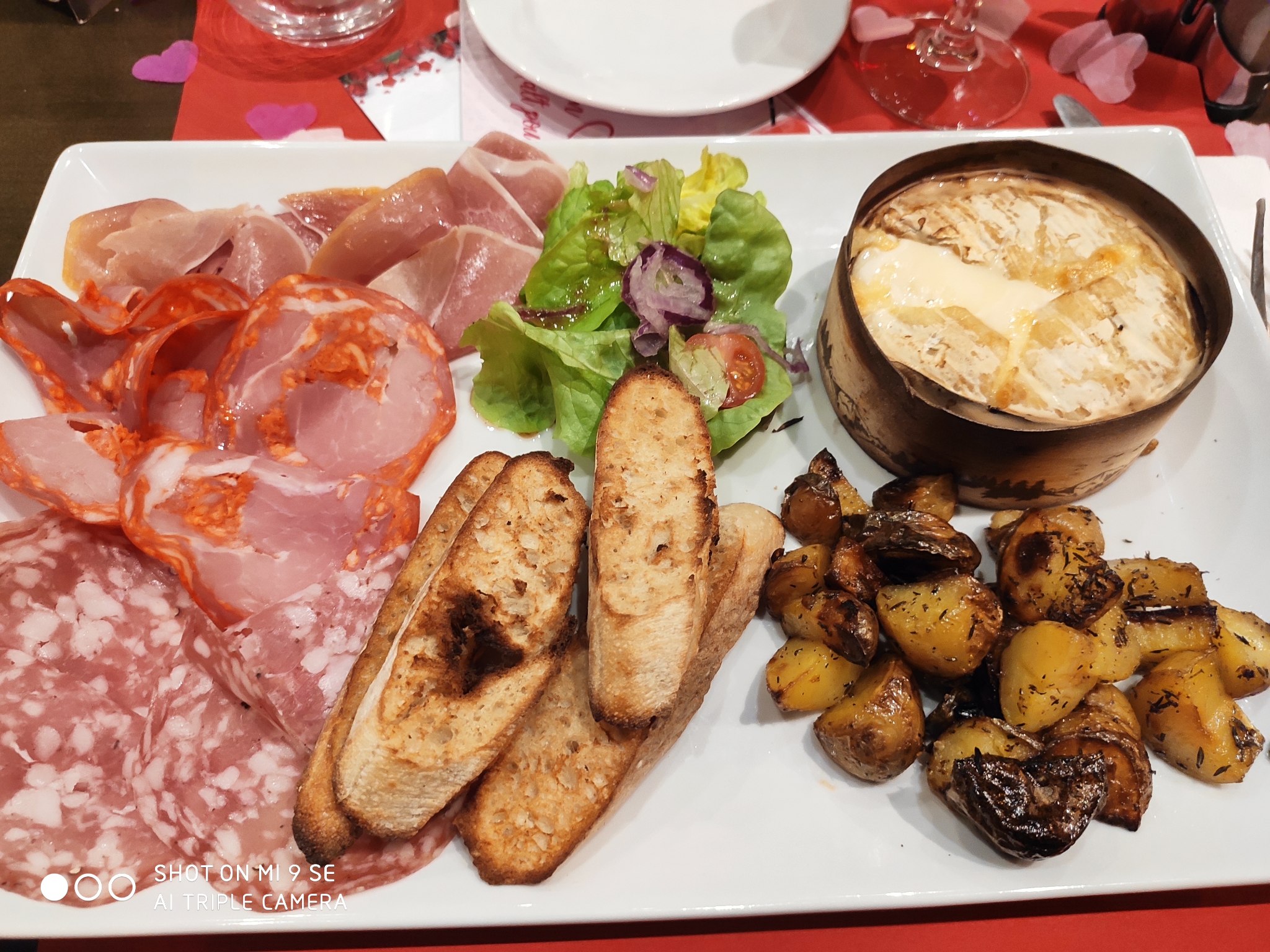 Planche apéro charcuterie fromage un peu légère. Repas correct. Dessert copieux surtout la brioche façon pain perdu 😜