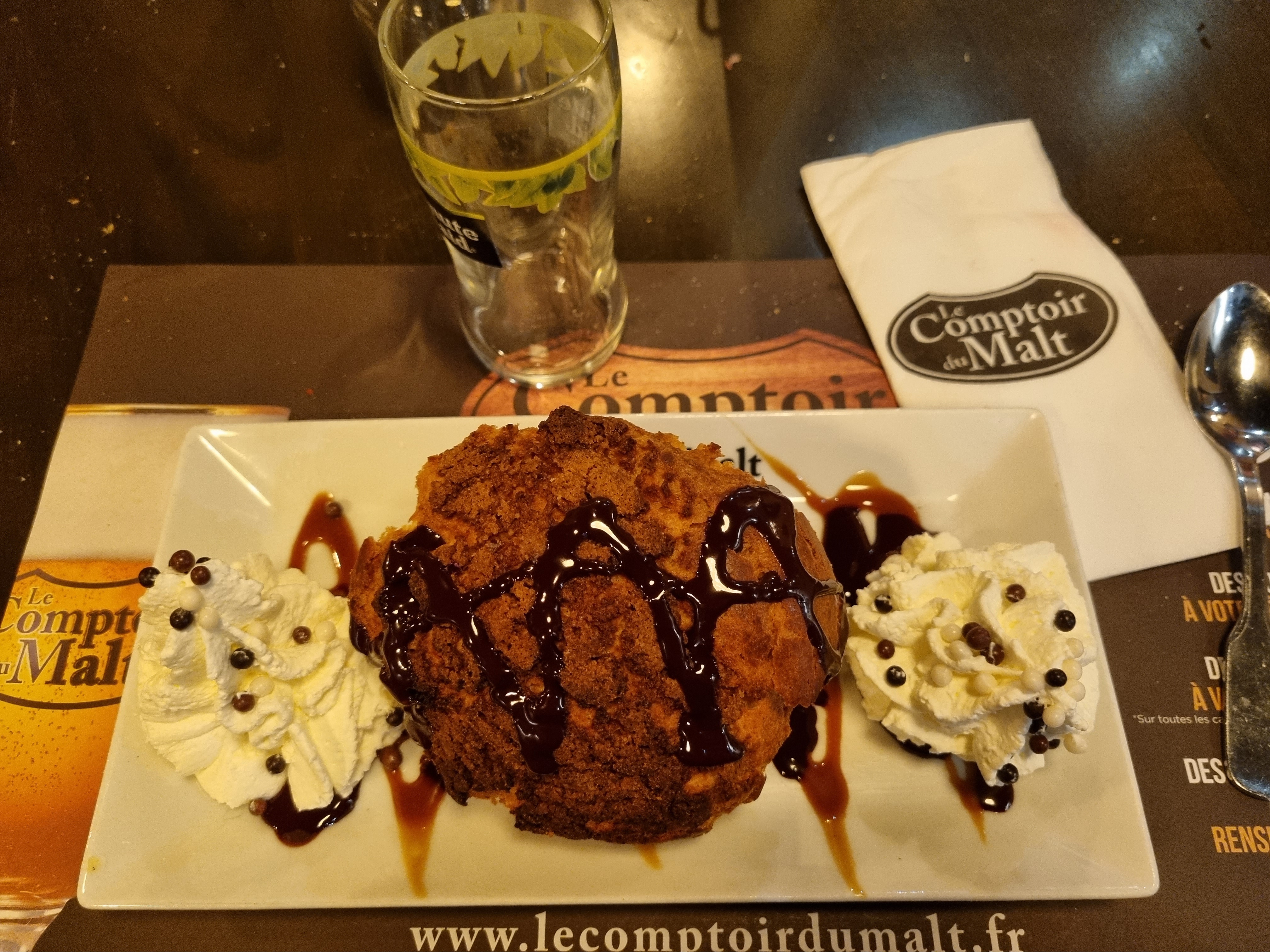 Nous y sommes aller avec les collèges, une pièce nous a était réservé. Le personnel y était accueillant. Vraiment top. Très bon rapport qualité prix. . J'ai pris un cooktail sans alcool thé glacé. En entrée nous avions pris 3 planches à partagés (charcuterie et beignets de poisson). En plat endouilette frites pour moi et en dessert une flamenkuche aux pommes avec sa boule de glace vanille. Comme nous étions lundi la serveuse nous à apporter une bouteille de bière d'un litre pour la table (cadeau à emporter).