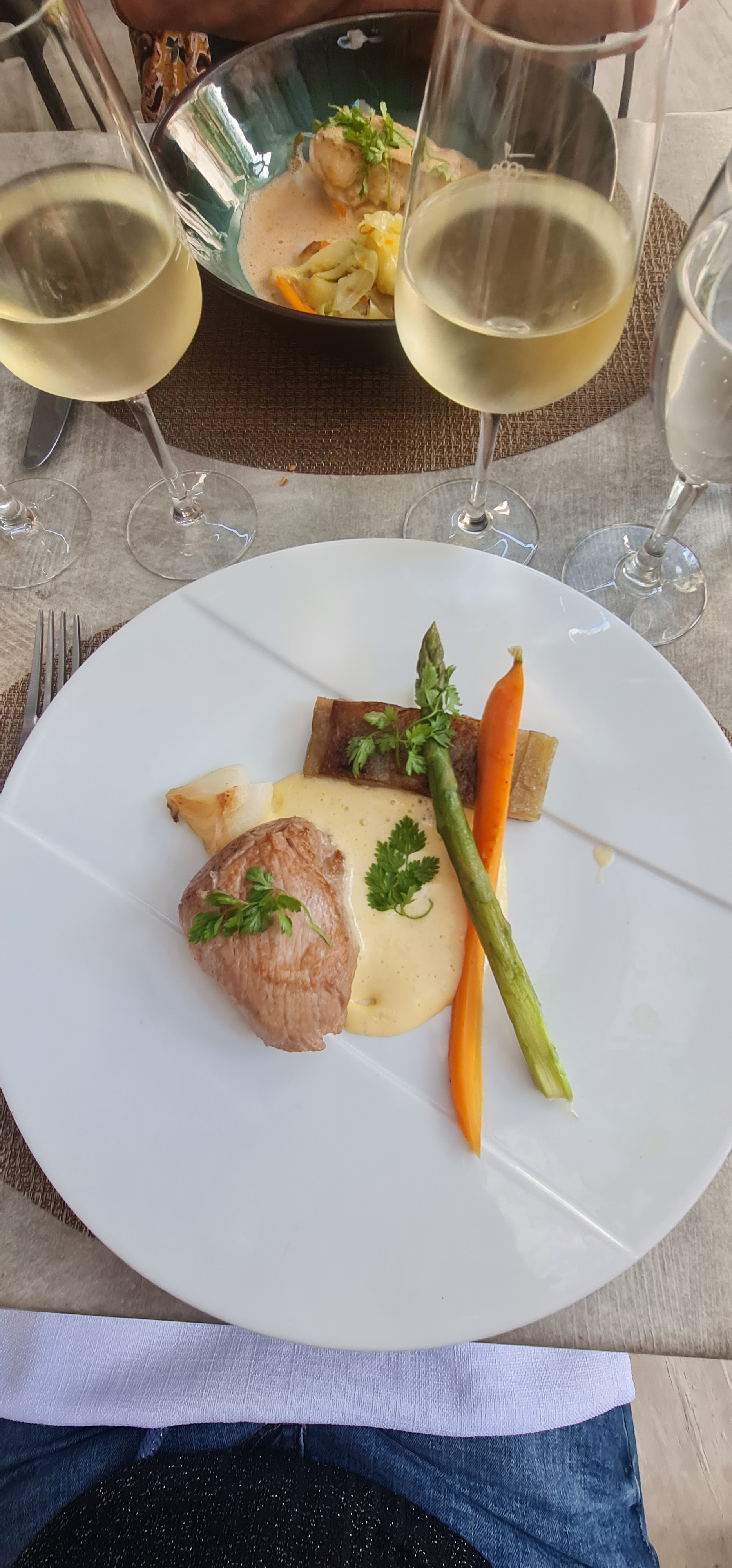 Accueil très agréable-nappe tissu-jolie presentation des plats-légumes cuits juste à point. Juste petit bémol sur la cuisson du poisson (trop cuit).