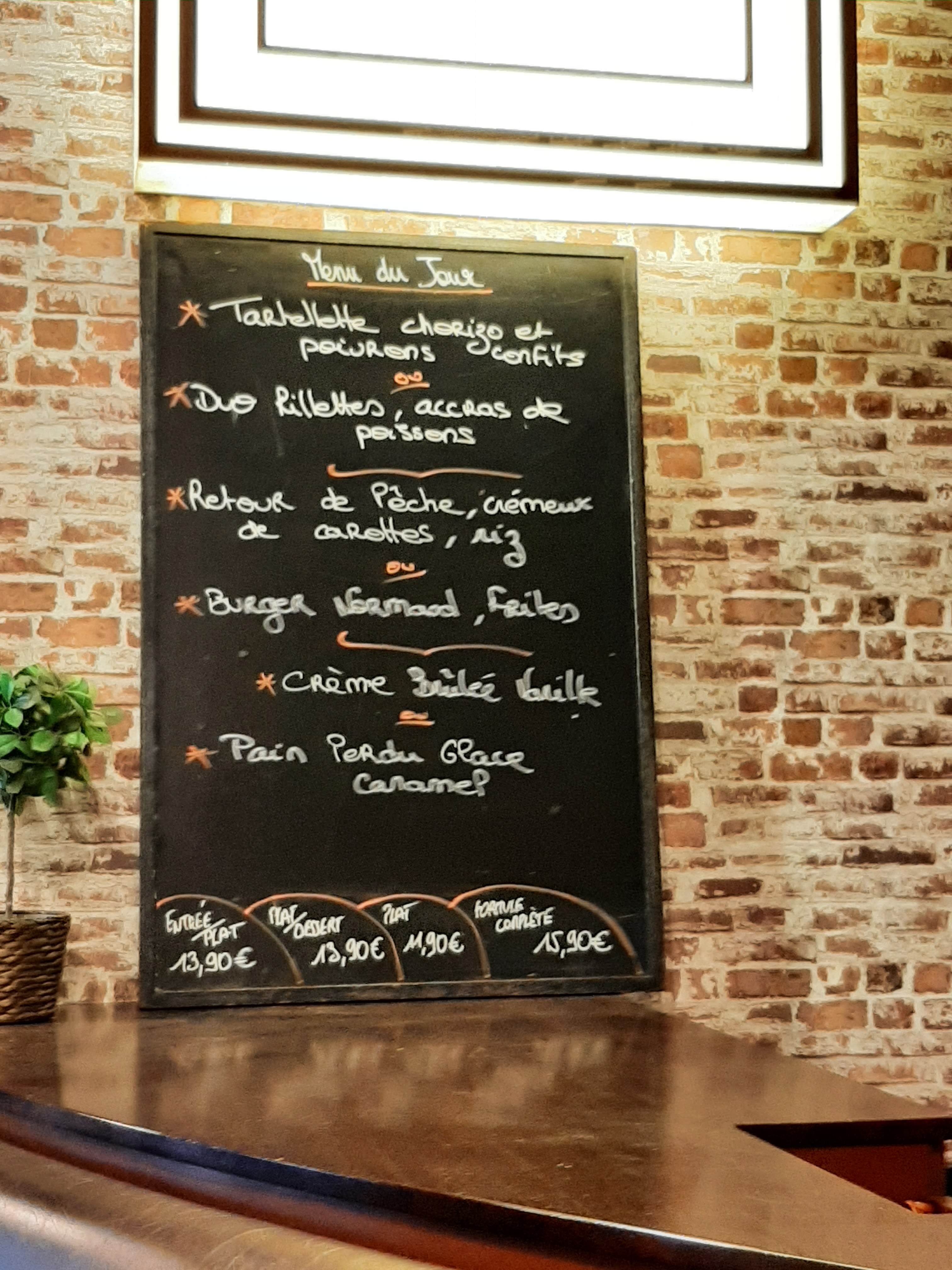 Excellent rapport qualité prix et assiettes bien garnies et surtout présentées avec soin. Plats variés,menu du jour très abordable au vu des plats présentés: 12,90€ plat + dessert ou entrée+ plat. Personnel très professionnel et souriant.