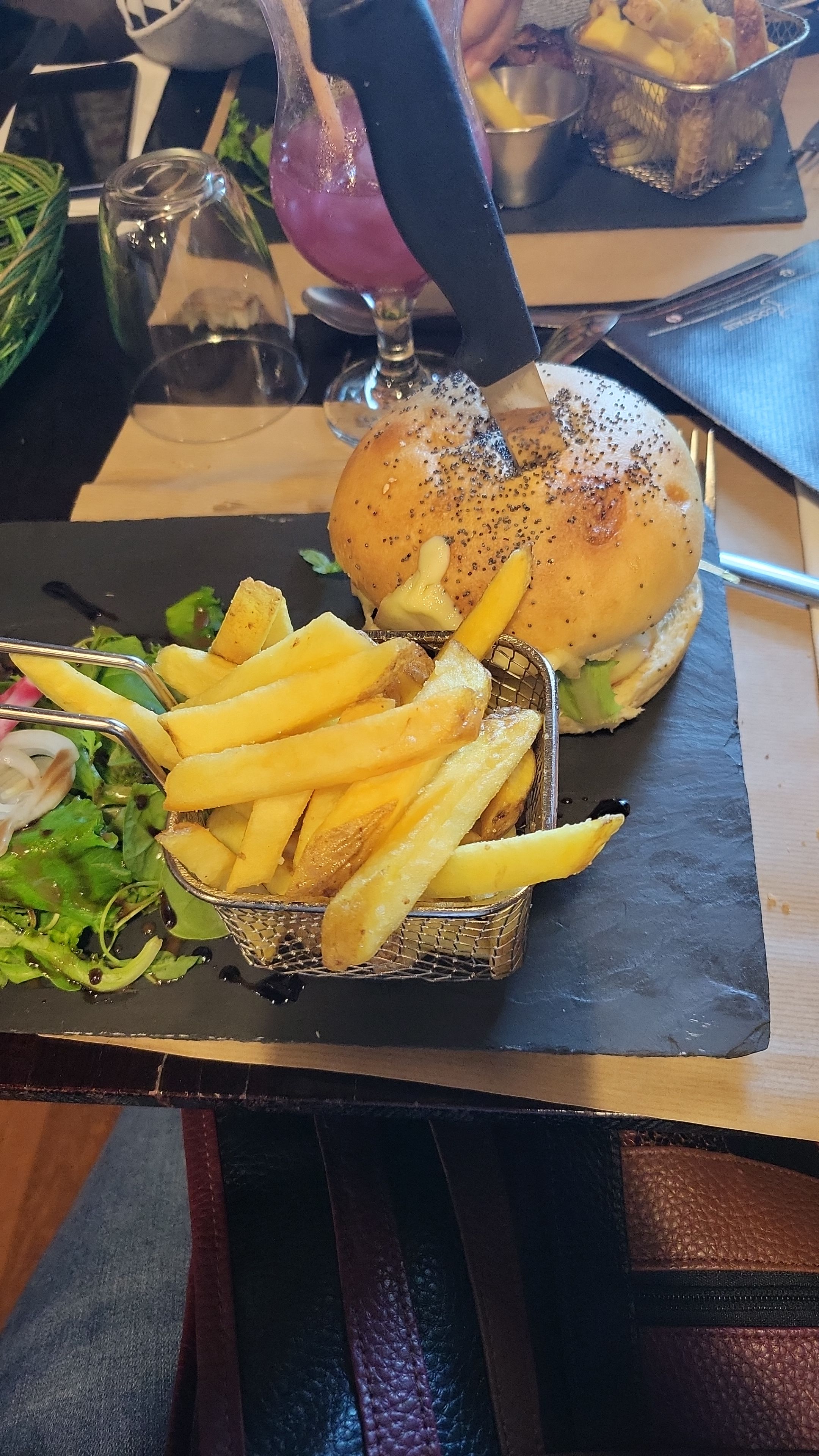 Accueil pas très chaleureux attente 40 min pour premier plat et cocktail salade de gésier qui baigne dans la graisse et huile . Frite plutôt bonne et 🍸 bon le burger aussi etait plutot bon et assez en quantité.