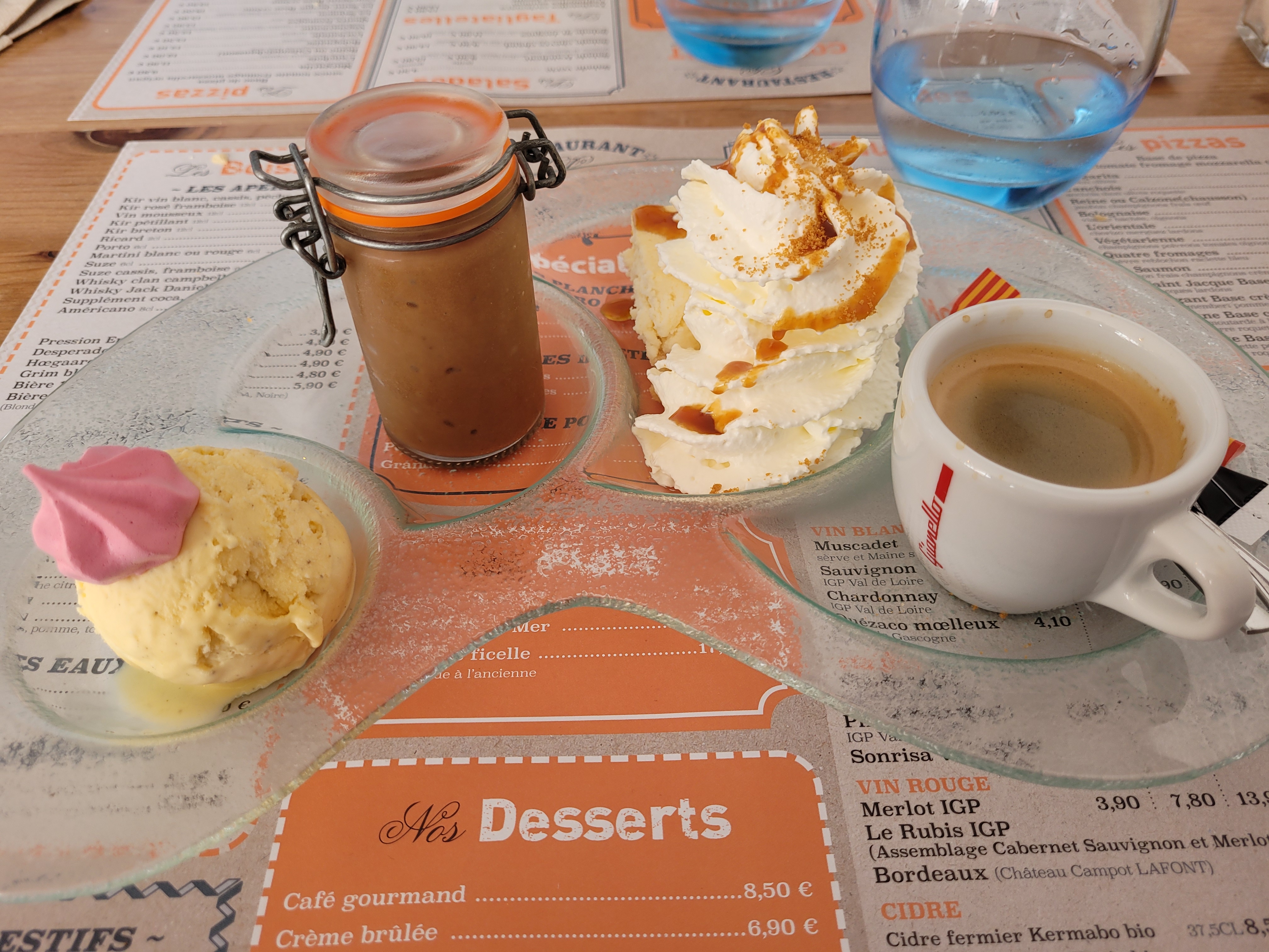 Pizza aux St Jacques très copieuse et bien garnie. En plus, d'être délicieuse. Café gourmand : assiette de dessert variée. Et prix très abordable. A tester