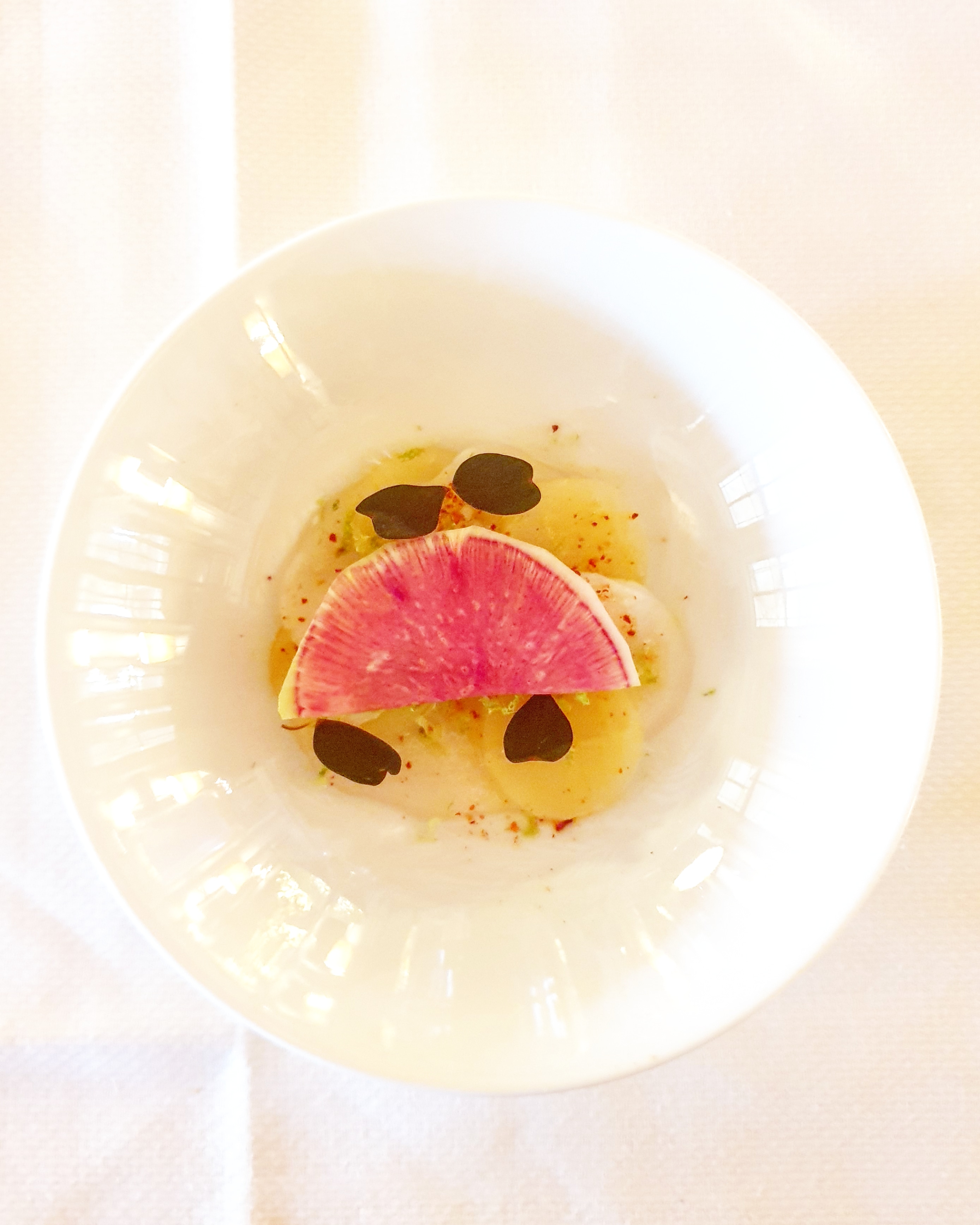 Au centre de l'hôtel, entre le bar et la salle aux 3 étoiles, se trouve Le Dali. Une décoration soignée et riche en détails, (de quoi patienter en admirant la tenture...) Les entrées et les desserts sont au choix, Pour commencer j'ai pris un carpaccio de poisson (très beau et très bon poisson, il fondait en bouche mais cela manquait de citron et d'épices) En revanche concernant le plat principal c'est un menu pré établi (chaque jour de la semaine à son plat) Et le jeudi c'était foie de veau & pommes de terre... (Avec une option poisson si vous n'êtes pas très abats...) C'était bon mais rien d'exceptionnel ou de transcendant. (Un foie de veau persillé quoi...) Pour le dessert, (étant gourmande) j'ai pris une religieuse au café et le fameux fruit destructuré et givré et ce soir là, c'était le citron vert. La religieuse était bonne mais trop de morceaux de café torréfié à l'intérieur... (Du coup pas agréable en bouche et des morceaux partout coincés dans les dents, ce qui vous donne un sourire irrésistible !) Le citron vert destructuré est un véritable délice (j'en salive encore...) Il se structure en 3 parties.. Un cœur coulant de citron vert confit, enrobé d'une crème de chocolat blanc et le tout joliement entouré d'une capsule croustillante à l'allure d'un véritable peau de citron vert... Un écrin d'acidité et de douceur... Une véritable poésie gustative !!! Je remercie toute l'équipe du Dali, du service à la cuisine merci pour ce moment magique !! Et je vous invite à découvrir ce restaurant...