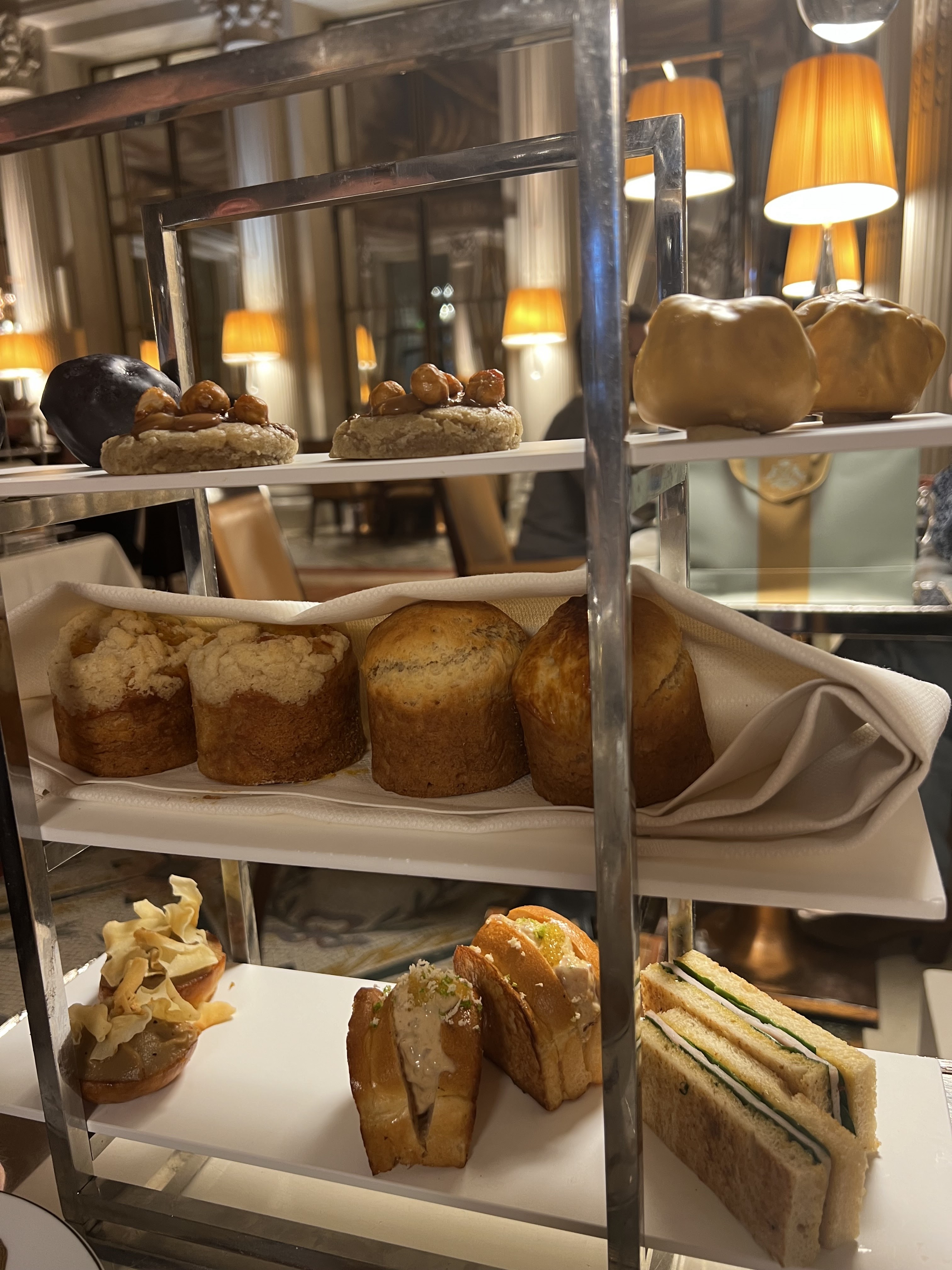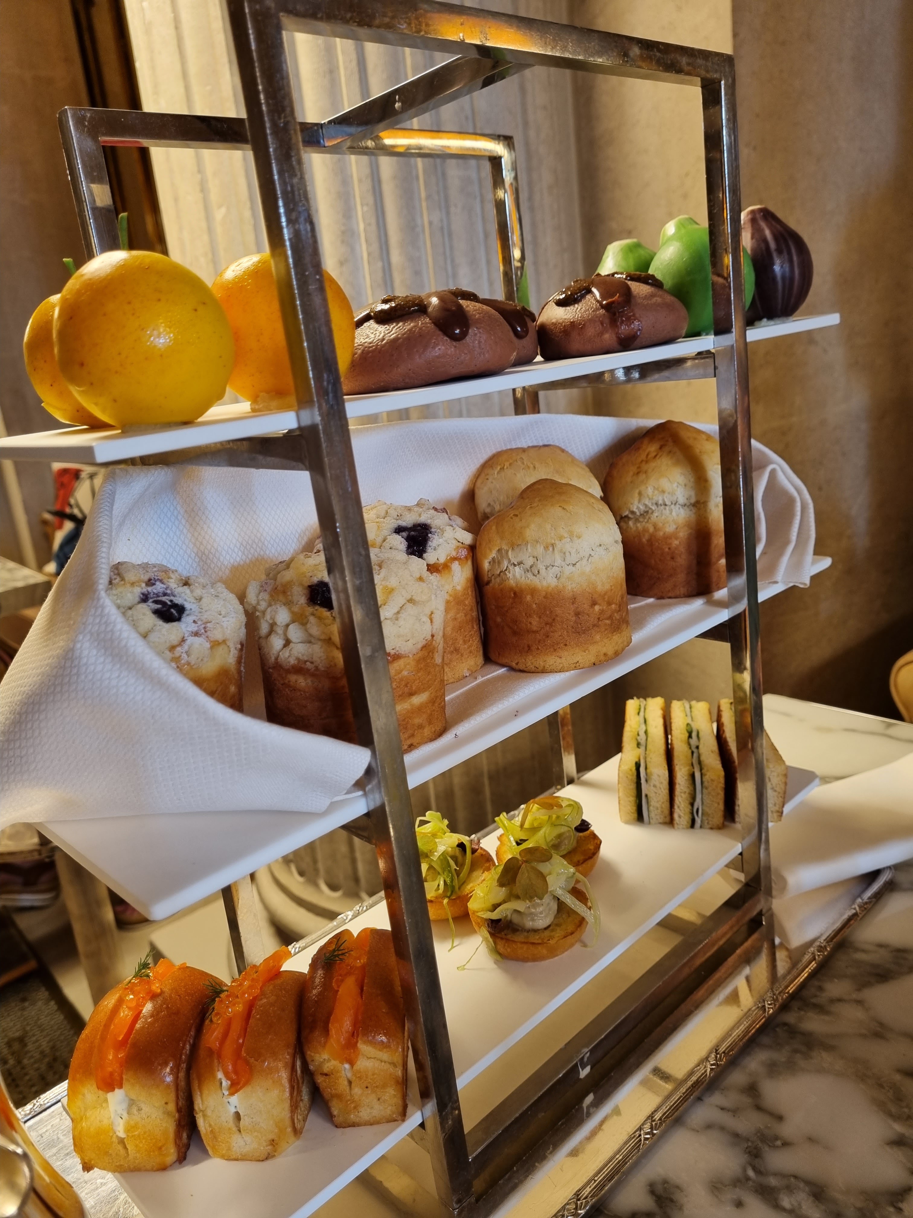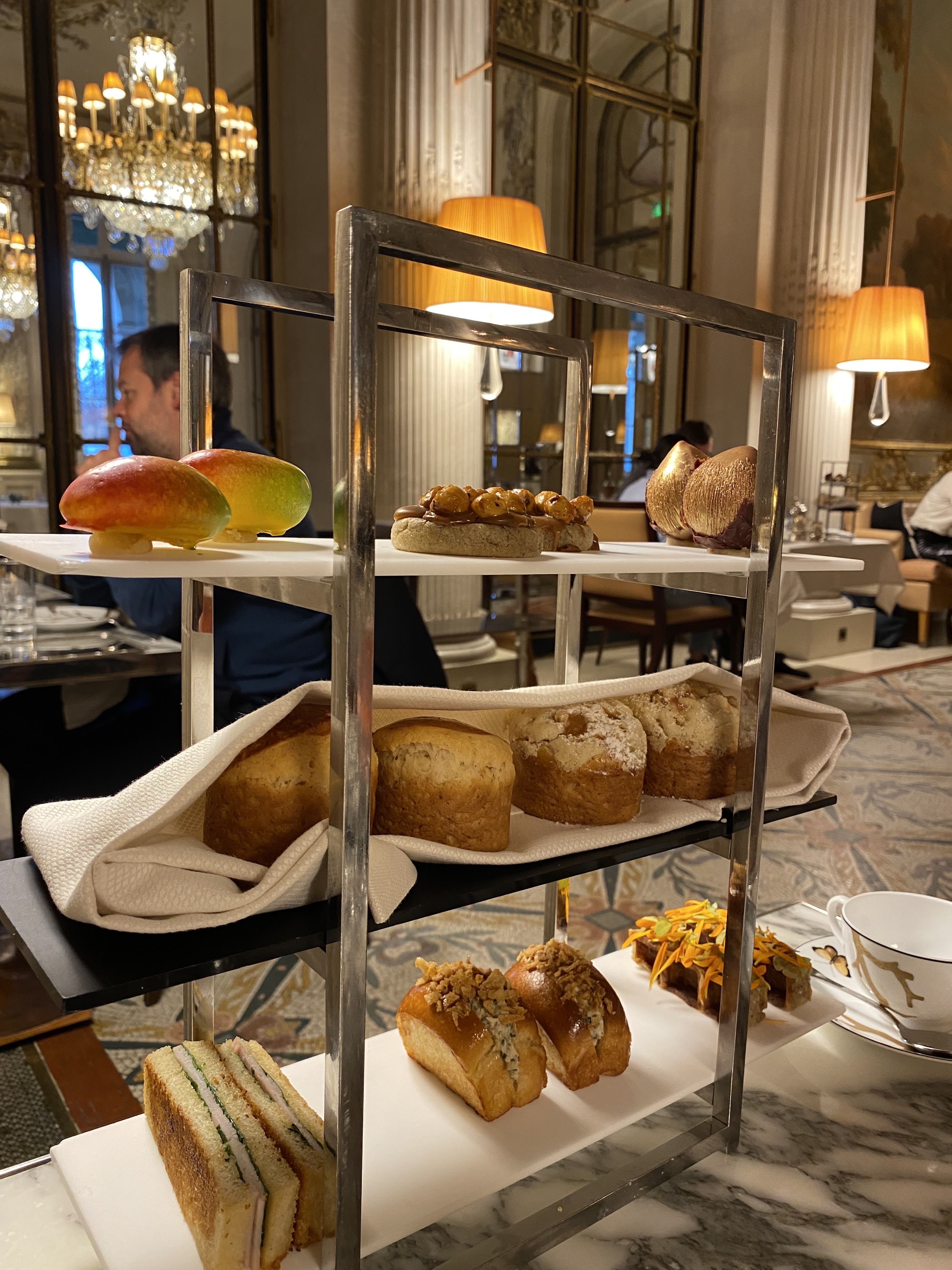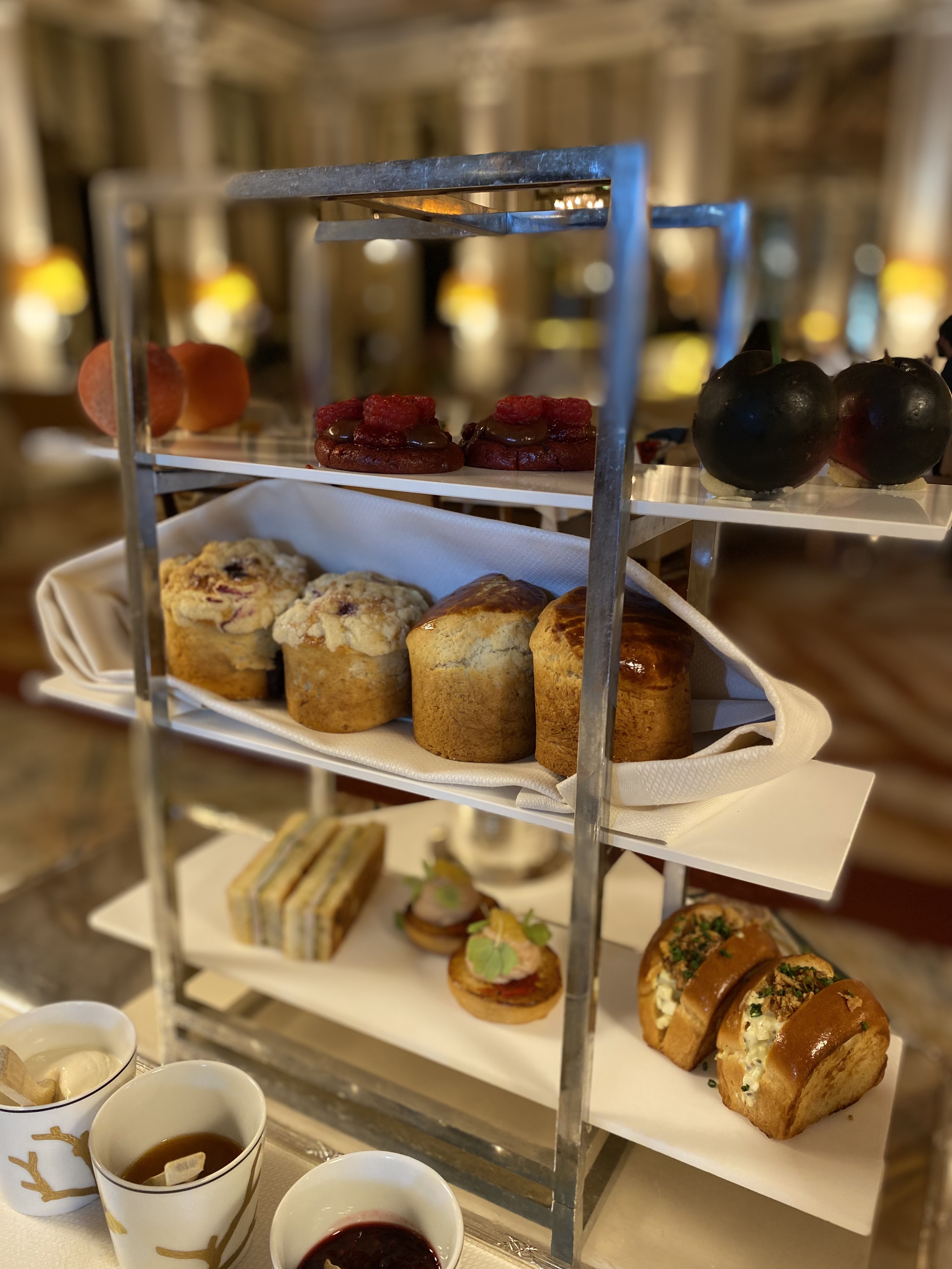 Le tea time à 48 € est fabuleux, les finger sandwiches, les scones, les pâtisseries de Cédric Grolet sont au top. Ambiance chic mais pas trop guindée.