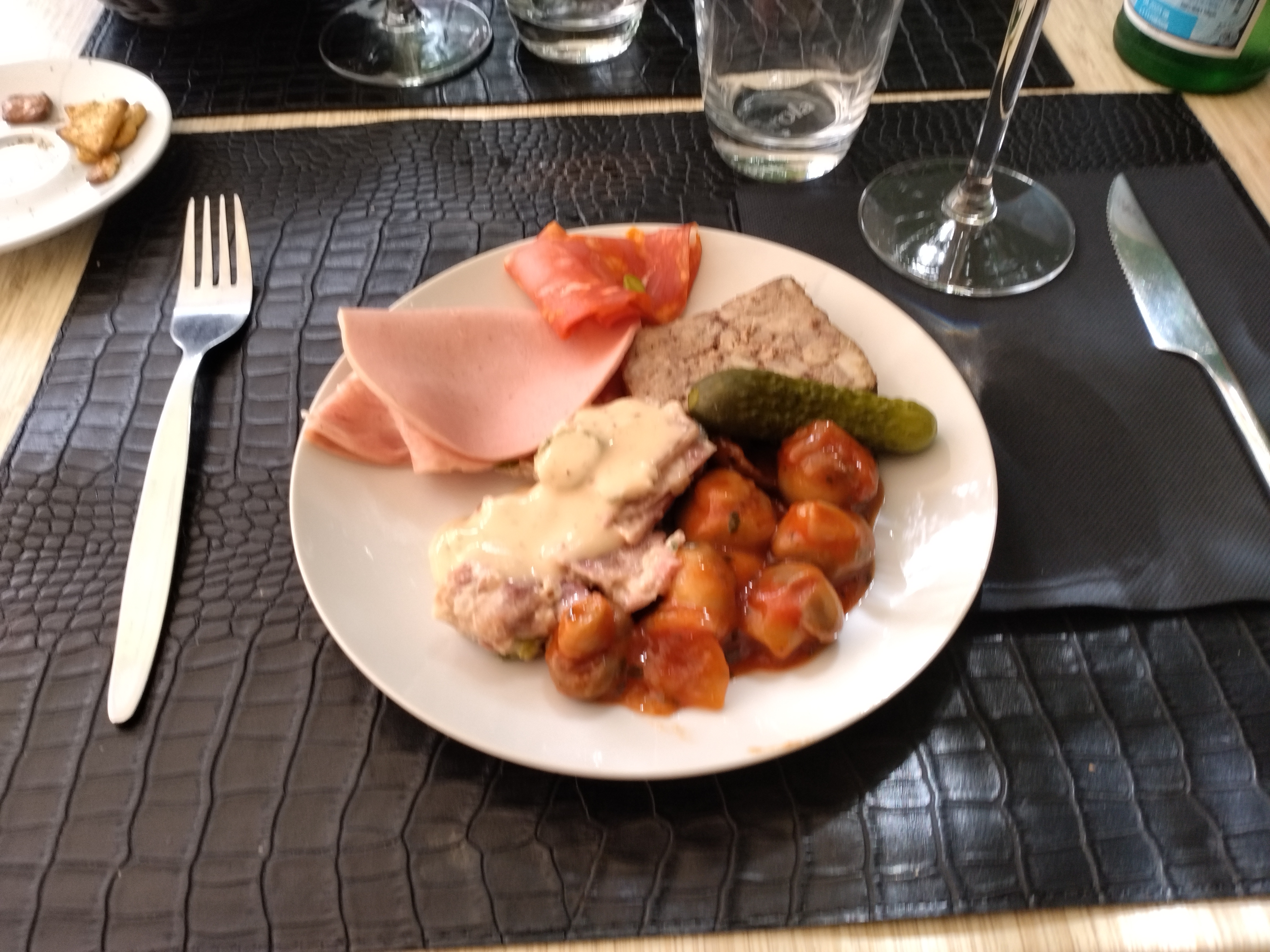 Excellent !!! D'une finesse incroyable !!! Crêpes au saumon sauce béchamel au fromage Craquelon pommes grenaille charcuterie Tarte au citron revisitée Je recommande !!!!!