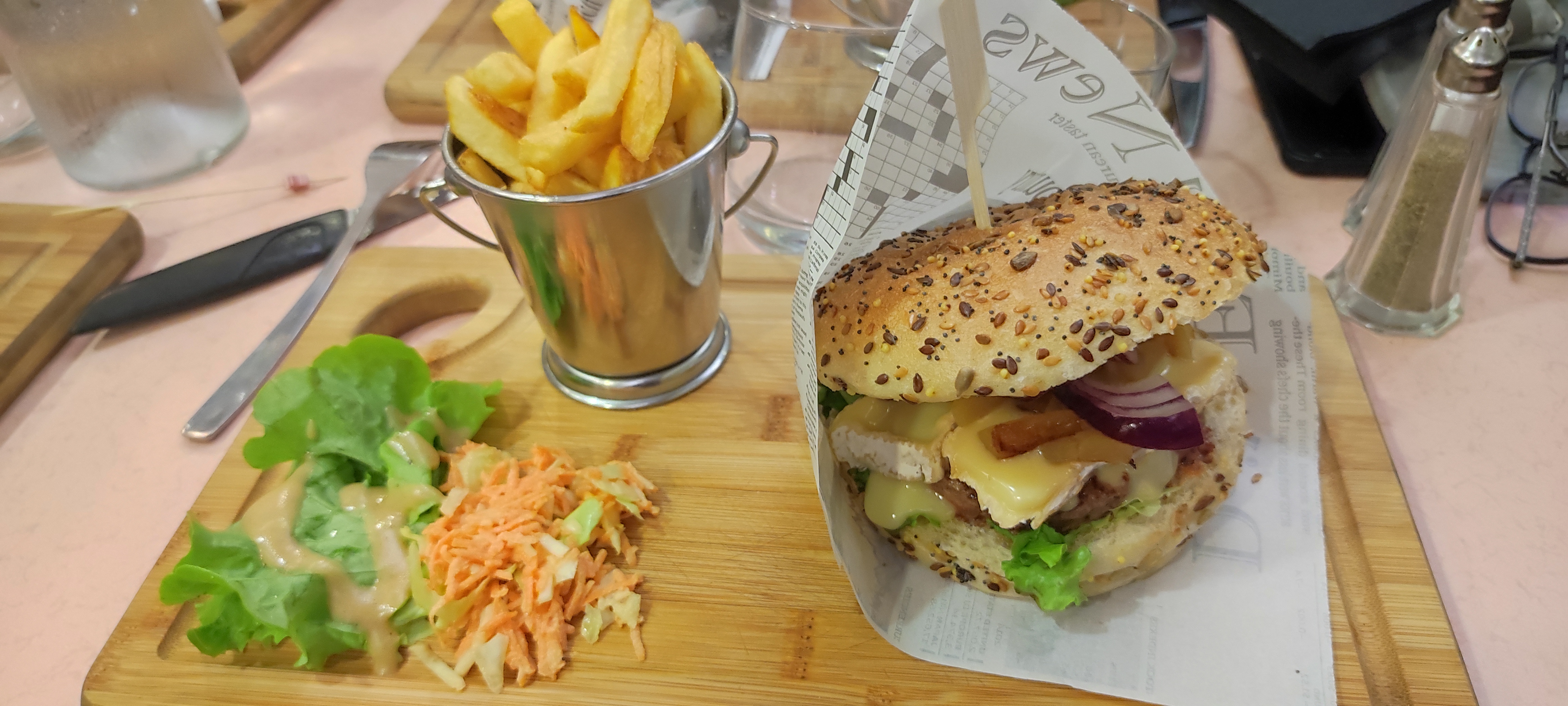 Par-fait! Accueillant, déco sympas, serveuses courtoise, très peu d'attente, cuisine de qualité avec des produits locaux de qualités également ! Qui plus est ouverte, l'hygiène de la cuisine a l'air parfaite, les geste barrières et le port du masque est respecter. French burger parfait pour ma part et que de compliments sur les moules camembert et les pâtes carbonara! Je conseil vraiment