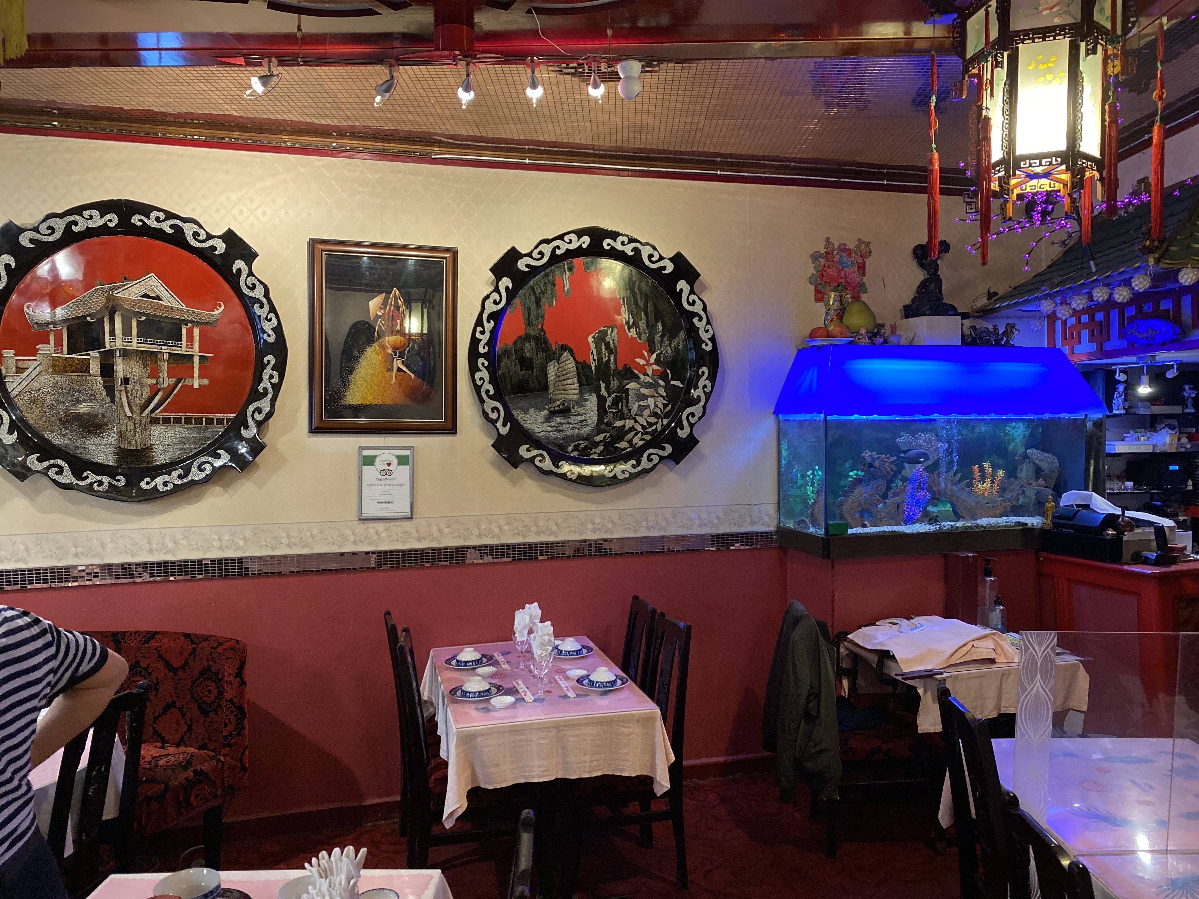 Nous avons découvert ce restaurant par hasard alors qu’on sortait du théâtre de la cité et que nous n’avions pas dîné. À 22h30, le patron très sympathique a accepté de nous recevoir et de nous dresser une table pour 6 personnes. Restaurant asiatique à là décoration très kitsch mais qui donne une impression d’évasion en Asie. Nous n’avons pas été déçu par les plats qui étaient tous délicieux avec une présentation très soignée (petite décoration avec carotte et radis sculptés en forme de fleurs, homard, oiseaux…) avec une recommandation particulière pour les nems que nous avons adorés. Nous tenions à remercier la sympathie du patron. Top rapport qualité/prix. Si j’avais une seule remarque à faire pour ce restaurant : d’imprimer et de rééditer de nouvelles cartes car celles qui sont données sont vraiment anciennes et peuvent donner, de prime abord, une mauvaise image du restaurant (ma carte était limite collante) alors que la qualité des plats et du service est au rendez-vous. Nous reviendrons !