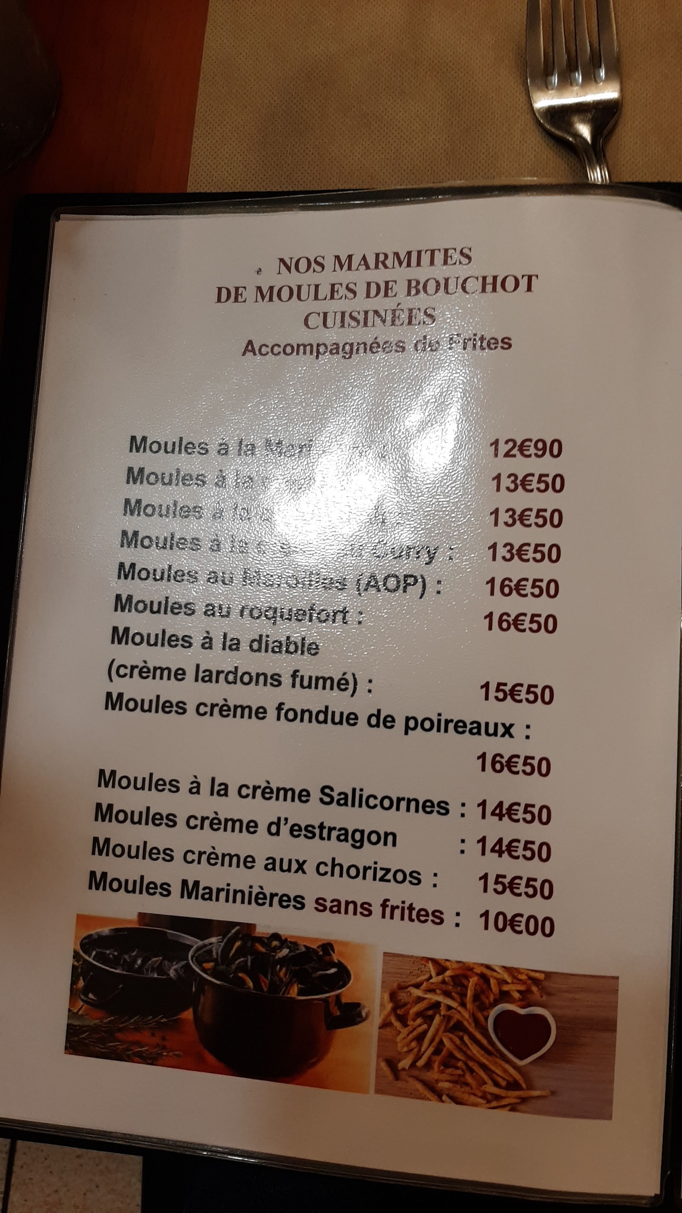 Très longue fut la consommation des moules tellement elles étaient petites mais bonnes. Café renversé dans la tasse. Rare restaurant qui propose des menus... hélas qui ne sont plus servis très rapidement (à 13:15 un samedi 3 septembre) obligeant de prendre à la carte (mais il n'y avait pas tout !) WC spacieux et propres.