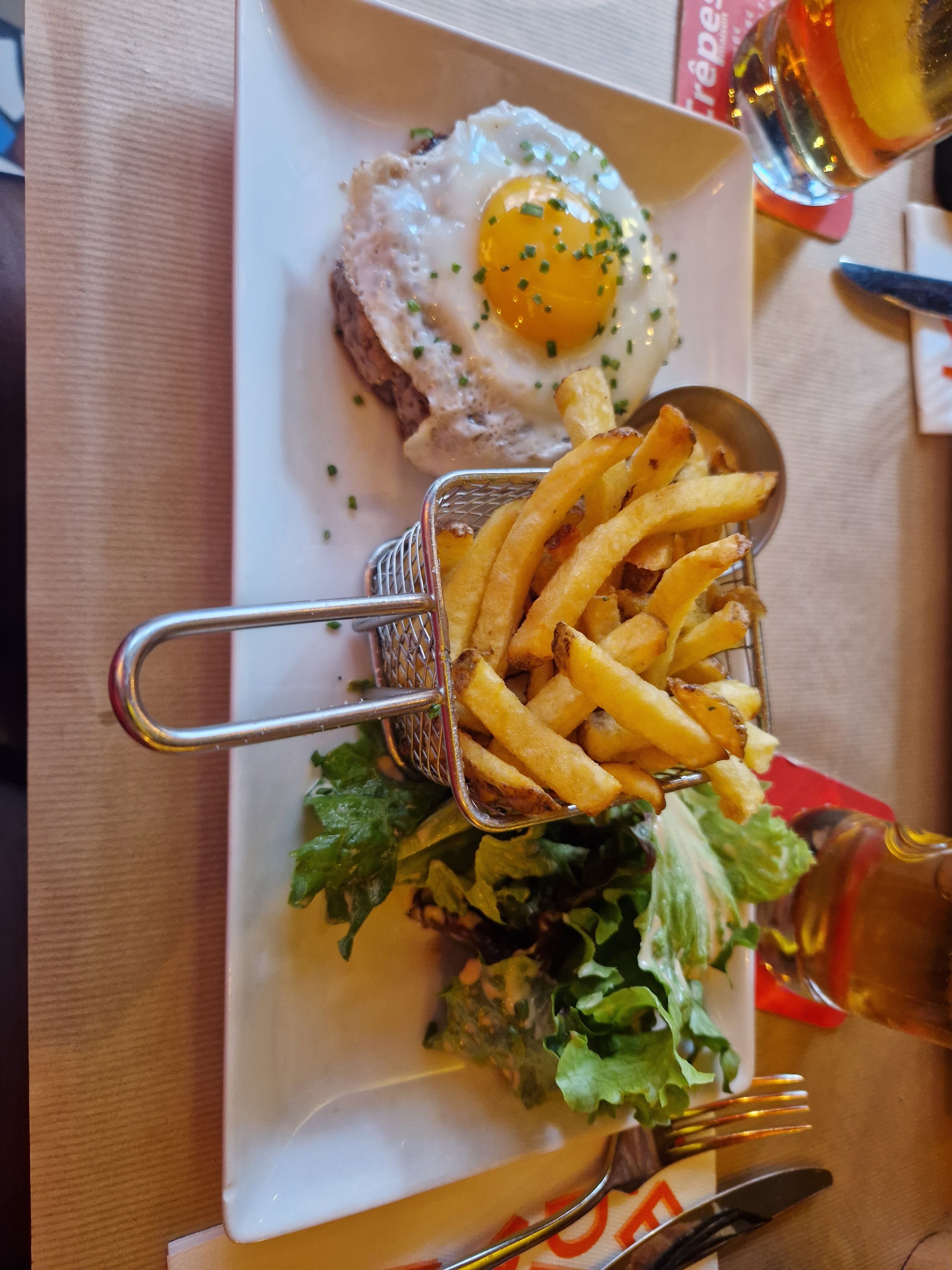 Croque mr servi tiède mais réchauffé sans pb, et bon. Tartare de bœuf bon, pas trop épicé afin de l 'assaisonner à son goût. Vin chaud très bon bien parfumé. Serveur très agréable. Il faisait 1 peu frais à l'intérieur, mais ambiance/deco automnale super agréable.