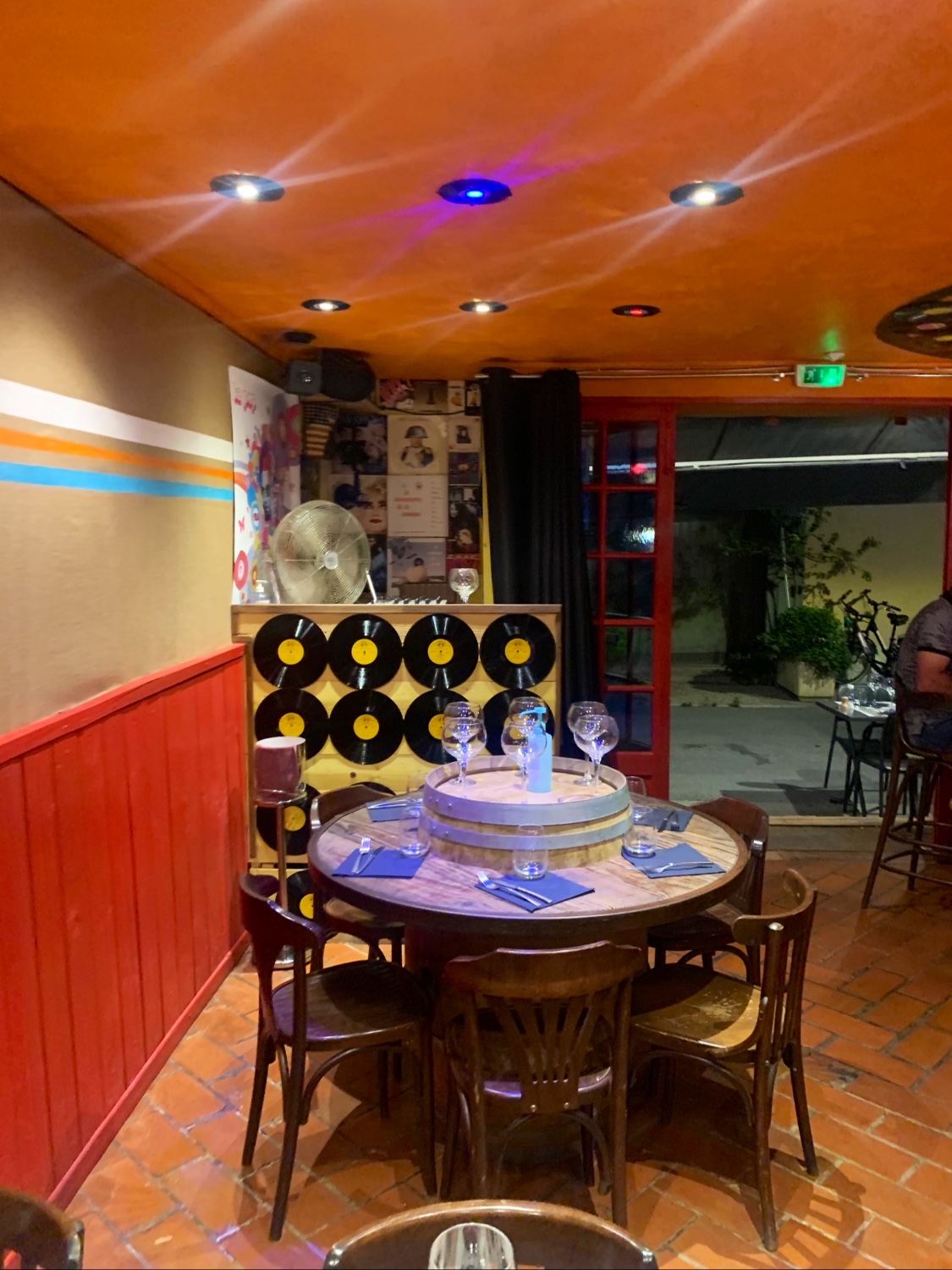 Une décoration atypique mais très sympa. Un mètre des lieux qui connaît bien sont sujet et c'est rassuré sa clientèle. Des pochettes de disque 45 & 33 tours (pour les anciens) accroché aux murs. Seul bémol, des tonneaux avec un cerclage en partie haute qui ressemble à une roue de charrette en guise de table pas top pour des grands comme moi (1.80m) ou plus petit. Préférer une table plus conventionnelle.