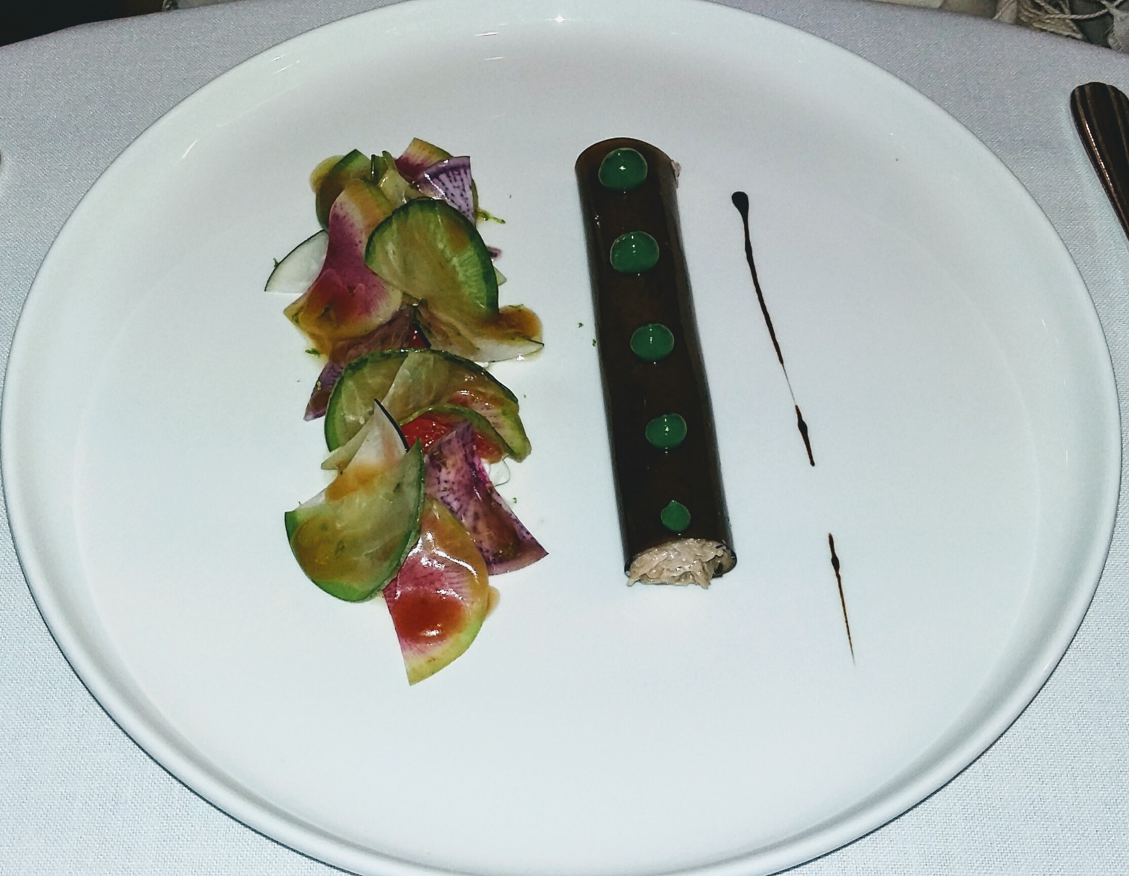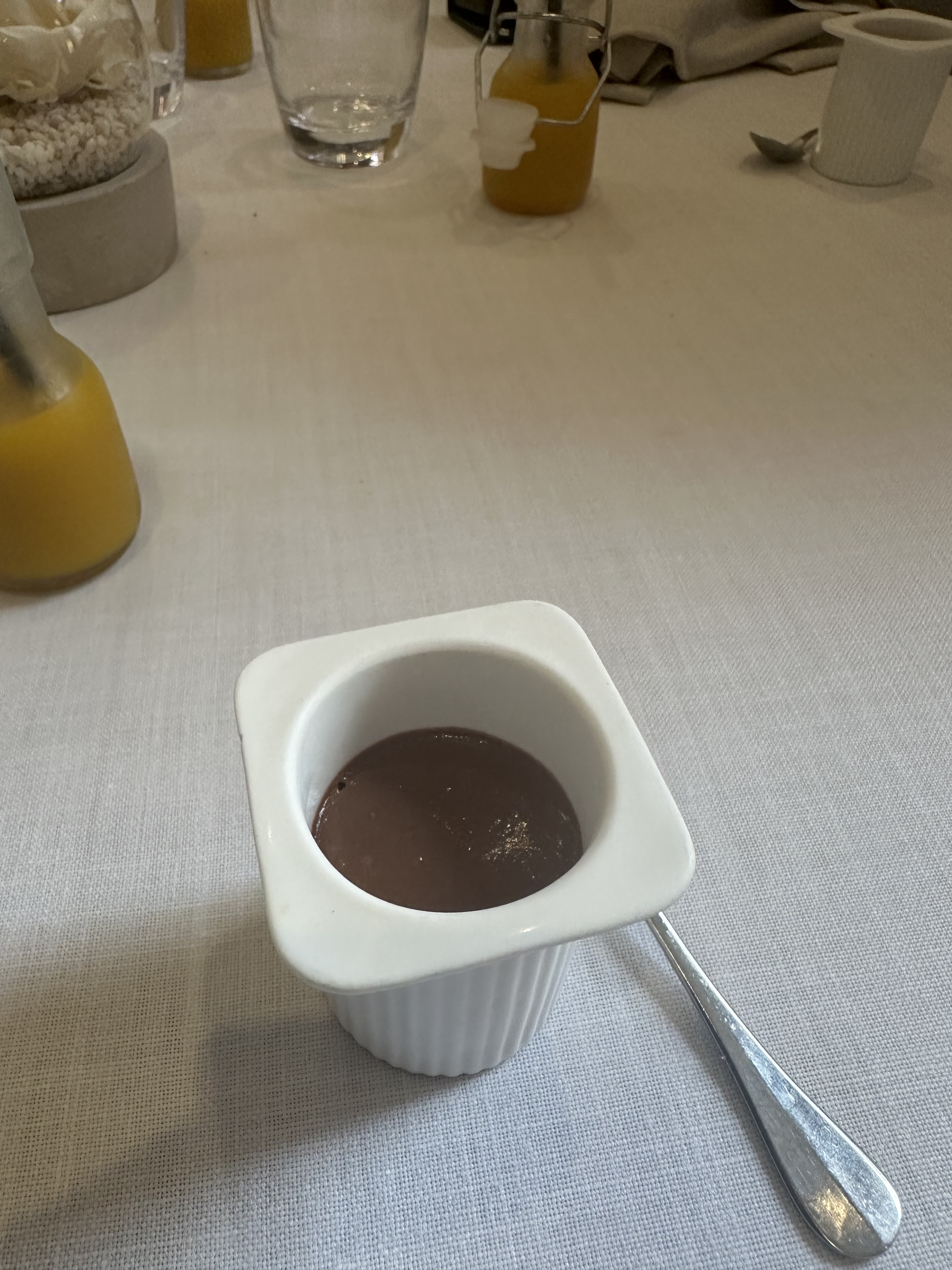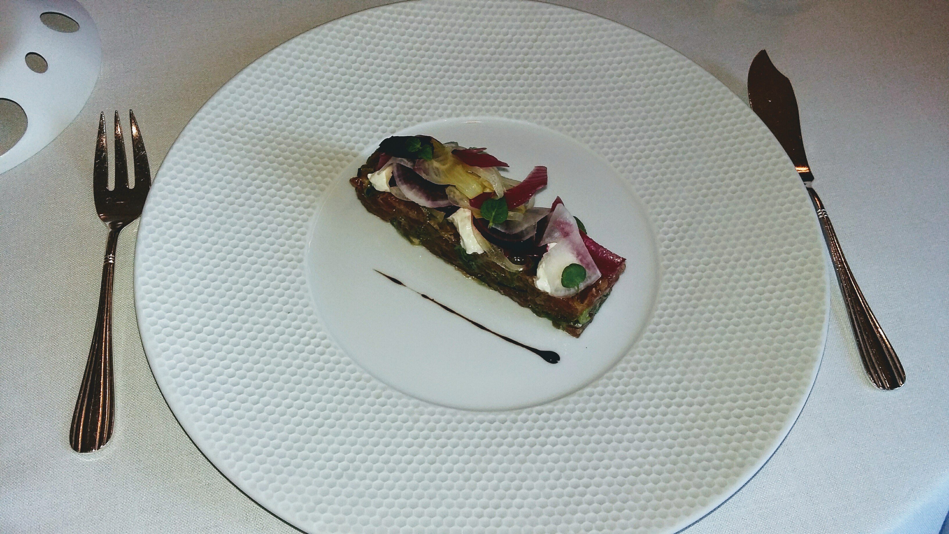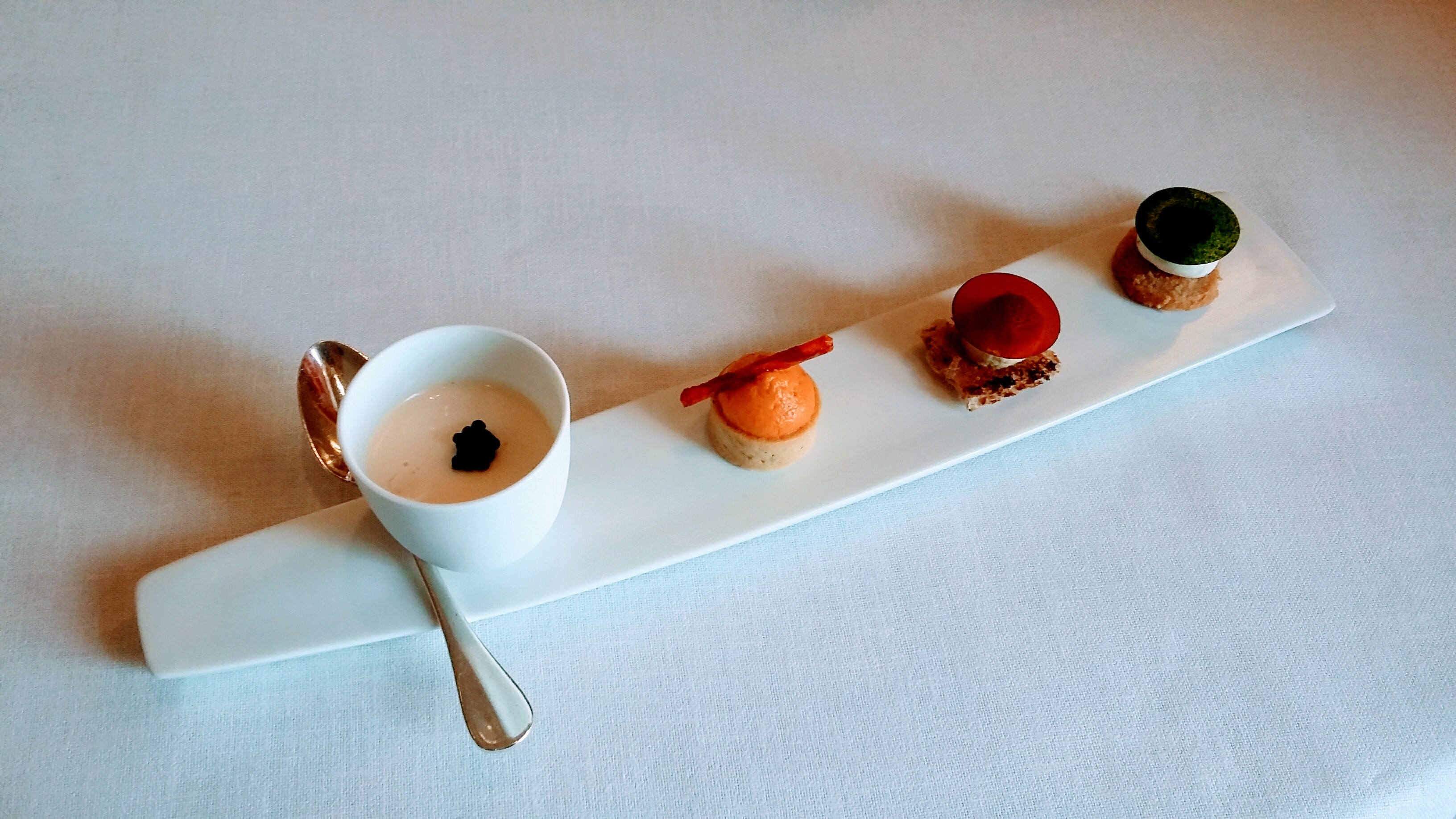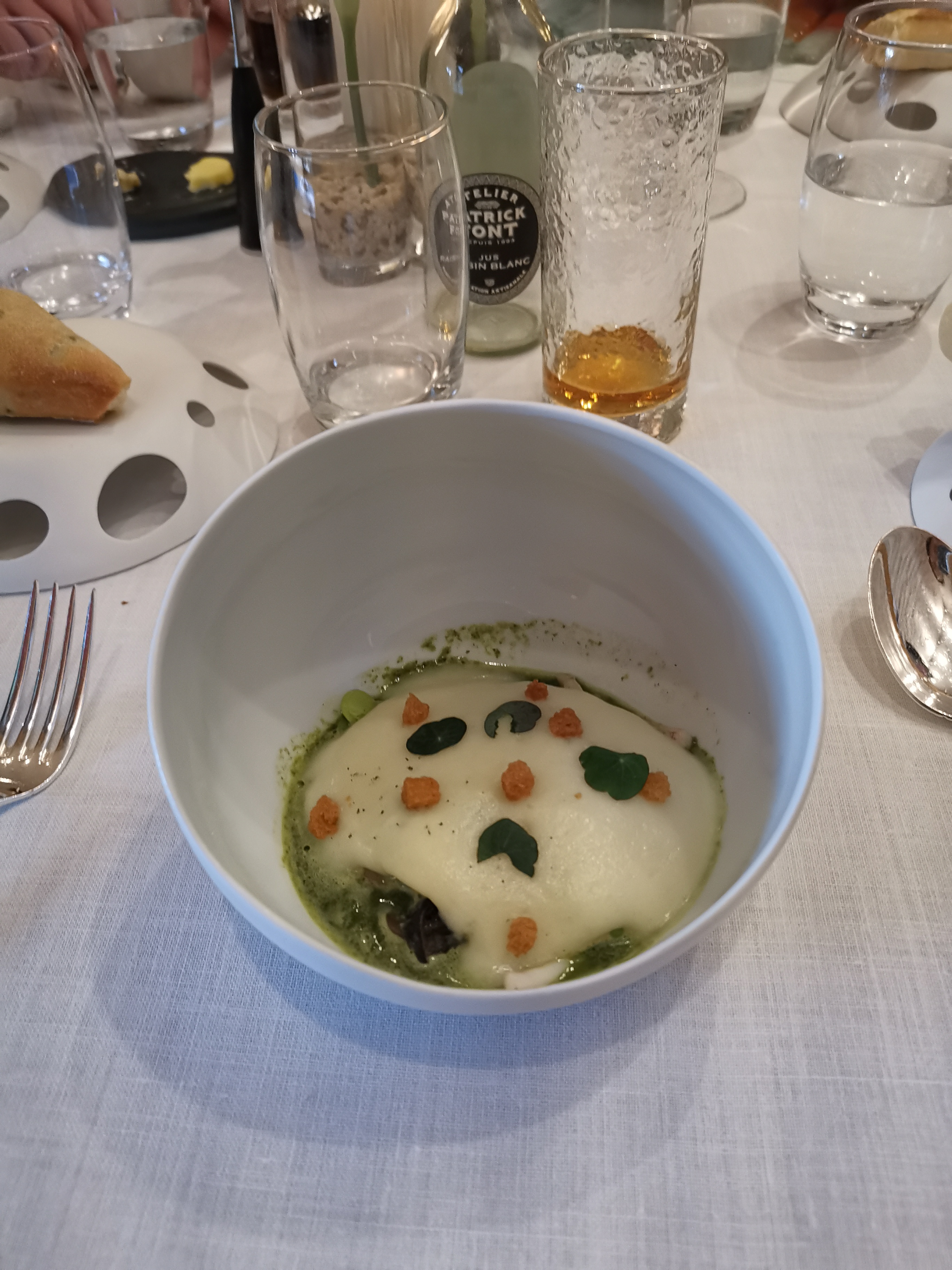 Bon repas. J'ai apprécié la mise en bouche. La vaisselle avec le gobelet aimanté, c'est ingénieux. L'entrée de tartare de canard, c'était une première pour moi et j'ai apprécié. Le plat avec l'agneau fondant et la fleur de courgette farcie, un délice. Cependant je n'ai pas vraiment apprécié l' Opéra chocolat, pas vraiment goûteux et la vaisselle utilisée m'a perturbé, je pensais que les traits droit étaient également du chocolat 😉. Beaucoup de bonnes surprises pour ma compagne qui avait pris la deuxième version du menu. Le plat avec le Bar était délicieux.