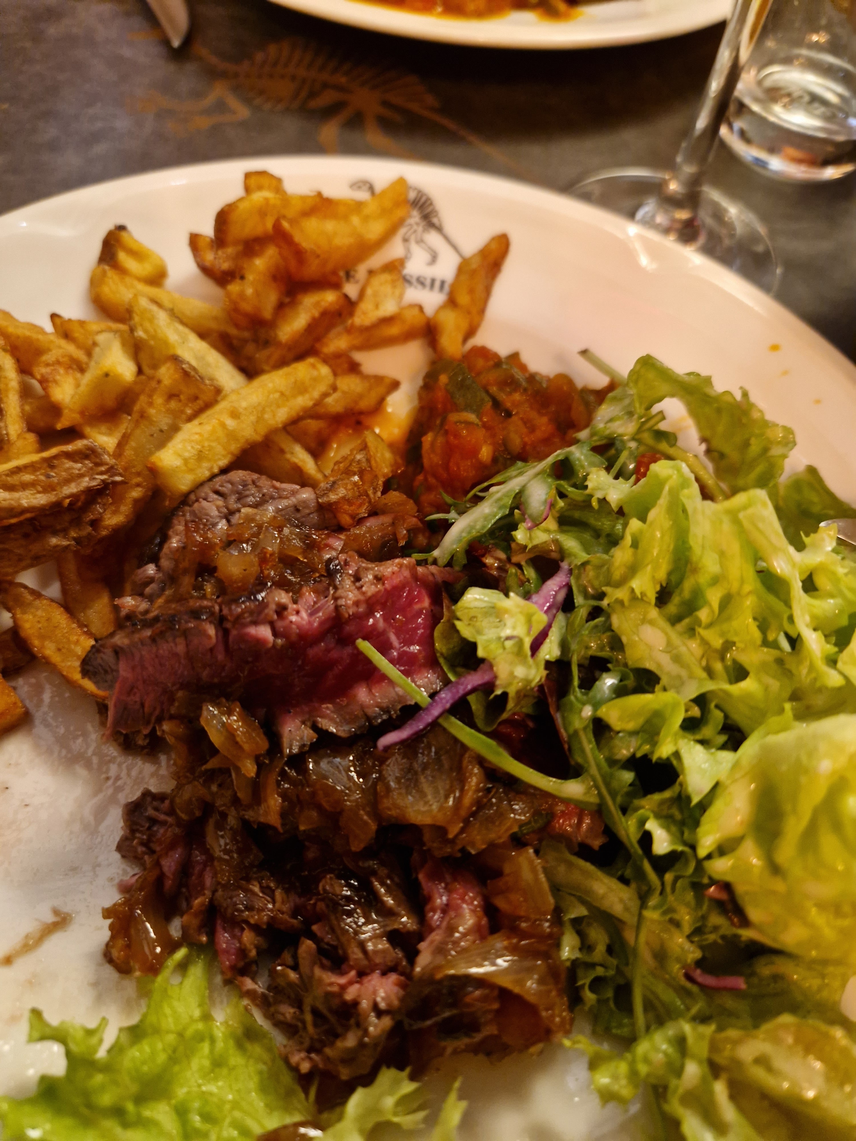 Dommage que les portions ont considérablement diminué.. !..pour tous les plats ! Onglet.. Ratatouille, un petit bol riquiqui pour 2 ! Frites noircies ?? On nous a dit que c'est la variété de pdt...🙃