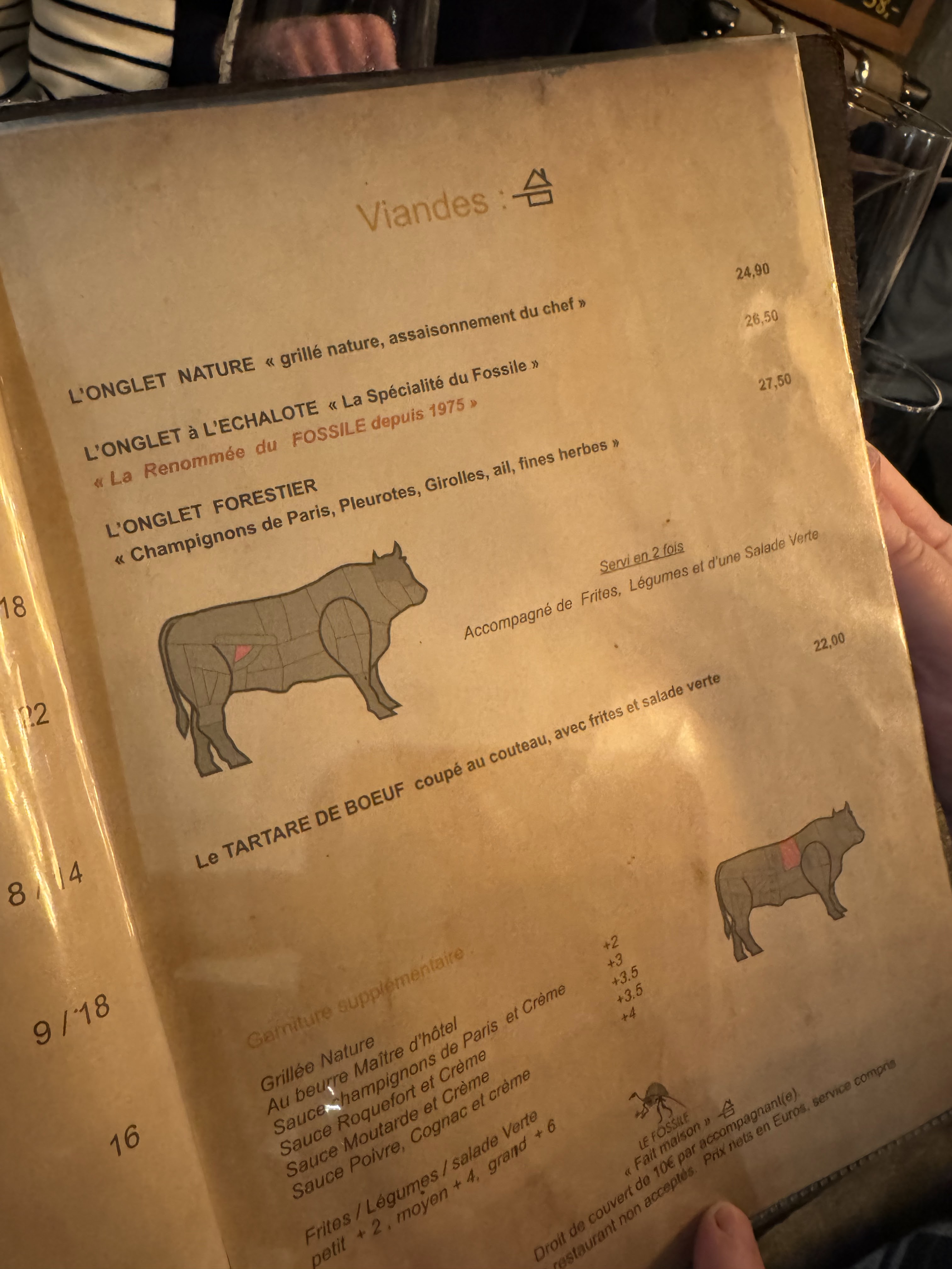 Le Fossile, une institution à Strasbourg. 40 ans des plus délicieux onglets à l’échalote. Mais c’est terminé. J’y ai mangé samedi avec des amis et c’était la dernière fois. Ce restaurant ne vit plus que sur ça réputation. Onglets ou tartare, la viande était de mauvaise qualité. Dommage :-(