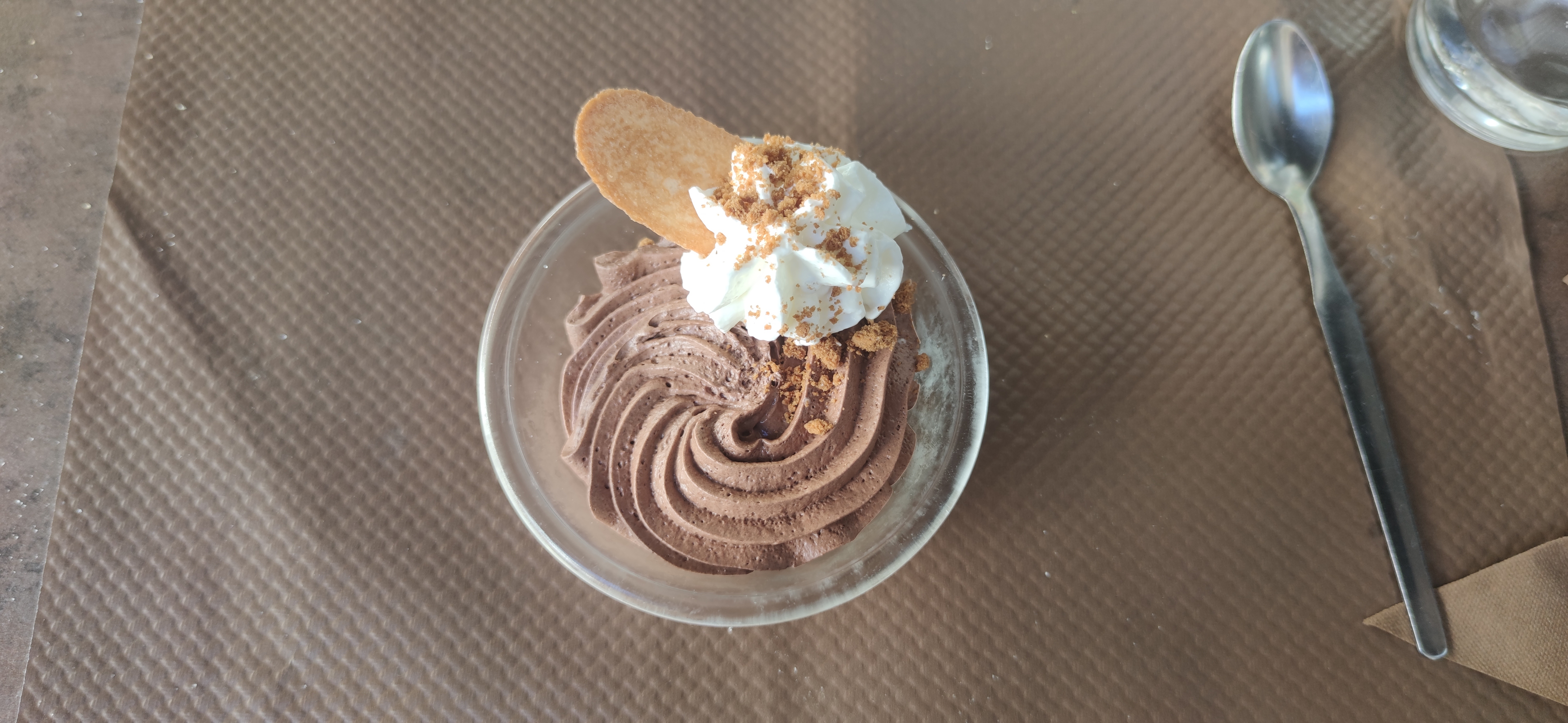 Menu à 22€ entrée + plat + dessert. Bon rapport qualité prix quantité. Équipe sympathique, patron chaleureux. Nous étions 3. En entrée nous avons tous prix un tiramisu au chèvre : sorte de mousse au chèvre sur un lit style bolognaise. Entrée jolie et bonne (16/20). En plat, nous avons pris une gardianne de taureau : la sauce était à tomber, une explosion de saveur. Nous avons adoré, résultat 18/20. Enfin, en dessert nous avons pris des mousses au chocolat maison... résultat, seule déception durant cette escapade... pour moi, il ne s'agit pas là d'une vraie mousse au chocolat. Elle manque terriblement de goût chocolat, de texture... pour moi il s'agit là d'une mousse recomposée et non d'une vraie faite maison... il y avait un nuage de Chantilly en bombe également. Le repas était super et j'ai été triste de terminer comme ça... quel dommage. Note de la mousse 4/20.