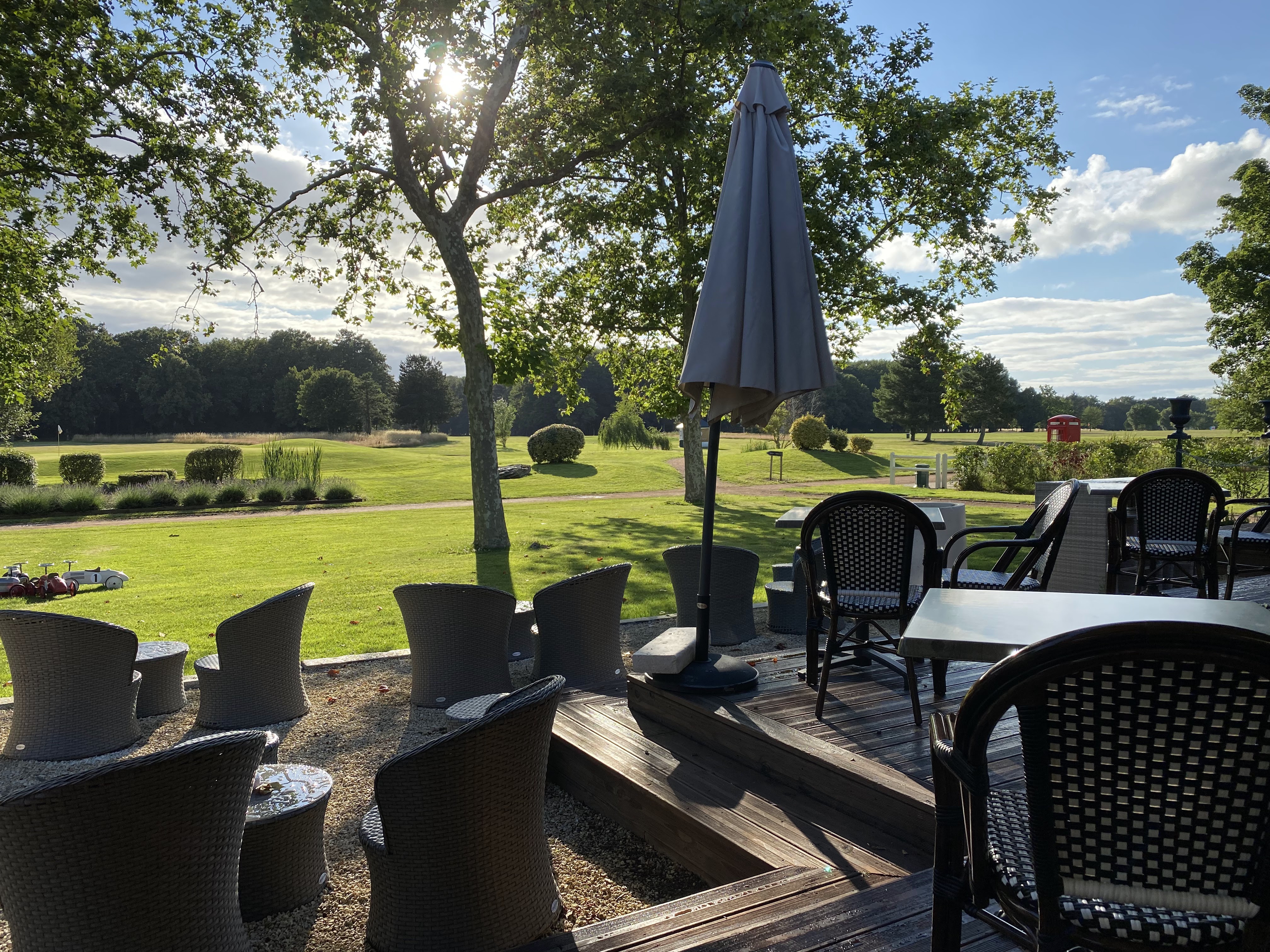 Joli cadre avec le golf Mais la terrasse semblait plus grande et les tables plus espacées sur les photos Nous avons été très déçu les plats type brasserie servis le midi. Il aura fallu réclamer la glace du menu enfant après avoir eu nos propres desserts. Et ma glace prise en dessert m'a été posé devant moi sans cuillère ni même mise sur une assiette.. un peu moyen comme service.
