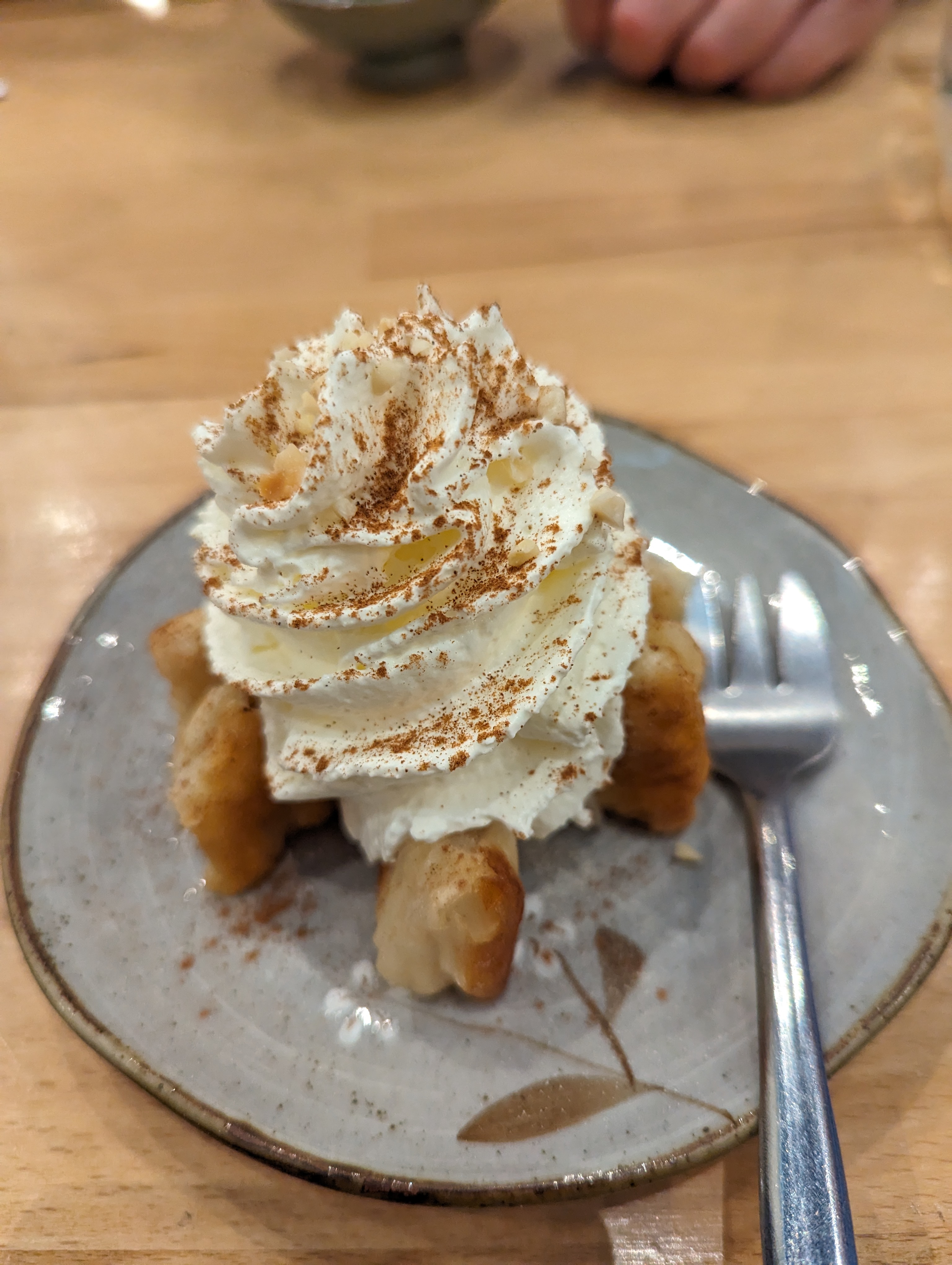 Cela faisait longtemps que ce restaurant figurait sur ma liste des restaurants à tester à Lyon. En effet, à chaque fois que j’avais tenté de m’y rendre il n’y avait pas de place, compte tenu du nombre de tables réduit à l’intérieur. Je conseille donc de réserver avant de vous y rendre 😇 J’ai adoré 🥰🇰🇷🥢 Le lieu est intimiste et les serveuses aimables et de bons conseils. Les galettes de kimchi étaient très bonnes et accessibles pour des personnes qui n’aiment pas lorsque ça pique trop 😌 J’ai mangé le plat du mois, composé de korean fried chicken, de riz, d’algues, d’œufs brouillés et de mayonnaise ; un délice 🥰 et très copieux en prime. Le dessert, des pancakes avec canelle et chantilly étaient très légers avec une quantité de canelle parfaite 🥞