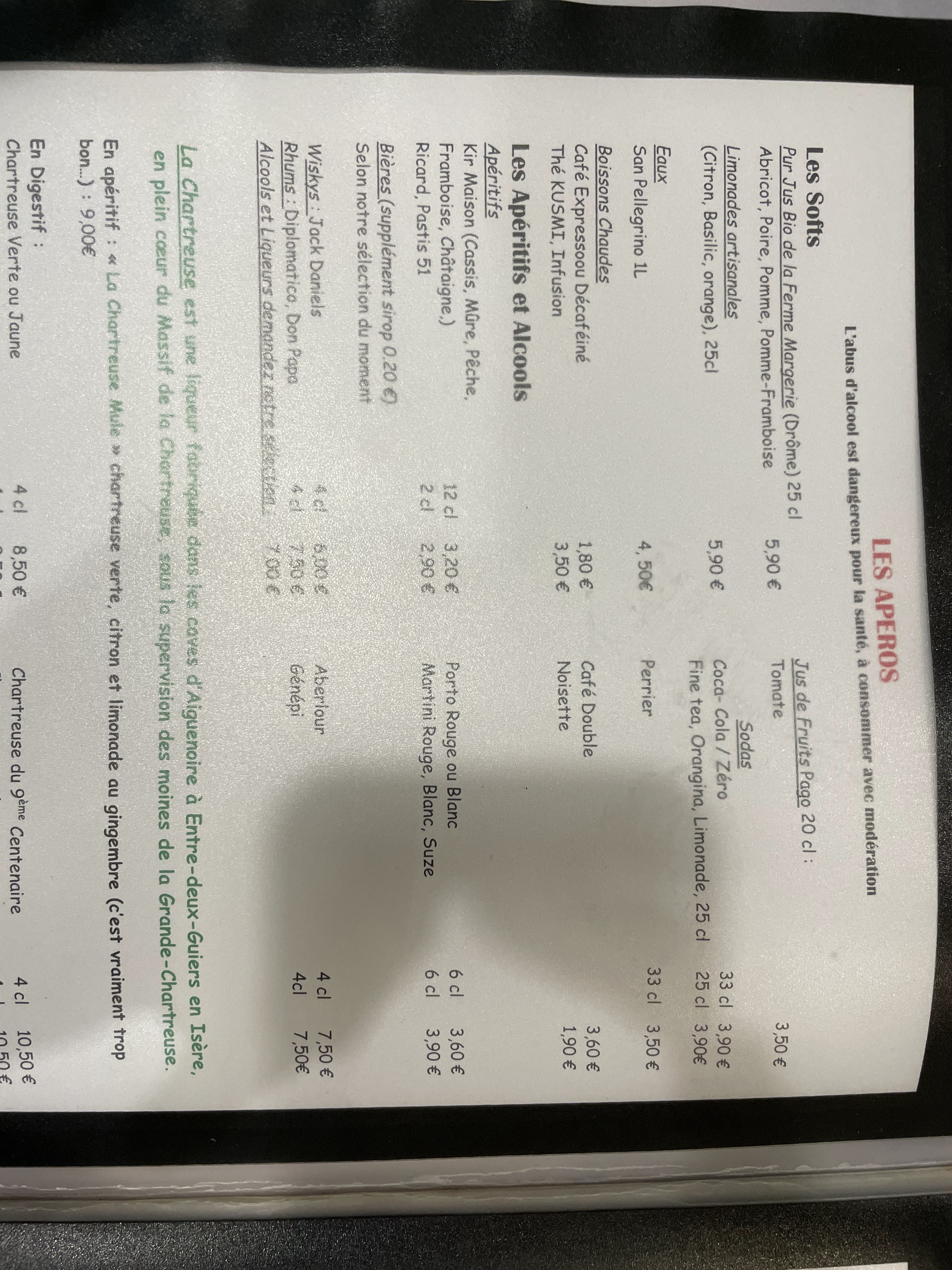 Un accueil assez froid ( présence d'enfants ?) heureusement la serveuse est plus aimable. Un gratin dauphinois traditionnel correct, par contre les accompagnements qui semblaient très alléchants charcuteries artisanales des Alpes ou planche de fromages des Alpes sont une très grande deception. Le jambon est luisant, les fromages insipides, à se demander si il ne manque pas le mot supermarché et si l intitulé ne devrait pas être charcuteries des supermarchés des Alpes. Bref, une déception.