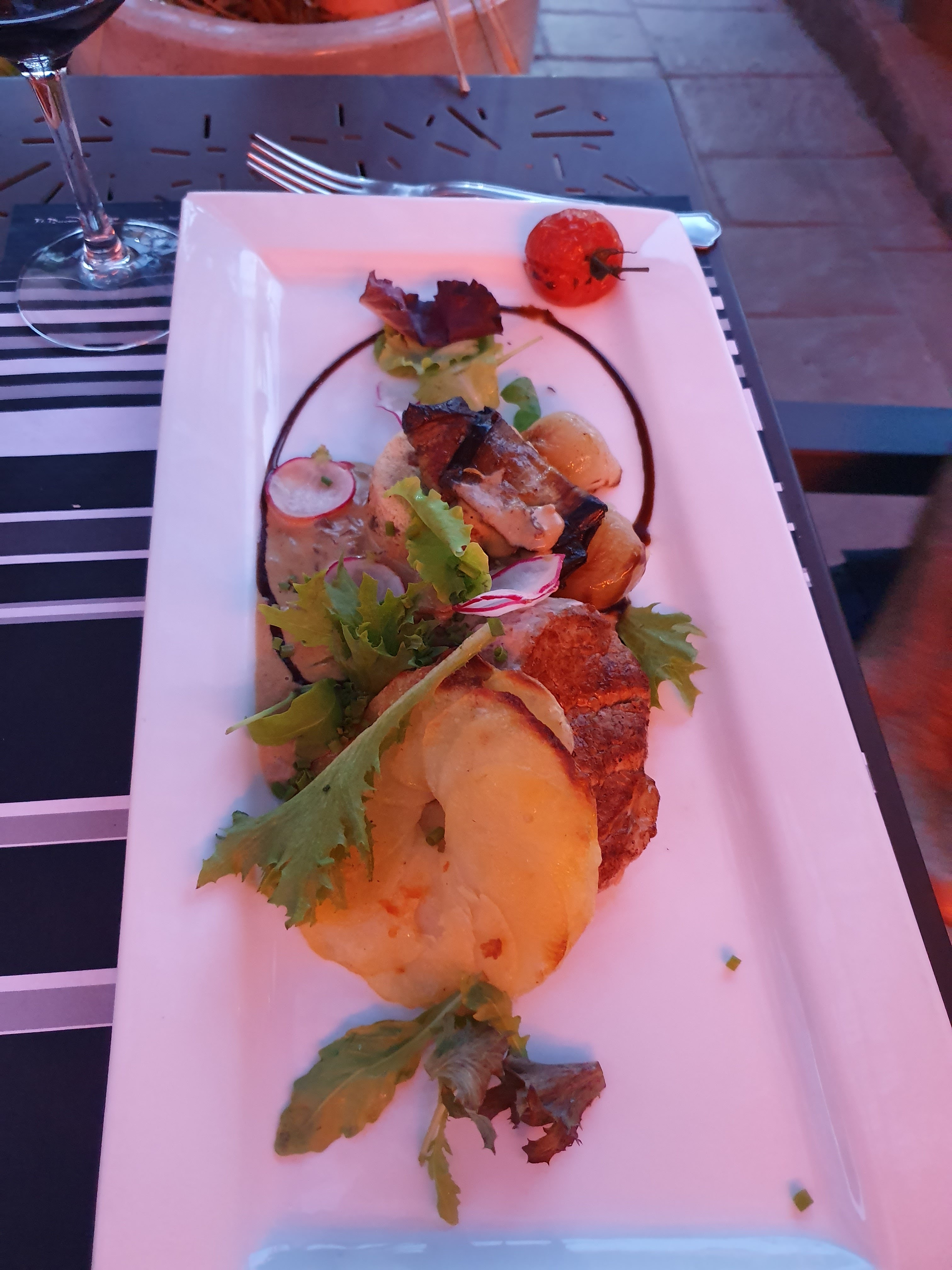 Relativement déçu par l'ensemble de mon repas. Oubli d'un élément central de mon entrée (le jambon Serrano). Je l'ai mangé pensant que j'avais mal lu la carte. J'en ai fait part a la serveuse, très aimable. Quelques minutes plus tard, je l'ai vu se diriger vers moi avec une assiette de jambon Serrano, sûrement pour rattraper le coup mais elle a été stoppé par les gérants qui ne l'ont pas laissé faire. Très déçu de voir que je n'ai sûrement pas été crue et d'avoir payé le prix fort d'une entrée incomplète. Ce n'est pas la meilleure expérience de mon séjour à Saint Laurent d'Aigouze, c'est certain !