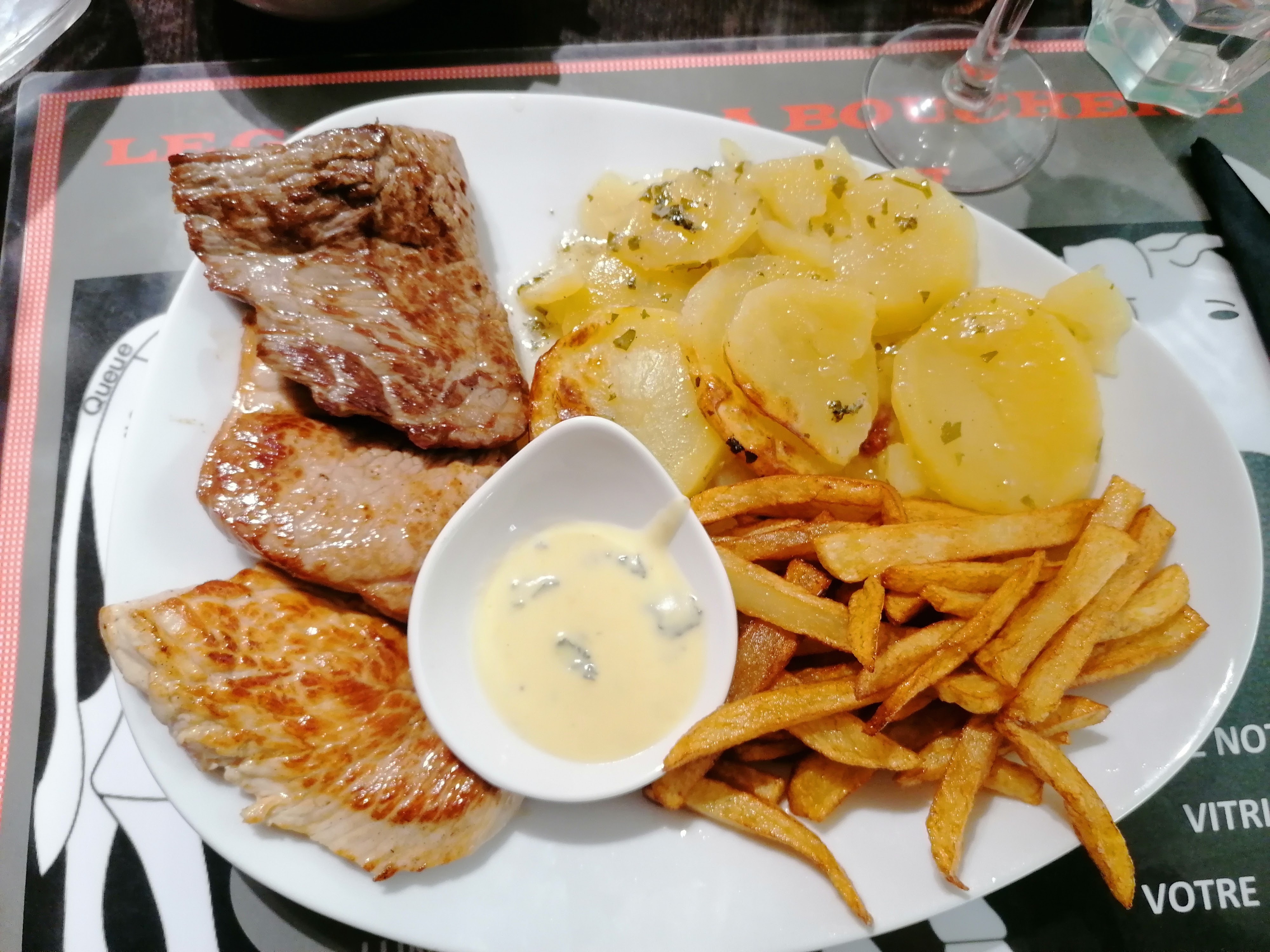 Excellent endroit... Repas très copieux.. Viande locale, dessert maison.. Addition 55,00 euros.. Deux plats trois viandes, bœuf, veau, agneau, avec frites maison et pommes de terre salardaises .. Deux desserts.. Un coca, une badoit 50cl, un café