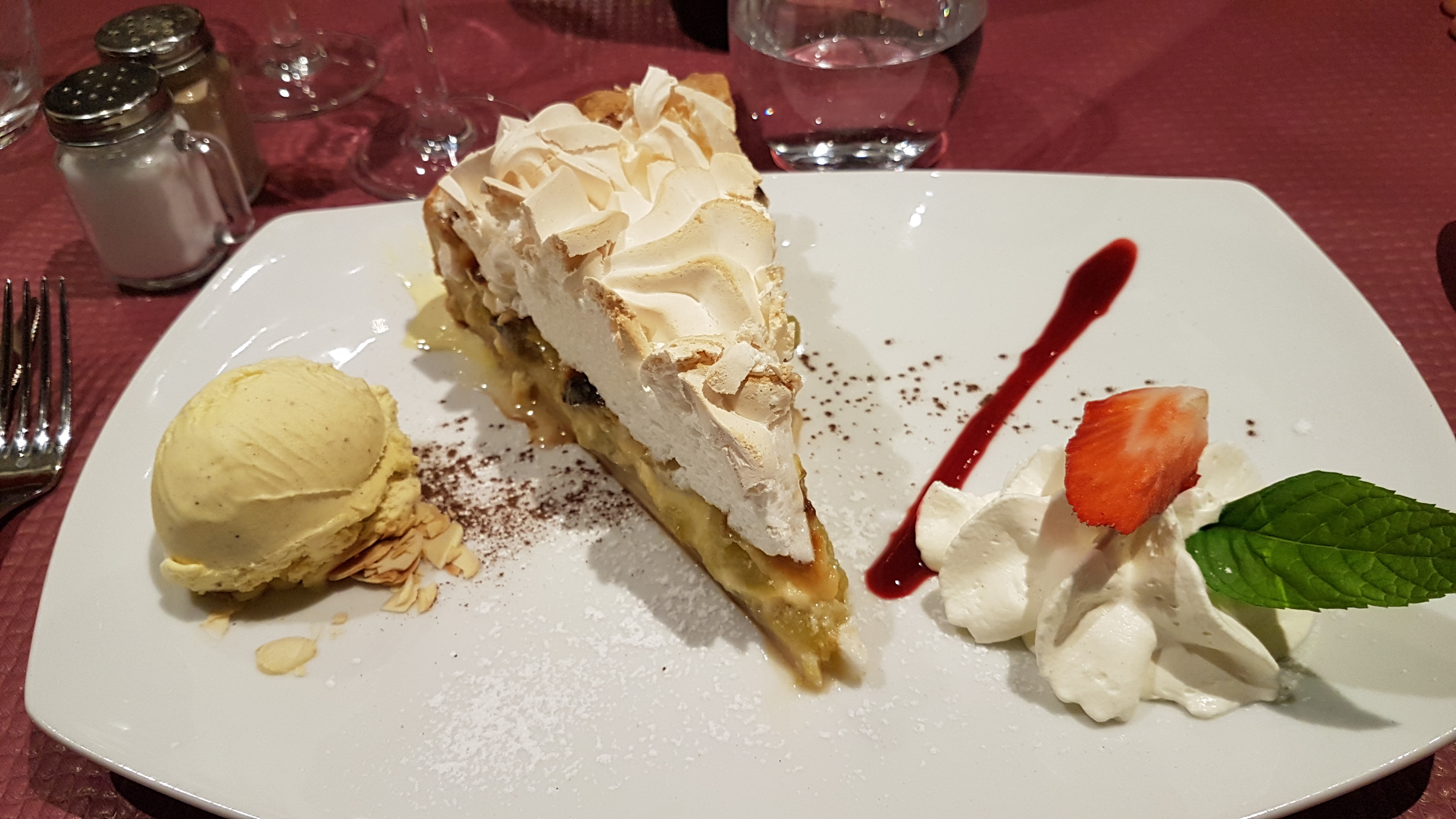 Nous avons pris le menu du jour, deux entrées bruchetta de saumon, deux escalopes viennoises avec des légumes (histoire de dire qu’il y en a) des frites qui sont arrivées cinq minutes après la viande et un pichet d’eau qu’il a fallut demander et qu’on a également dû attendre… un jus de pommes et un kir avec un quart de vin le tout pour 79,90€. Insipide et cher … le 1/4 de rouge à 16€… des frites pas cuites bref… déçus !!