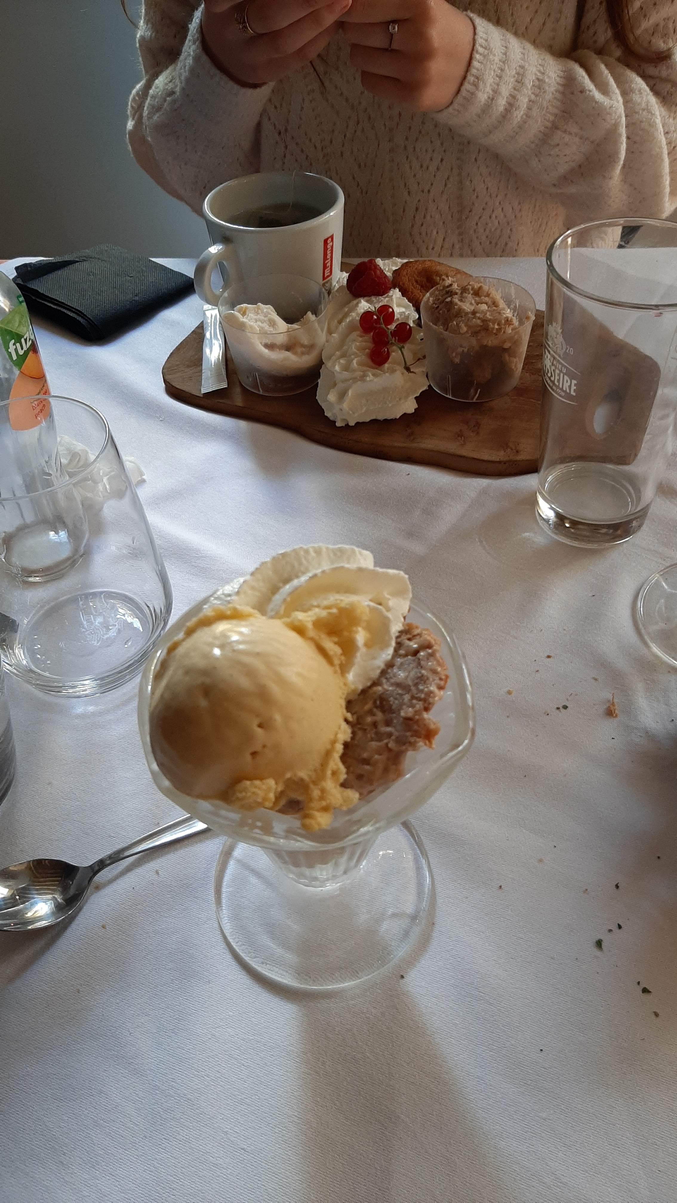 Attention le dessert même s'il porte le même nom est différent selon le prix du menu choisi vous n'avez pas le droit à la boule de glace pas très fair-play😞un pichet de cidre de 50 cl facturé près de 9 € un peu excessif pour un produit regional! Acceptable pour des touristes de passage