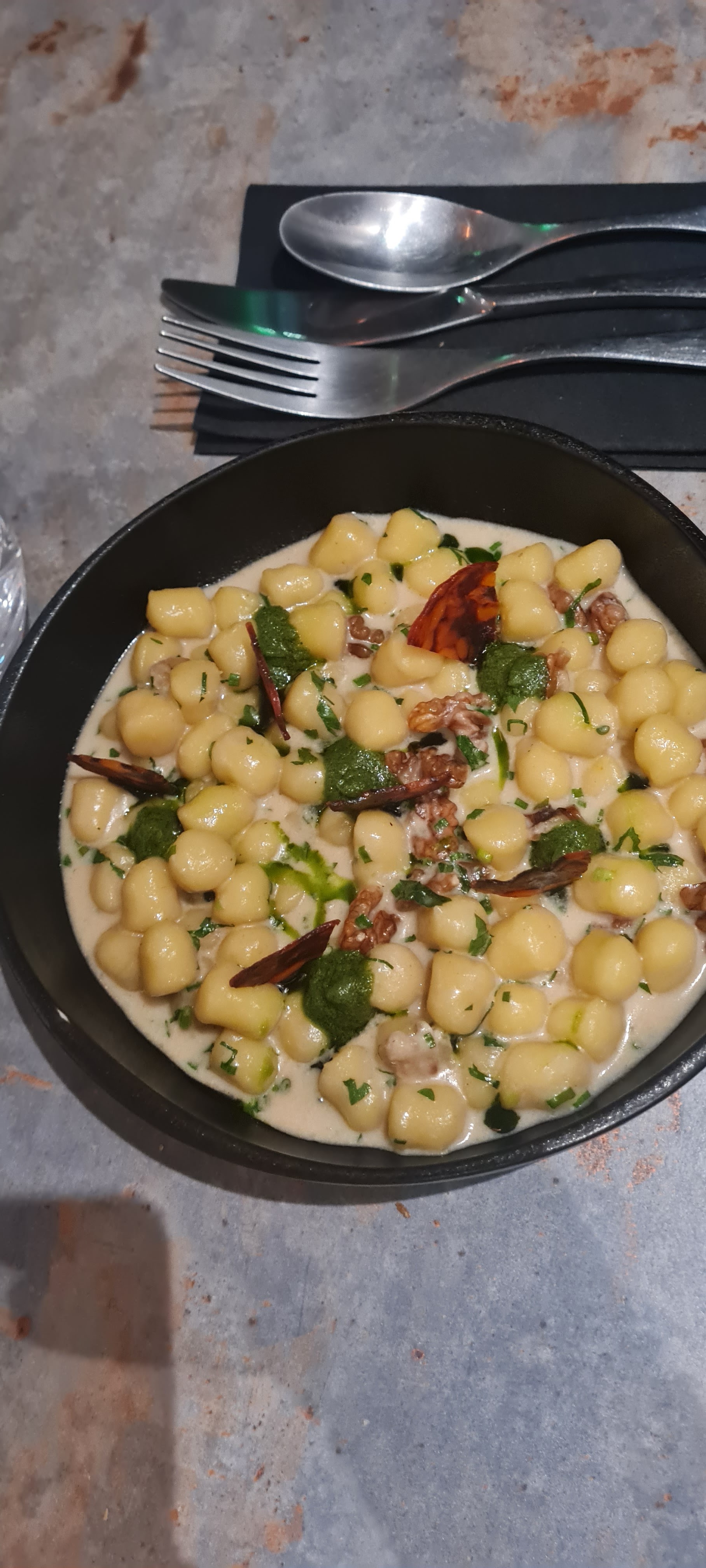 Le plat principal, les Gnocchettis, était particulièrement délicieux et ils l'ont gentiment préparé sans chorizo pour répondre à mes préférences alimentaires. La portion était généreuse et, même si j'étais assez rassasié, je me suis laissé aller et j'ai terminé le plat simplement parce que c'était très agréable. Le dessert, un Riz au lait a été une agréable surprise. Je m'attendais à un bon riz au lait savoureux, mais il s'est avéré non seulement délicieux, mais aussi très texturé et croquant. J'ai vraiment apprécié la taille du restaurant. On s'y sent bien, le service est excellent et les plats sont merveilleux. La prochaine fois que je serai à Juan-Les-Pins, j'y retournerai certainement.