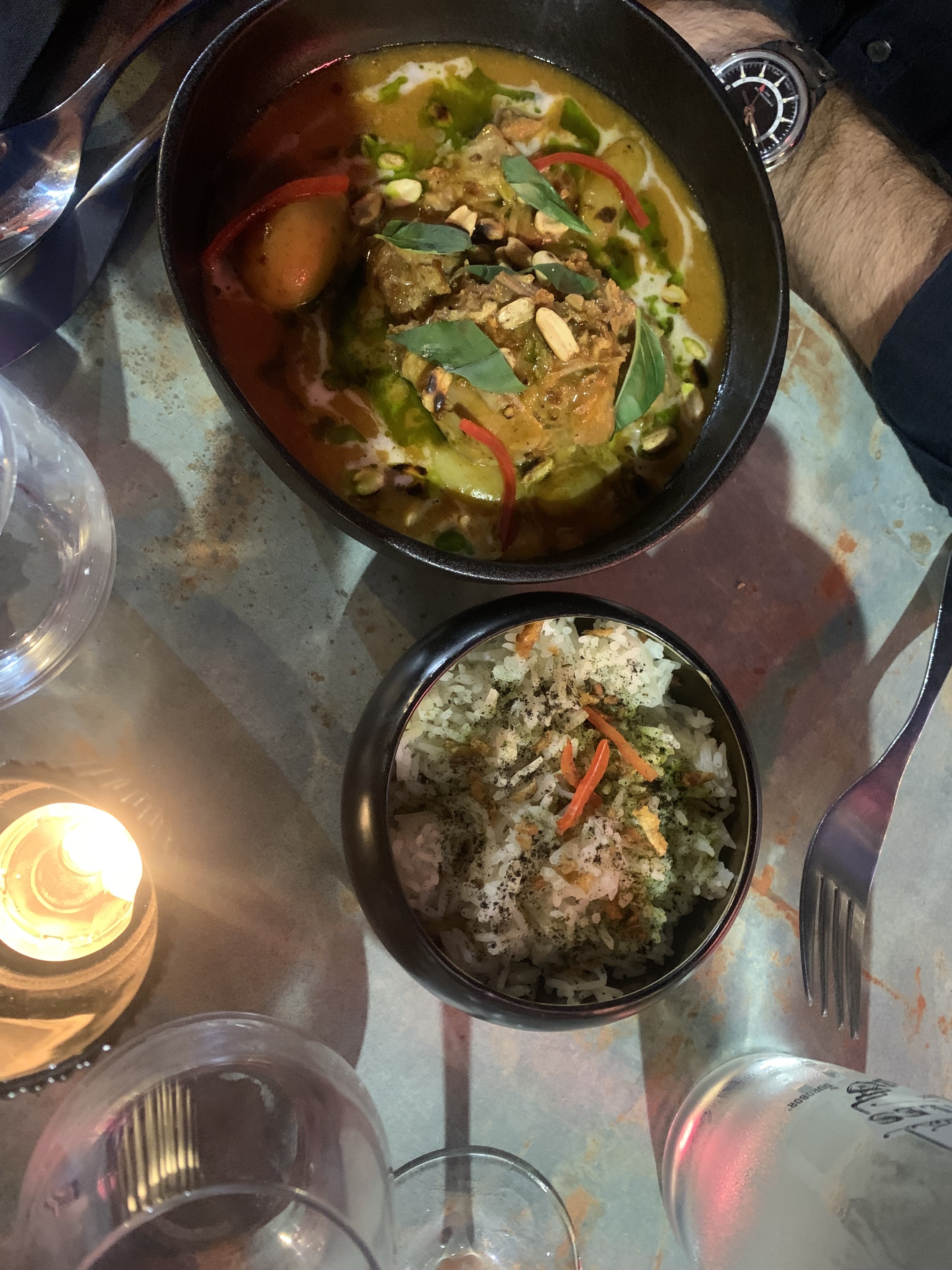 Bonne nourriture. surtout pour mon partenaire. mon plat principal de bœuf thaïlandais et de thon était bon mais pas incroyable. la dorade et les fleurs de courgettes frites étaient excellentes. .a besoin de plus de décorations et de musique..