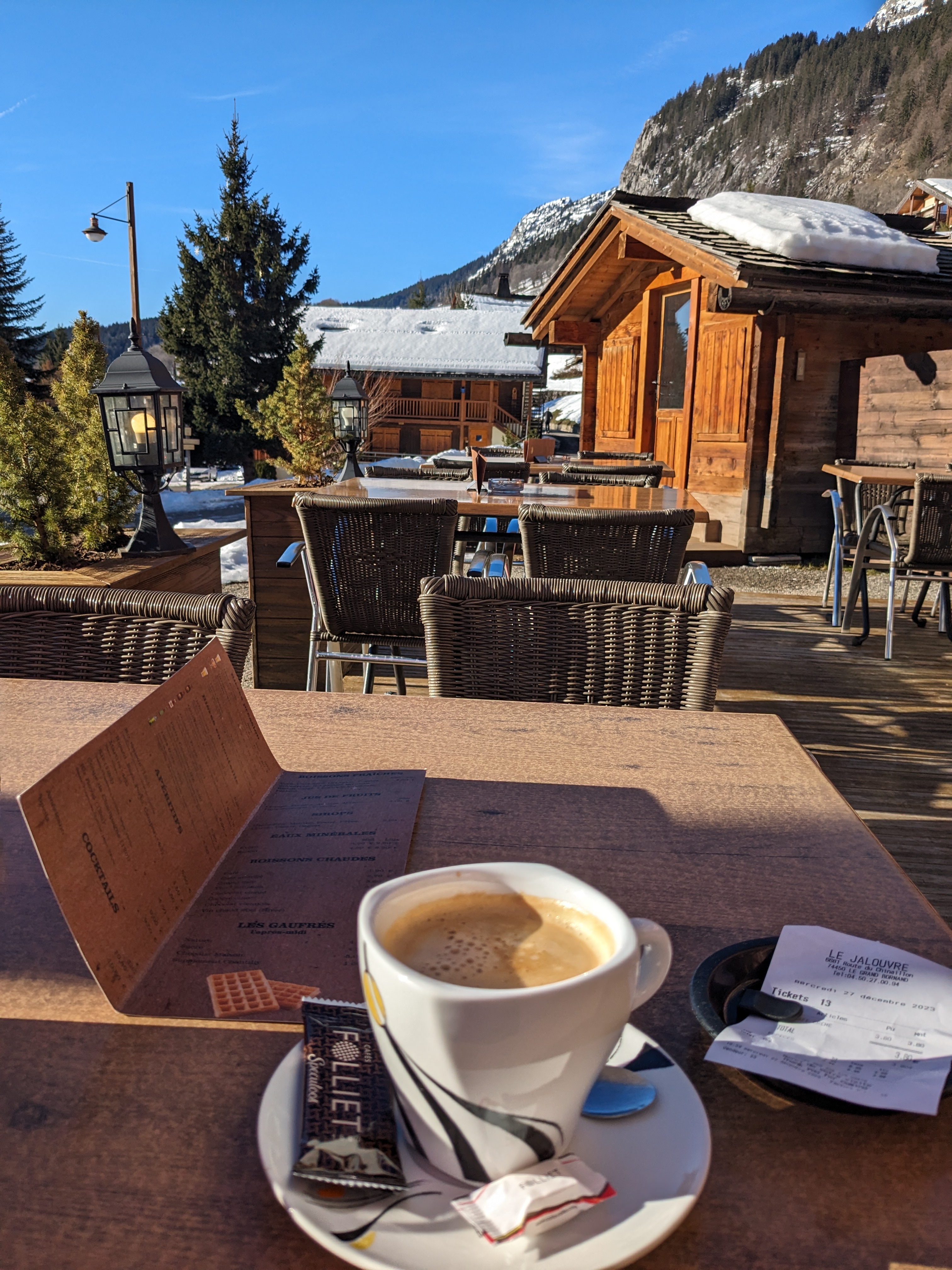 Parfait pour boire une boisson chaude avec une grande terrasse, bien placé au pied des montagnes et en Décembre quel plaisir de profiter d une terrasse au soleil