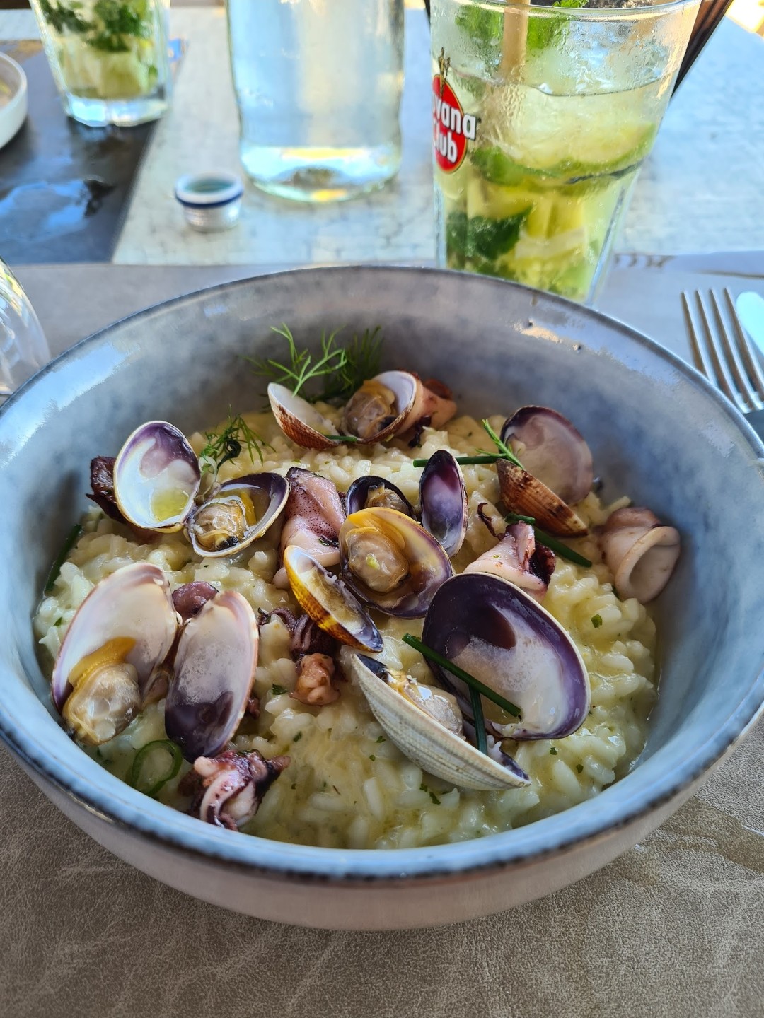 Très belle terrasse sous des pins impressionnants avec une superbe vue sur la mer et la petite baie. Nous avons vécu deux expériences complètement opposées en mangeant. Le pulpo grillé et la salade de thon étaient vraiment très bons. Les tagliatelles aux moules, tomates cerises et pesto ne l'étaient en revanche pas : les pâtes étaient si moelleuses et le plat entier était noyé dans la sauce huileuse au pesto. Je n'avais pas bon goût. 0 point pour ça.