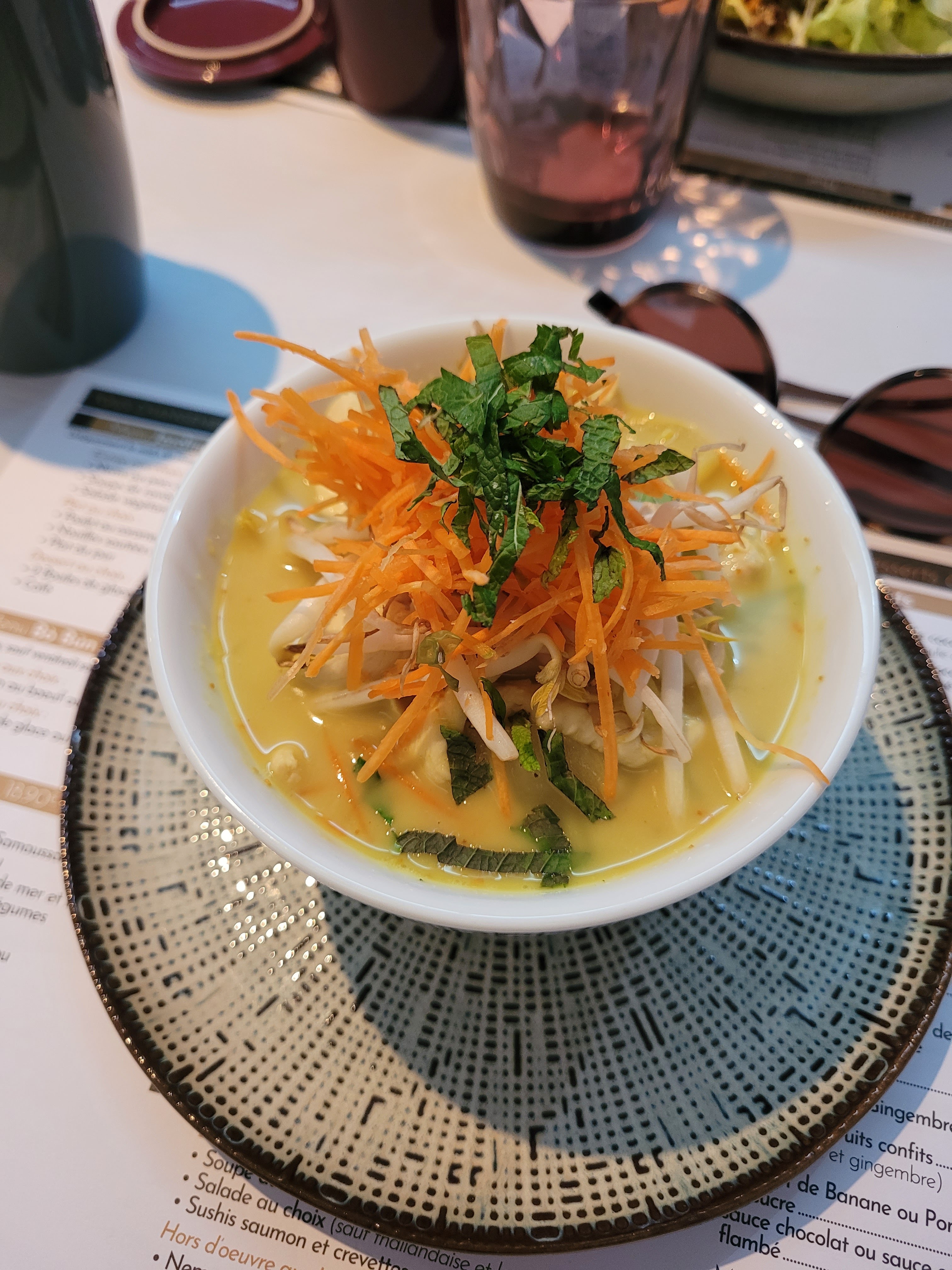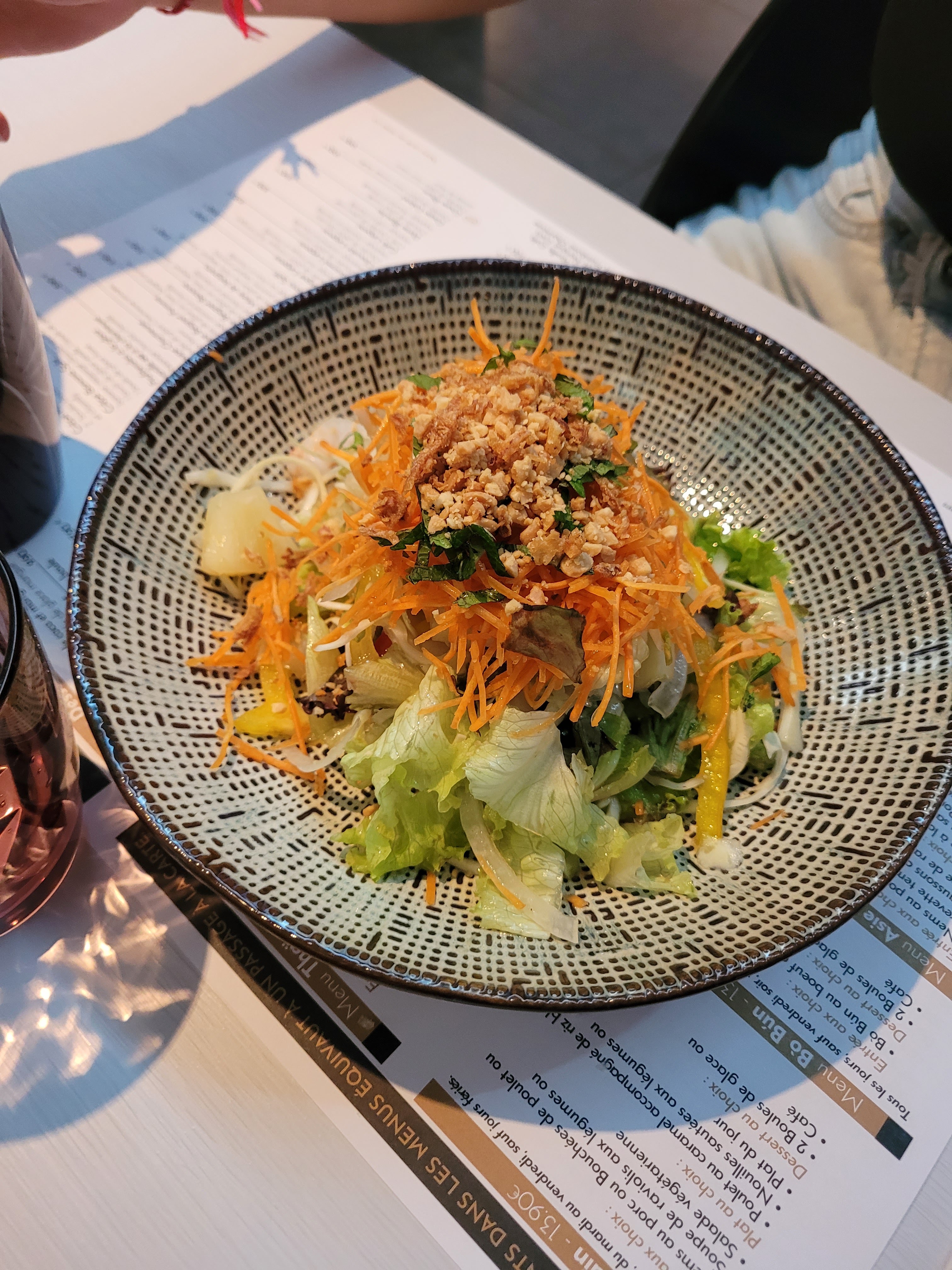 Le cadre est agréable et le service efficace. J'ai pris une soupe de ravioli aux légumes qui était très bon. Par contre j'ai été surprise de voir des tomates et des courgettes dans mon pad thai. Et effectivement, il avait malheureusement plus le goût de pâtes à la sauce tomate que de pad thai. Dommage