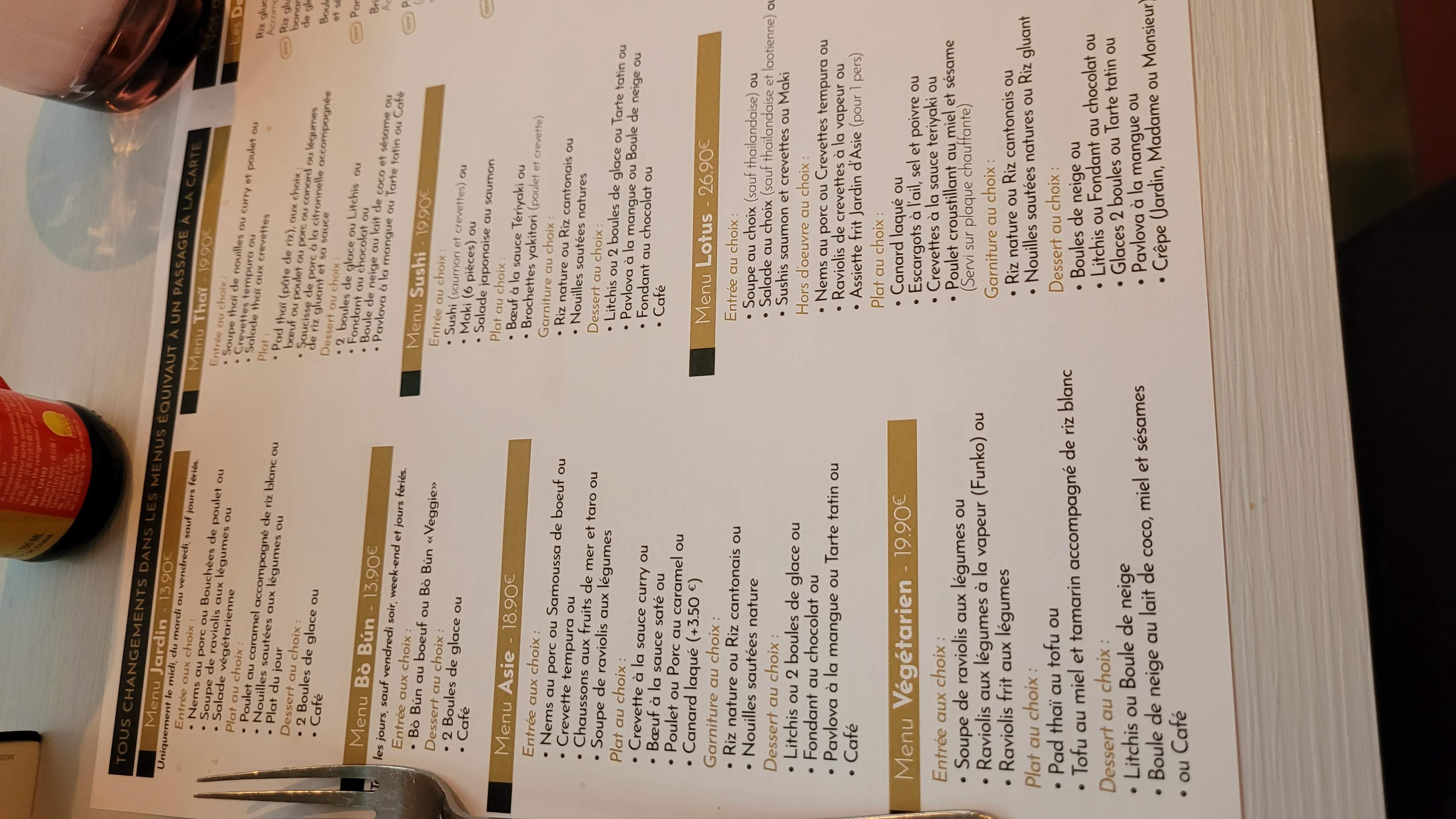Si vous avez envie d'évasion ne cherchez plus le jardin d Asie est l'endroit qu'il vous faut autant que pour son magnifique cadre que pour sa nourriture c'est une explosion de saveurs en bouche. Un accueil souriant et très professionnel pour un prix vraiment raisonnable . Je le recommande les yeux fermés