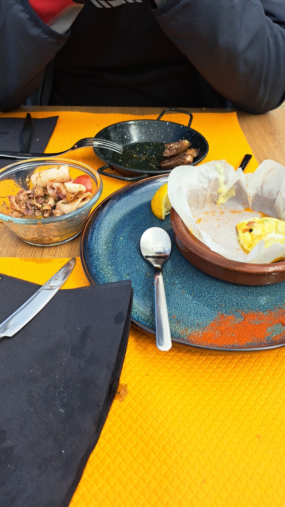 Nous venons de prendre cocktail, moule & chipirons et profiteroles pour finir. Nous sommes aux anges, tout est très bon et l’emplacement est top.