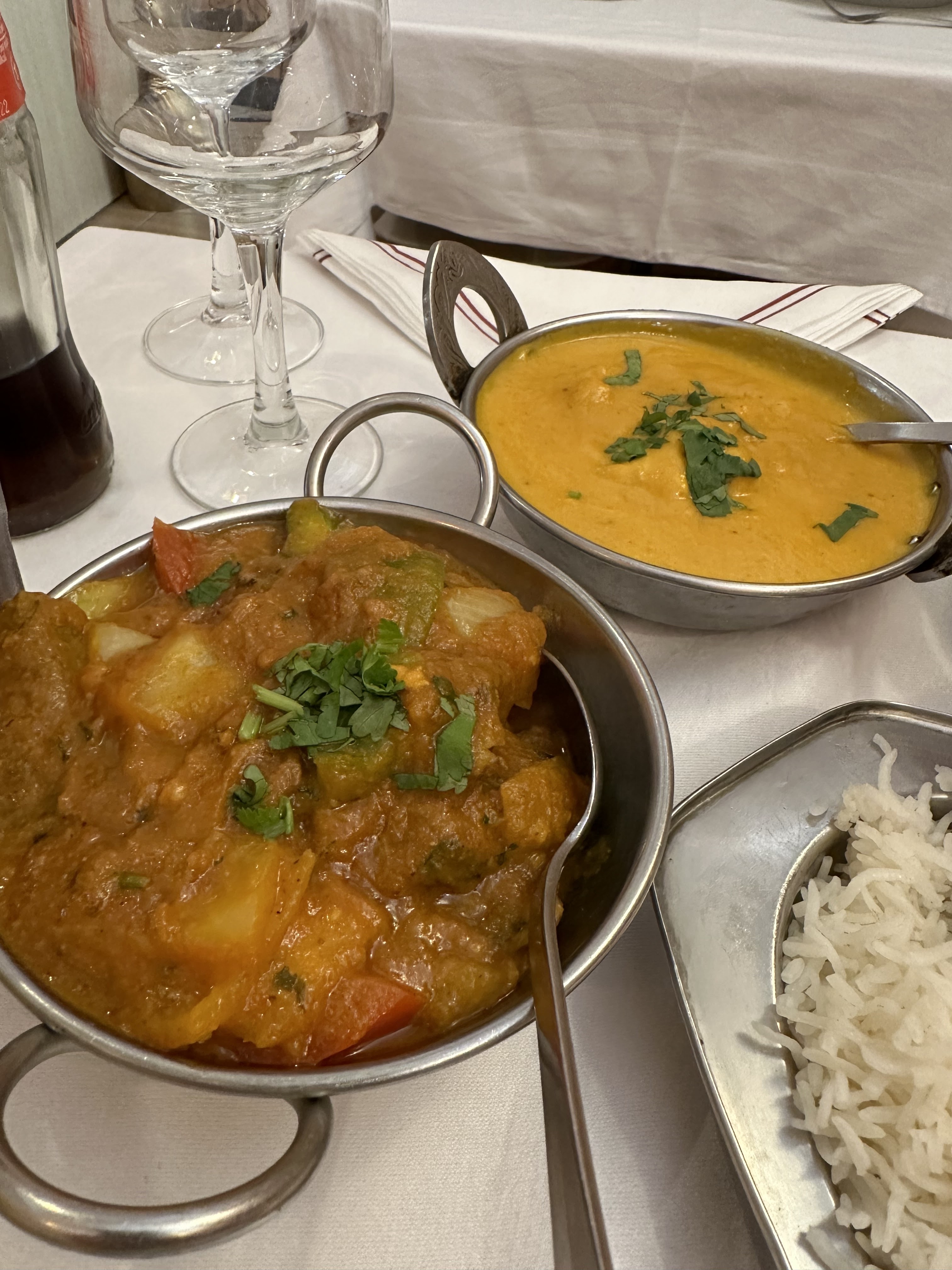 Nourriture excellente, j'ai pris les crevette vindaloo bien piquante à souhait, du riz champignons et un lassi mangue Si vous aimer de na nonne nourriture indienne, passez par ici !