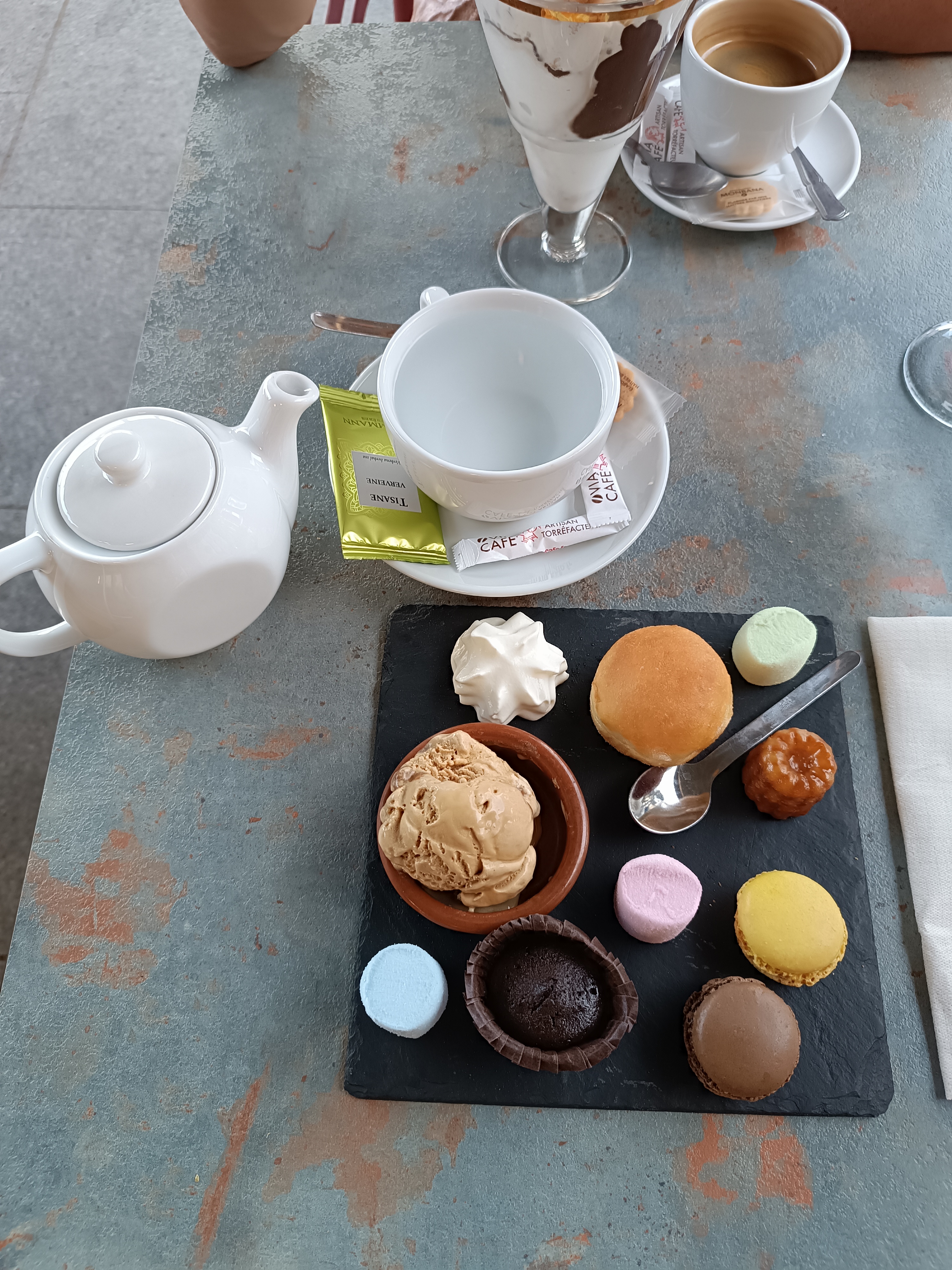 Nous avons pris un café gourmand (1 mini cannelé, 1 île flottante, 1 tiramisu spéculoos, 2 macarons et 1 boule de glace vanille) 9€ Et un Irish coffee (8 ou 9€) et un muscat (3.5€) Le tout étaient bon