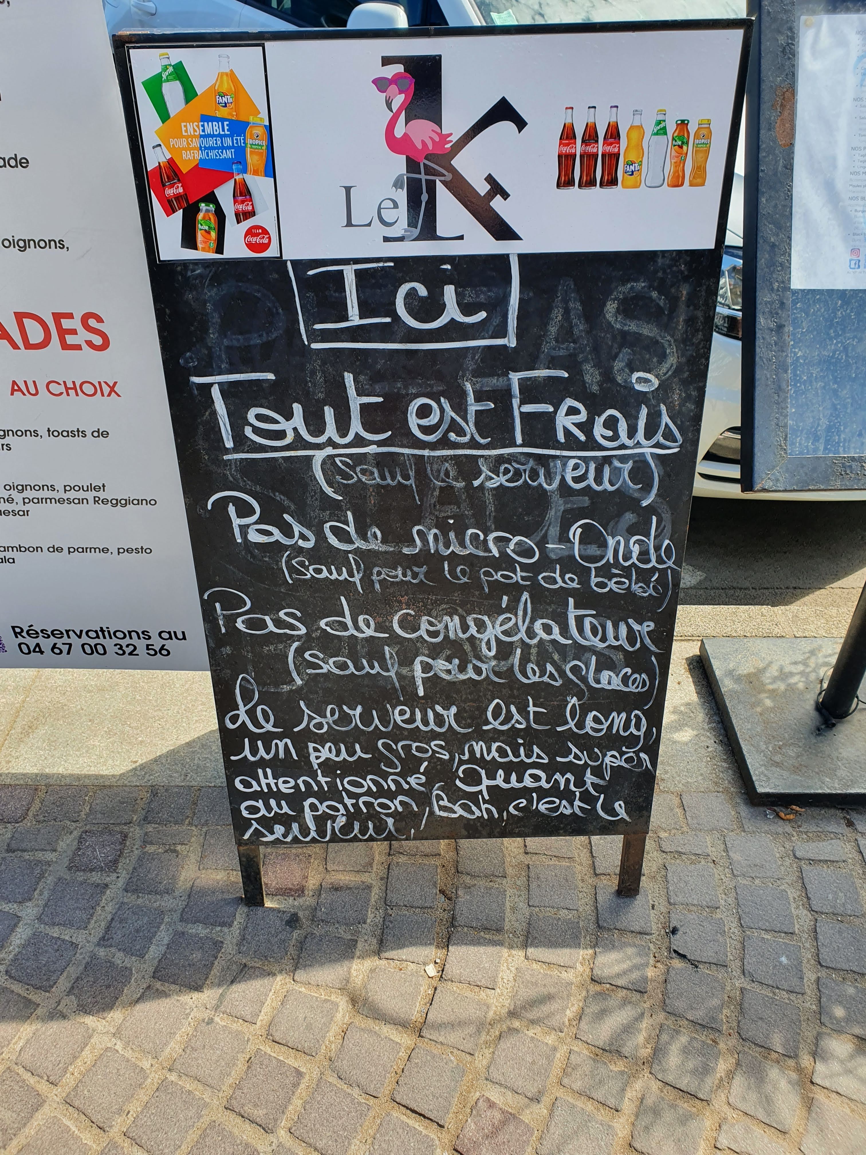 Menu sympa, assez varié: salades, viandes, poissons, pizzas, tapas. Pas de grande cuisine mais plats corrects pour des petits prix. Le personnel est vraiment sympathique, très souriant et attentif. Pour moi, ça compte autant que ce qu'il y a dans l'assiette. En ce début de saison, j'ai été bien inspirée de m'arrêter au KF pour dîner. Face à la plage (mais on ne la voit pas à cause des haies naturelles) avec une grande terrasse ombragée. Parking juste à côté, mais pas très grand. Endroit convivial. Le petit cocktail Flamant Rose est délicieux, un peu trop sucré à mon goût mais rafraîchissant.